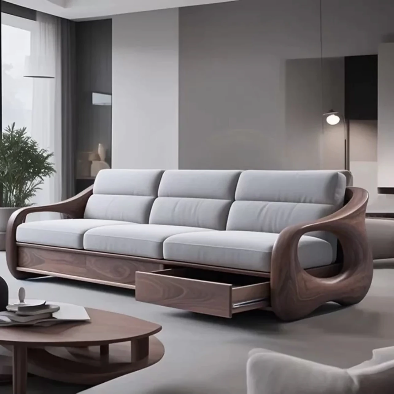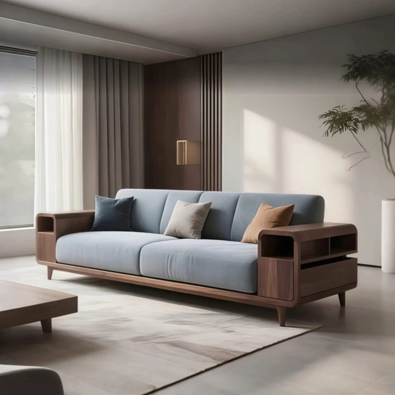 新中式スタイルのモダンでシンプルな高級感溢れるリビング用ファブリックソファ - 2025年新作、ウォールナット材使用!上質な居心地を提供し、あなたの空間を洗練された雰囲気に演出します。