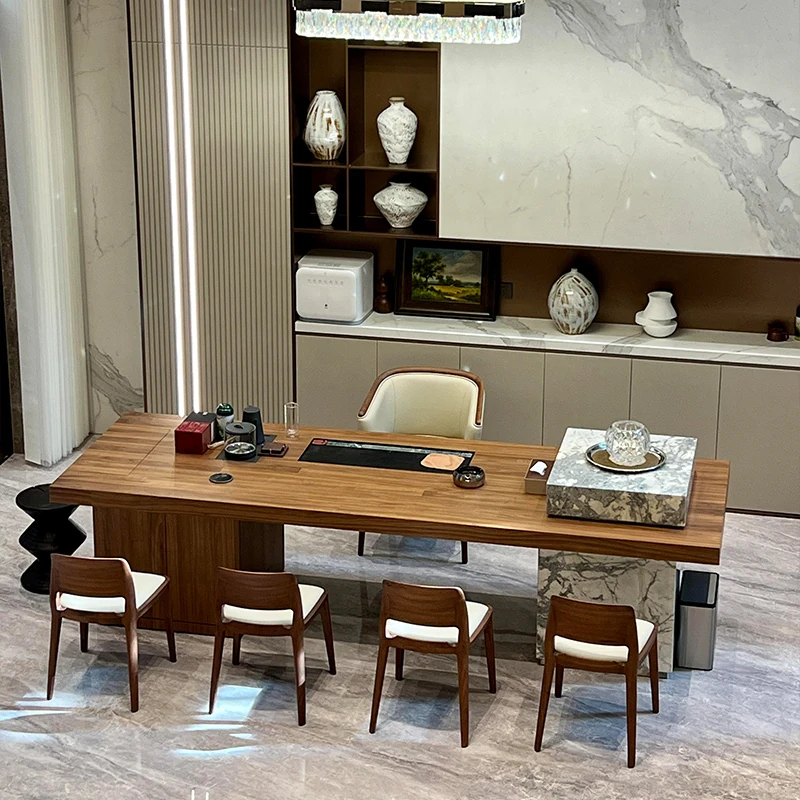 2025年新作!新中式岩板茶卓 - モダンでラグジュアリーな胡桃木使用、上質な雰囲気を漂わせる実木のティーテーブル。家庭用にもぴったりの洗練されたデザインで、優雅なひとときを演出します。