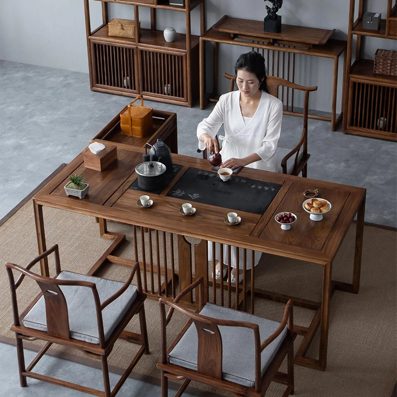 新中式スタイルの無垢材ティーテーブル&チェアセット - 北米産ブラックウォルナット使用、スペースにぴったりなミニマルデザインの家庭用ティーテーブル。おしゃれなティータイムを演出!