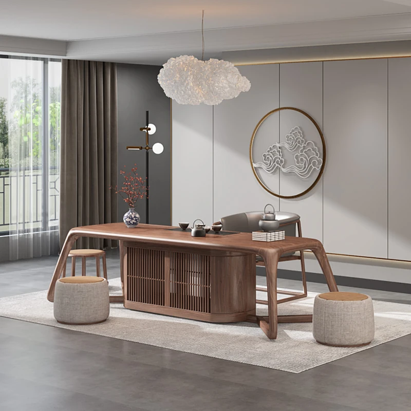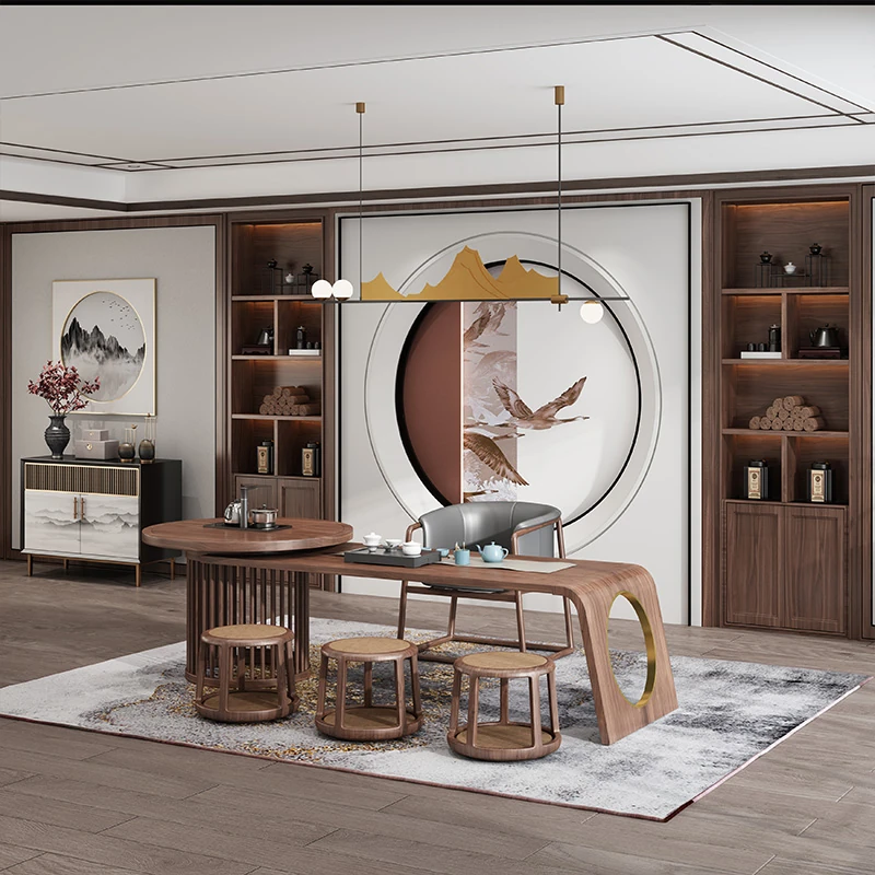 新中式デザイン!高級ブラックウォールナット製 茶テーブル&チェアセット - シンプルでモダンなオフィス用功夫茶台、心地よいティータイムを演出!