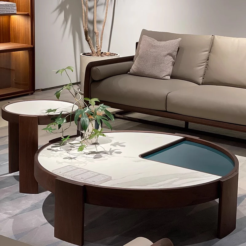 2025年新作!小型住宅向けラウンド岩板コーヒーテーブル、リビングルームに最適なラグジュアリー感溢れるウォールナット角テーブル。モダンでスタイリッシュなデザイン、空間を美しく演出します!