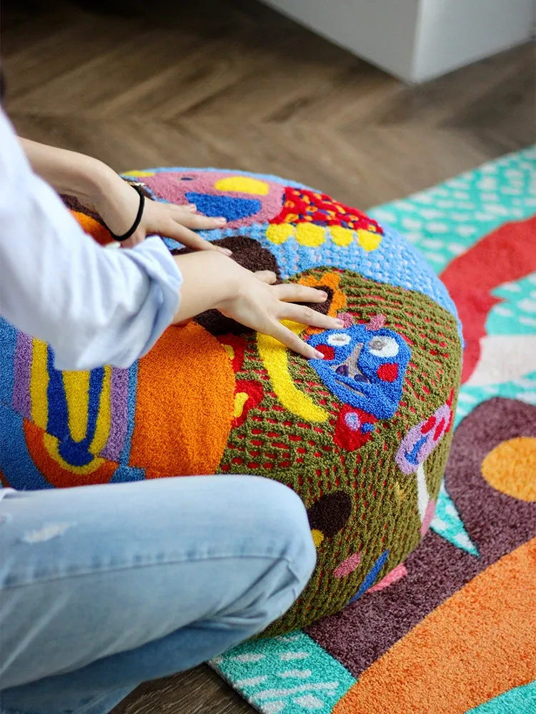 若奈アーティスト|マイおばさんの「レインボーイヤー」ウール立体刺繍 子供用クッション 座布団 洗えるソフトスツール
