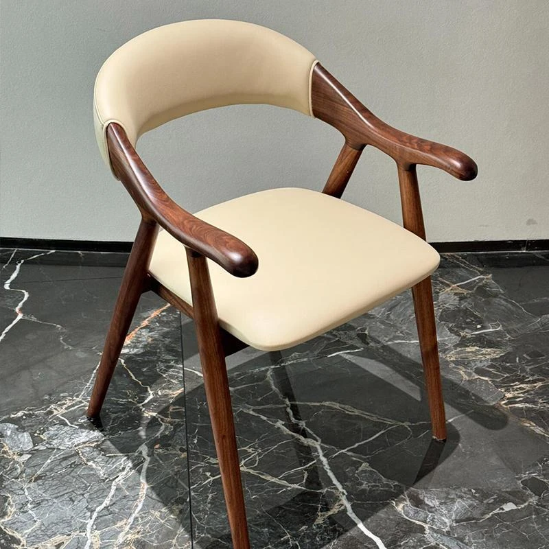 Elegant New Chinese Black Walnut Dining Chair with Leather Armrests - Perfect for Home, Hotels, and Model Rooms. Stylish Solid Wood Backrest for Comfortable Conversations.