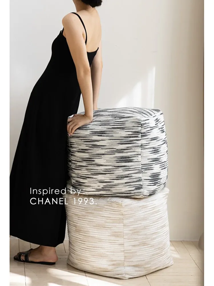 Rona Indian Collection! Removable and Washable Popcorn Ottoman - CHANEL Style Tweed in Oatmeal Color for Living Room Footstool and Low Bench