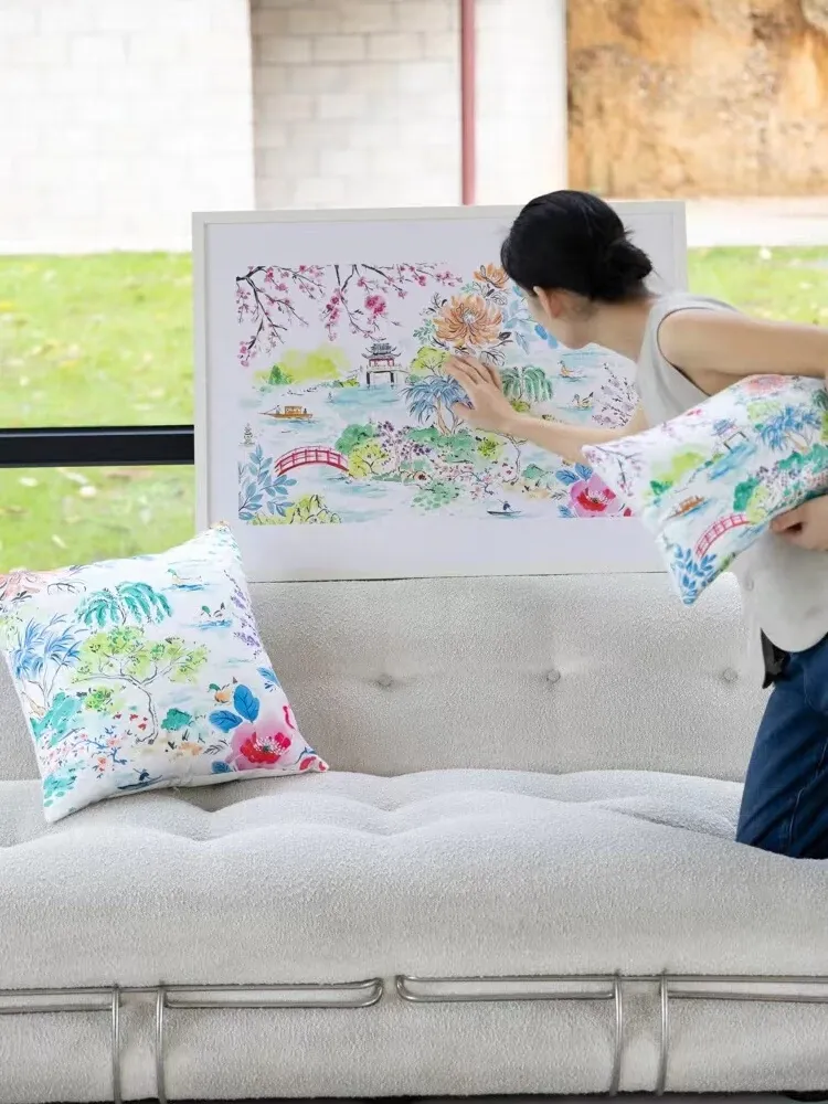 Yuna Embroidered Film Pillow / "Spring in Jiangnan" Silk-Satin Lumbar Support Pillow - Luxurious Comfort for Your Home Decor