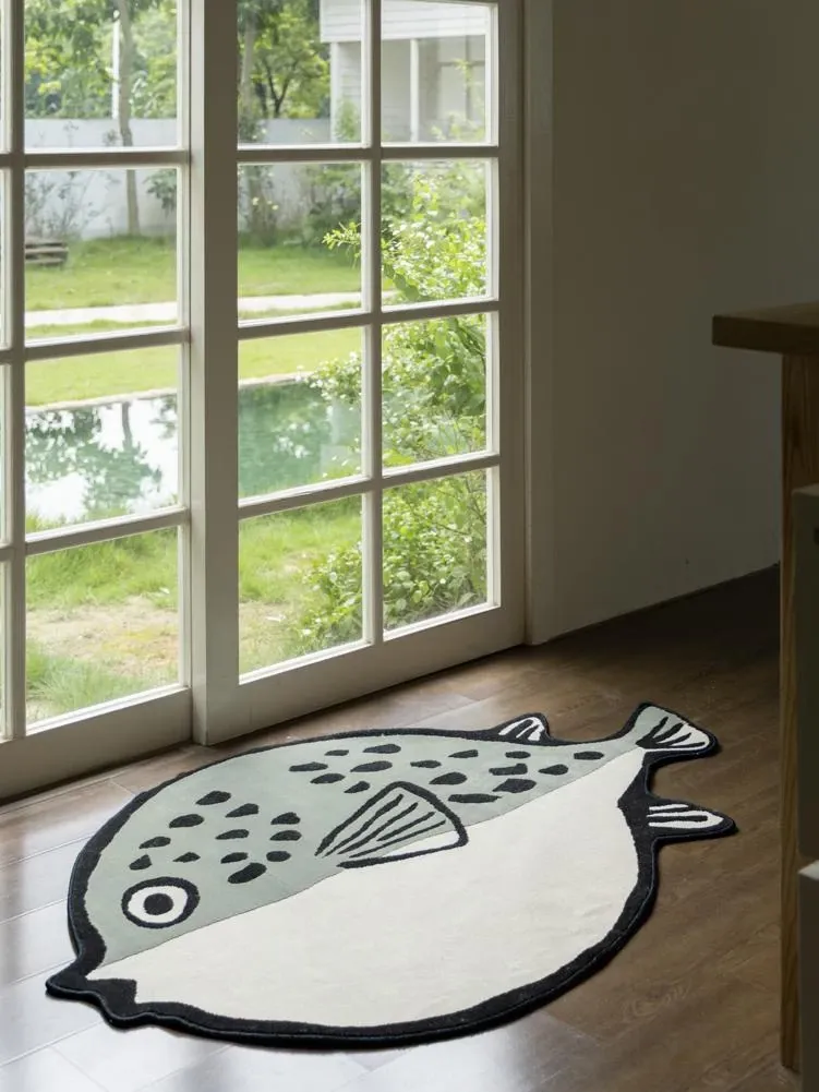 "Washable 'Little Lucky Puffer' Designer Pufferfish Rug - Kyoto-Inspired Creative Non-Adhesive Carpet for Kids' Bedside"
