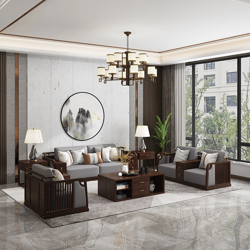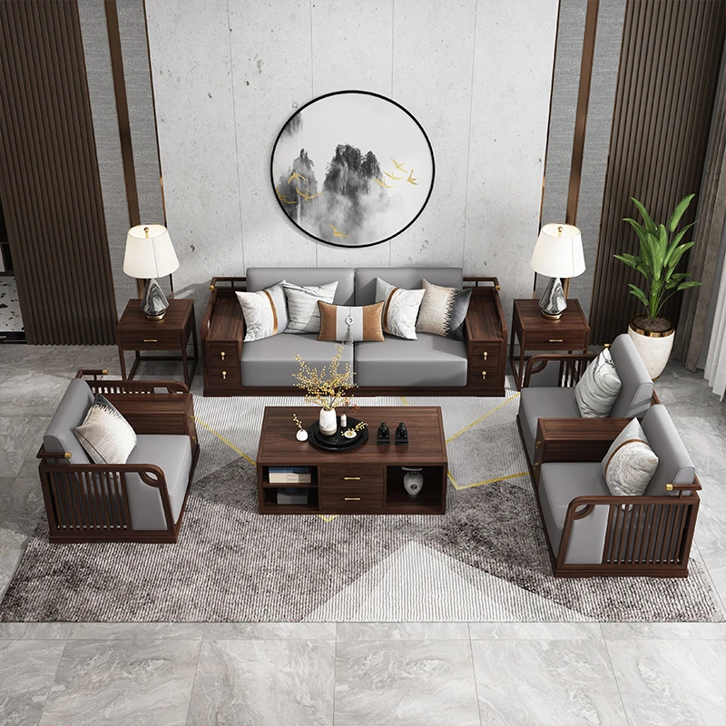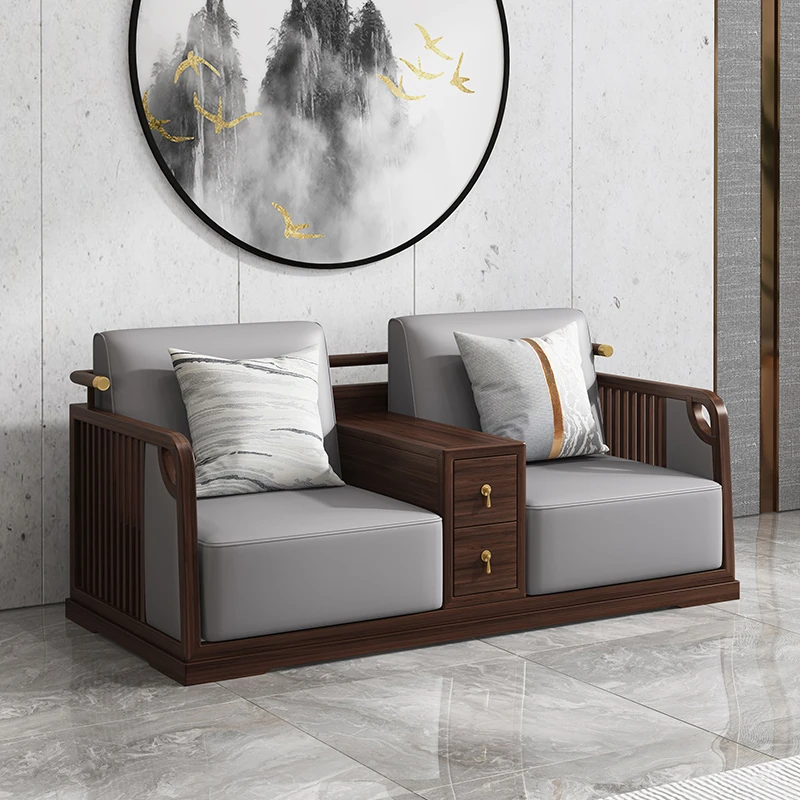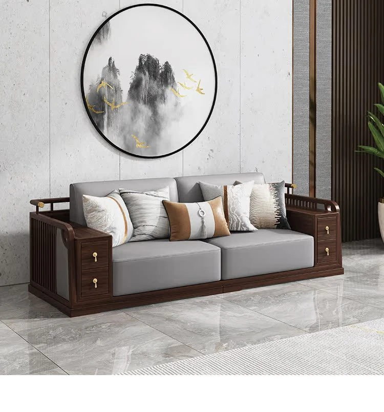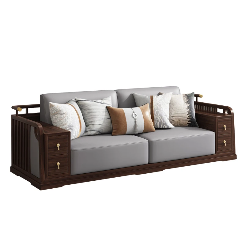 2025 New Luxury Modern Chinese Leather Sofa - Minimalist Solid Wood Design for Villas, Featuring Elegant Black Walnut Finish for a Touch of Sophistication in Your Living Room.