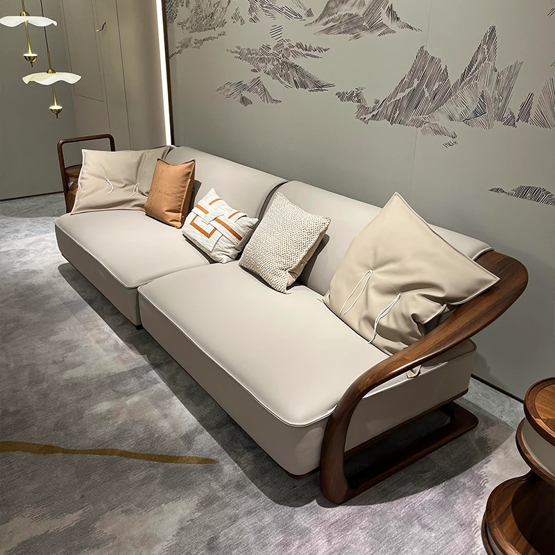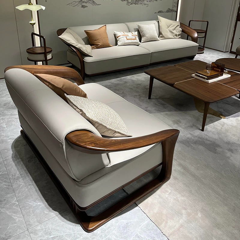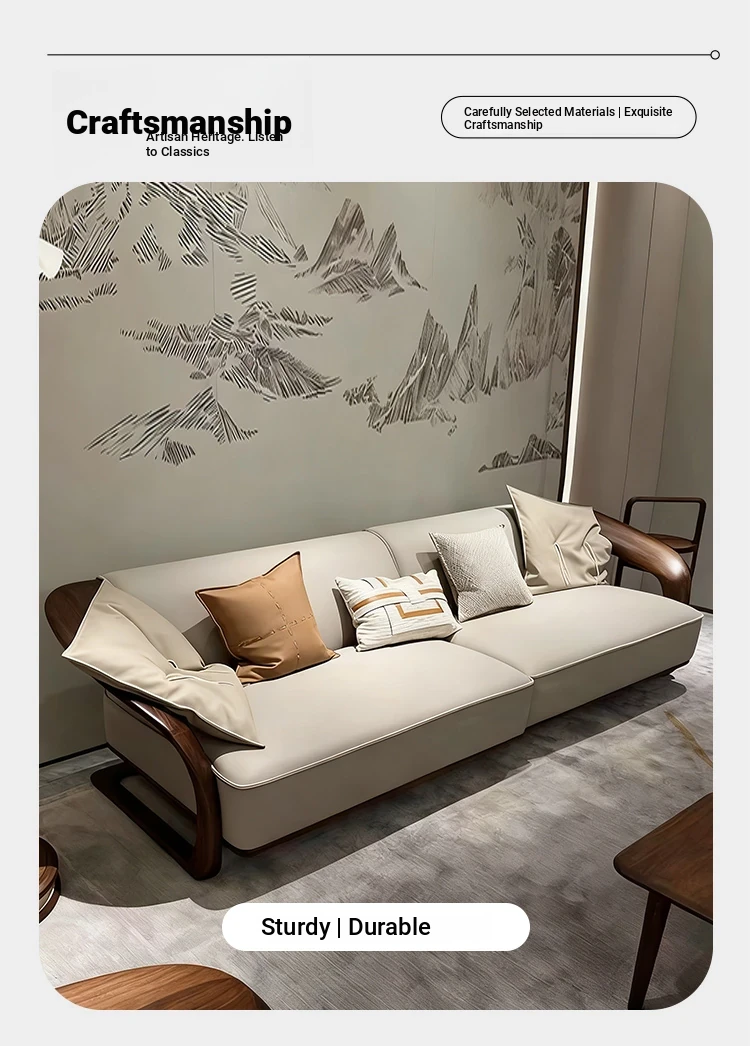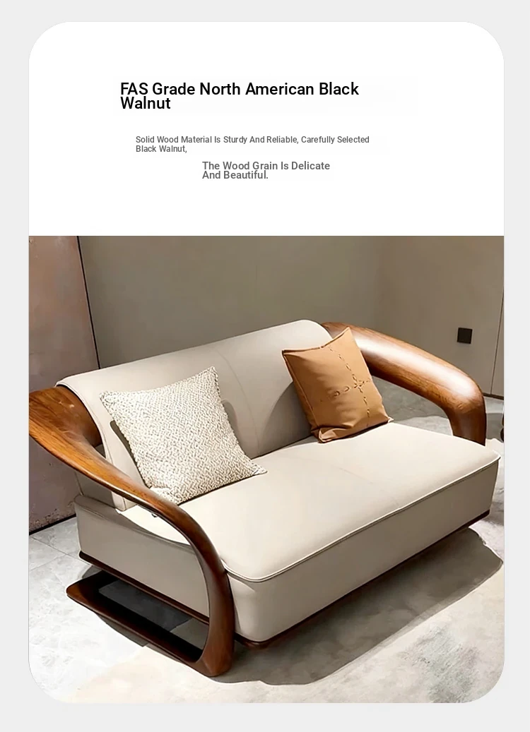 2025 New Walnut Veneer Leather Sofa - High-End Solid Wood Large Living Room Sofa in Vintage Style with Elegant Ribbons