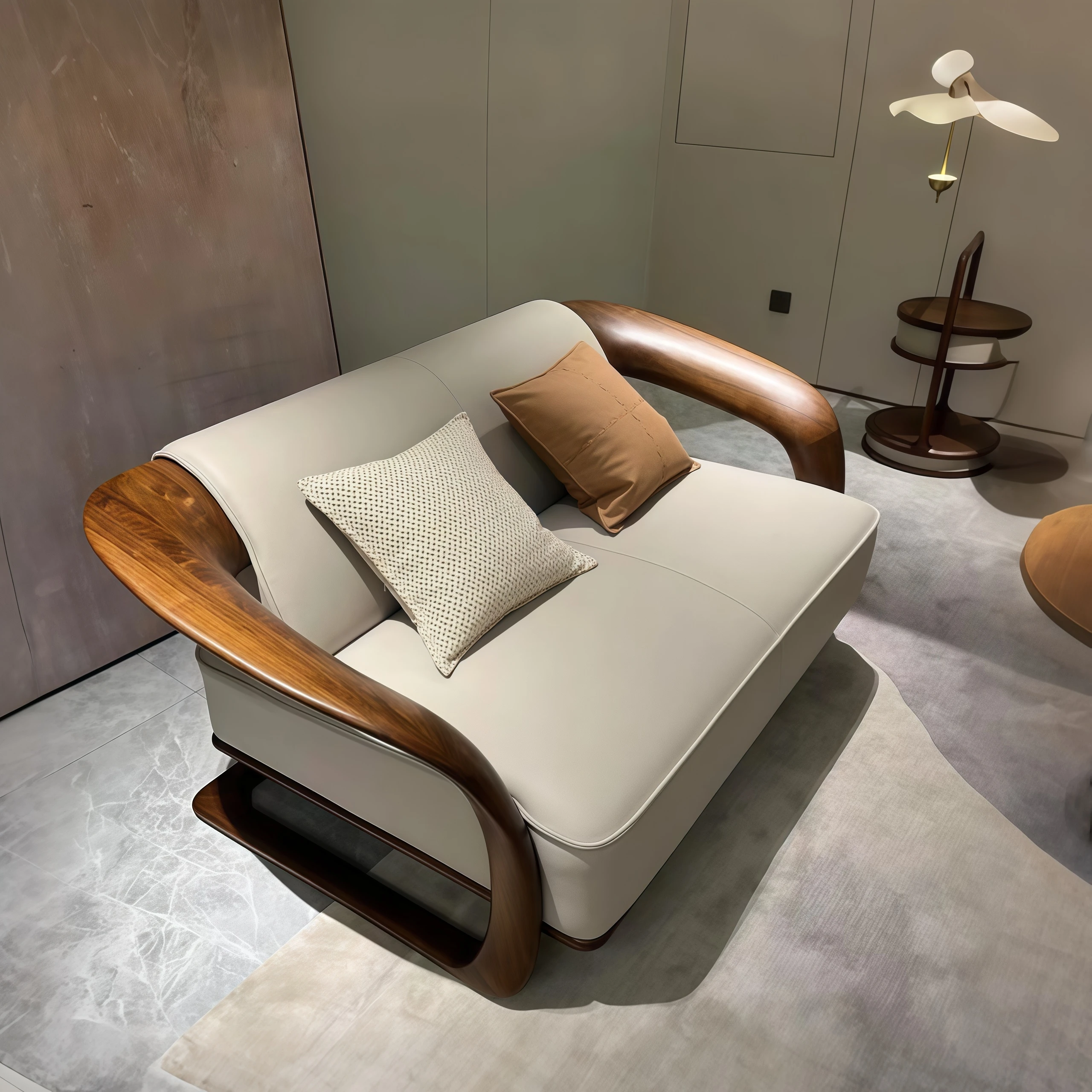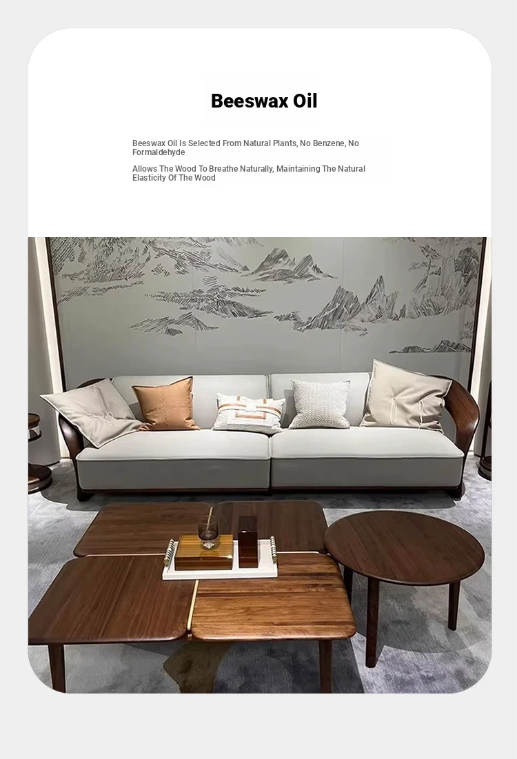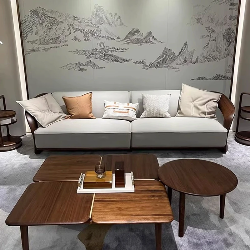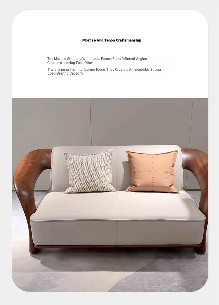 2025 New Walnut Veneer Leather Sofa - High-End Solid Wood Large Living Room Sofa in Vintage Style with Elegant Ribbons