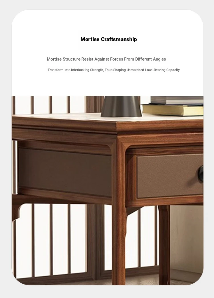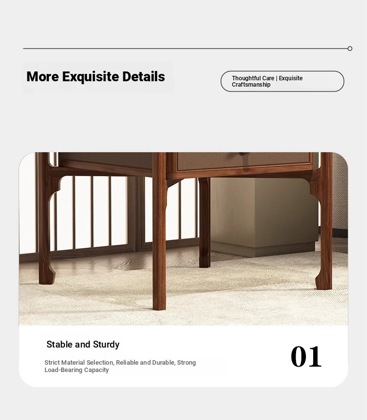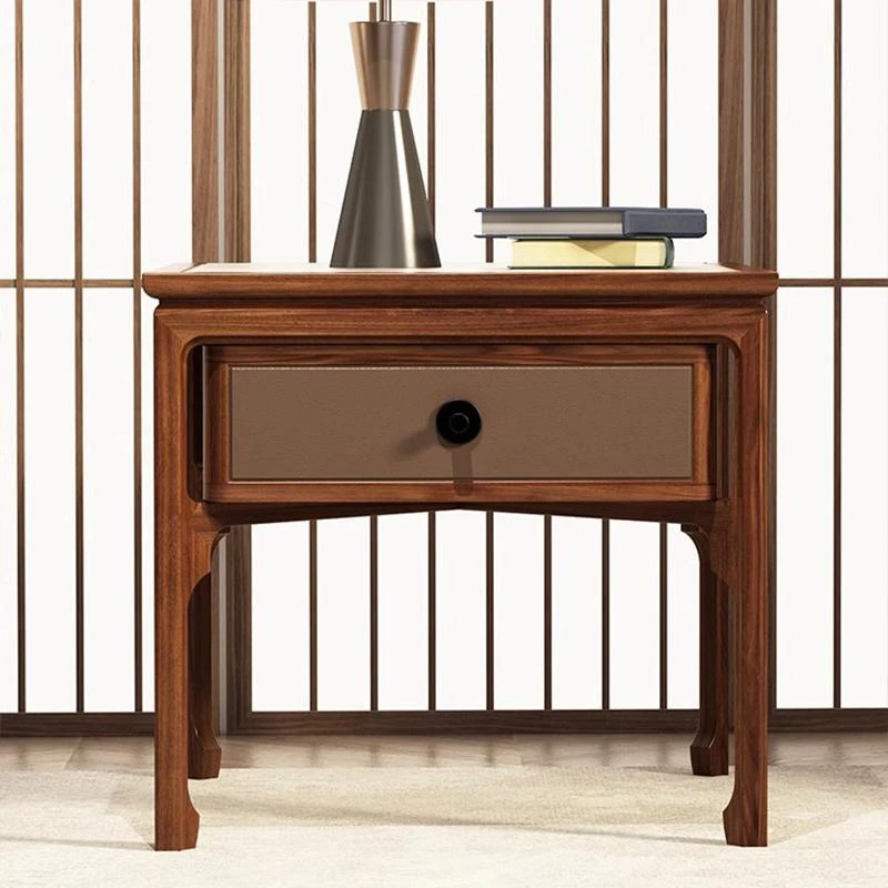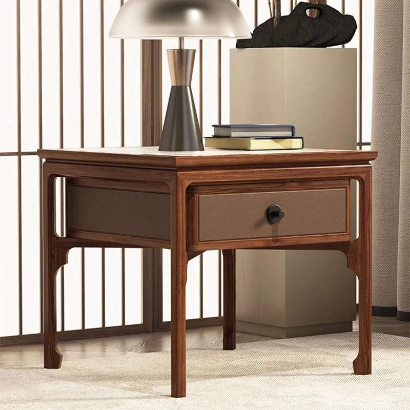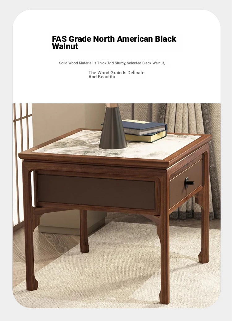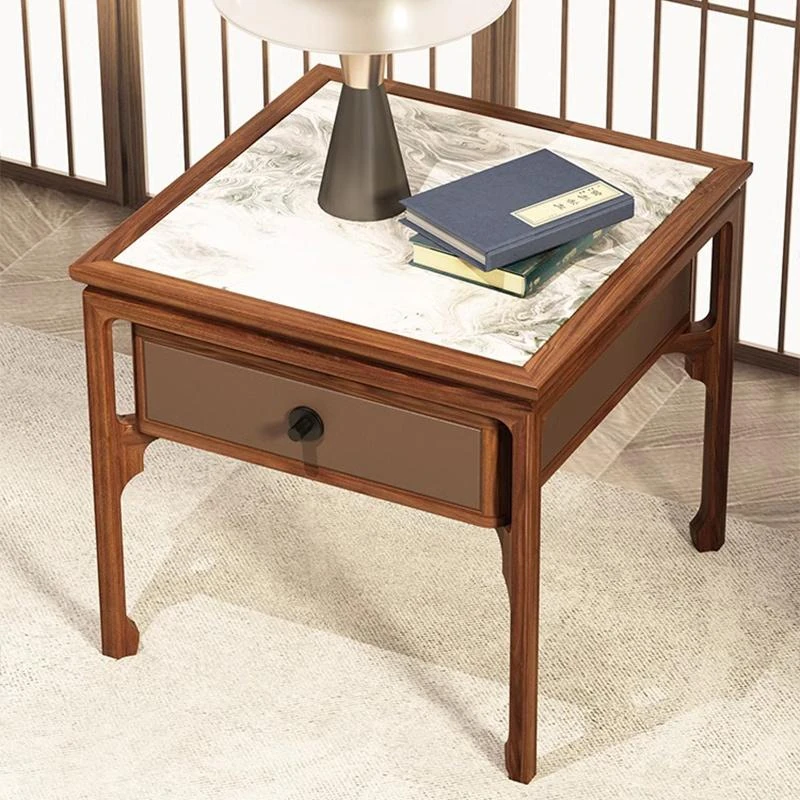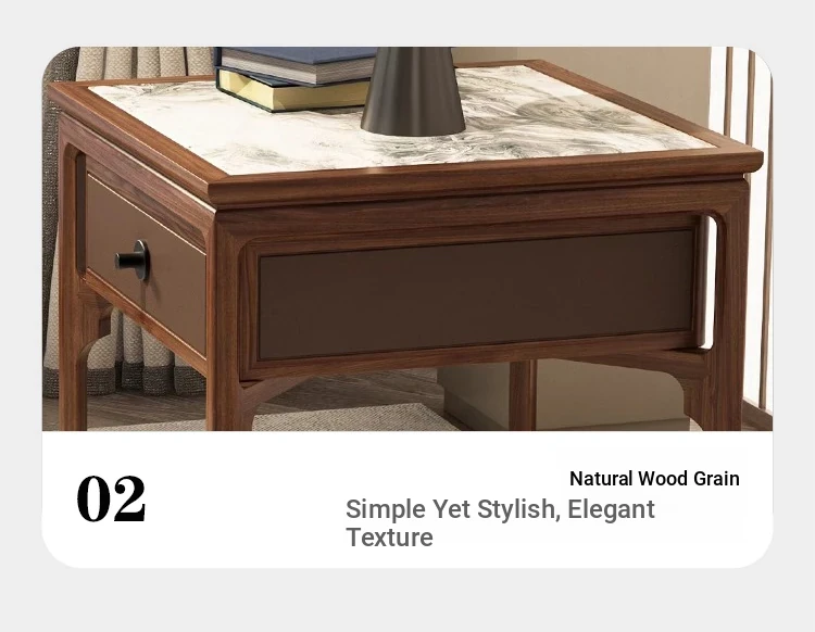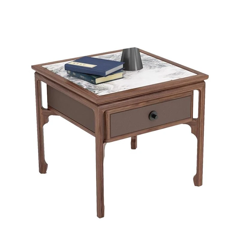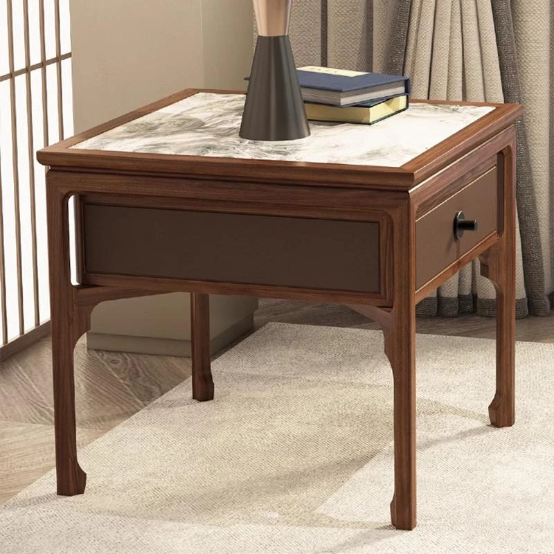 Elegant Walnut Wood Nightstand with Rock Surface - Modern Chinese Style Solid Wood Storage Side Cabinet for Living Room, Sofa Corner Table