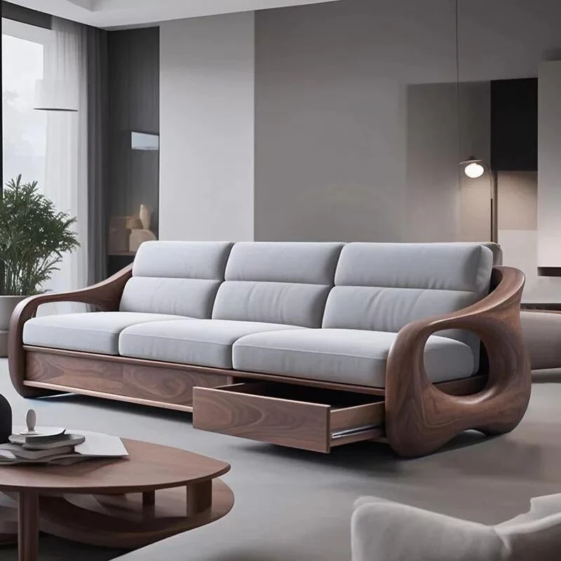 Modern Chinese Style Walnut Wood Storage Sofa - Three-Seater Luxury Minimalist Design for Villa Living Room