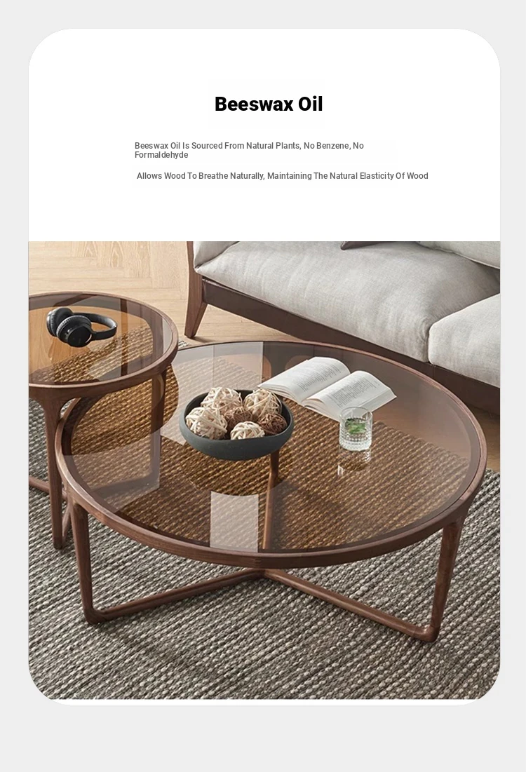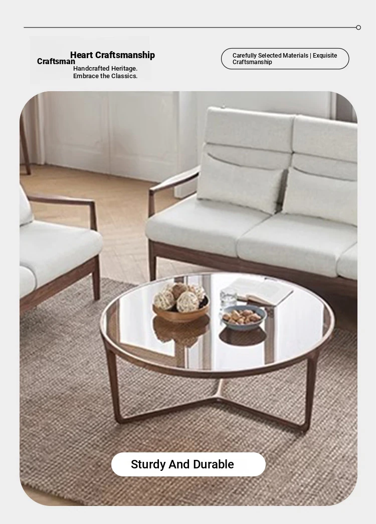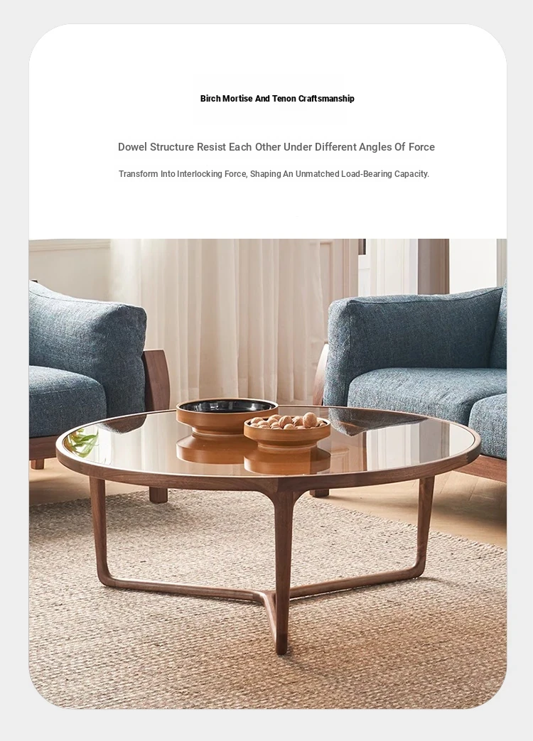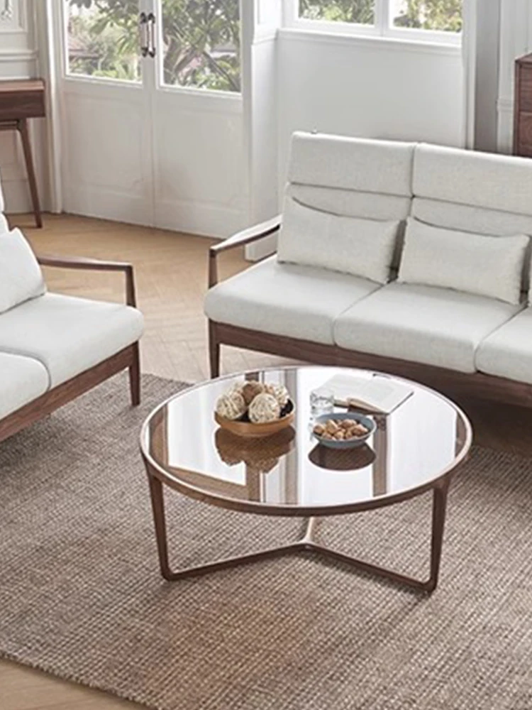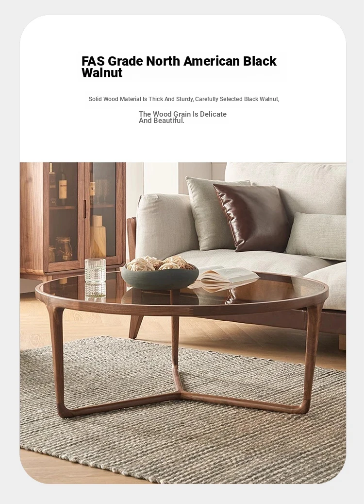 Modern Minimalist Round Walnut Coffee Table for Small Living Rooms - Chic Tempered Glass Design with Rounded Corners, Perfect for a Touch of Luxury in Your Home.