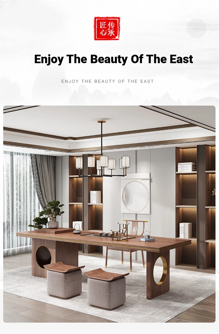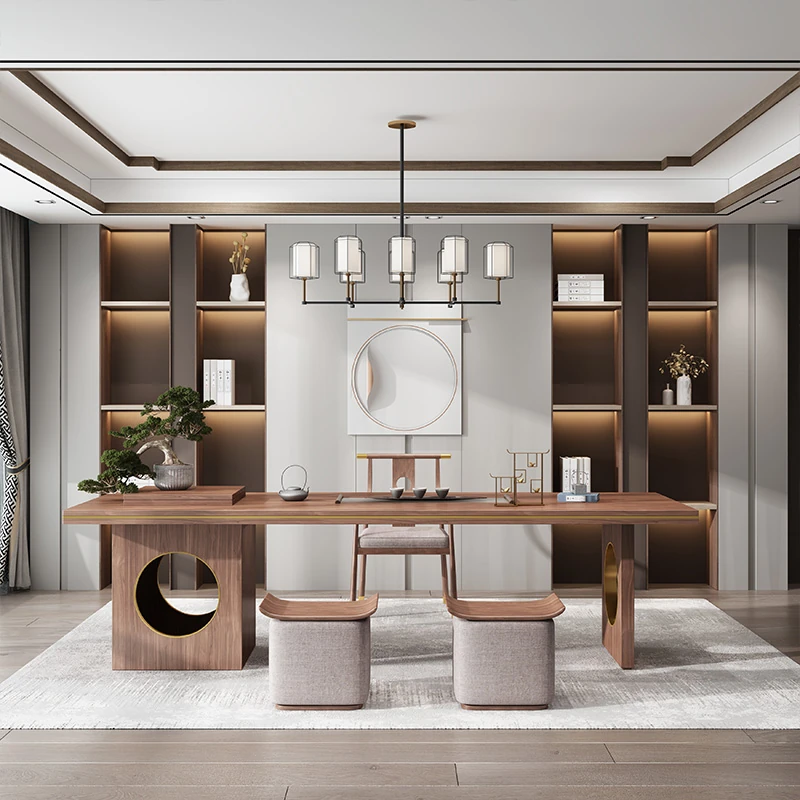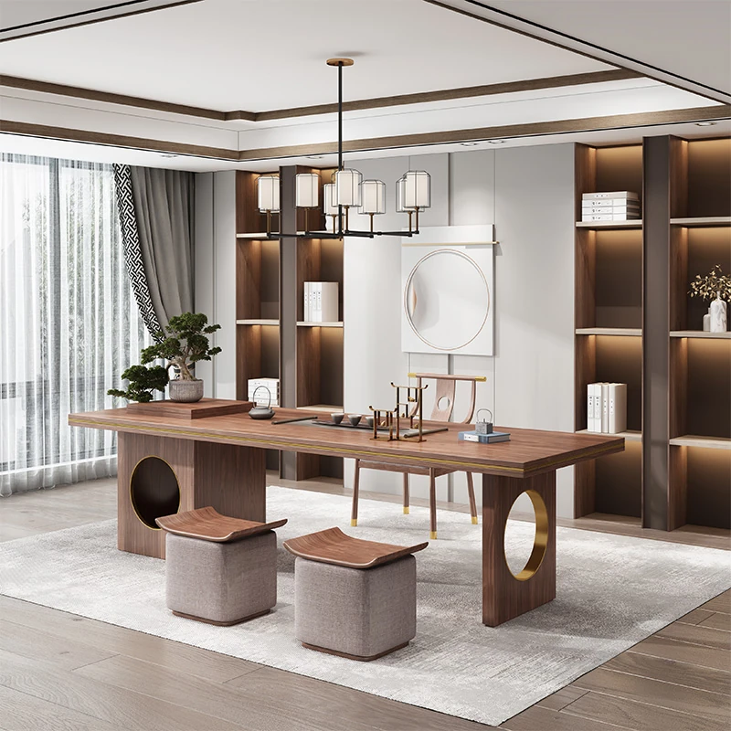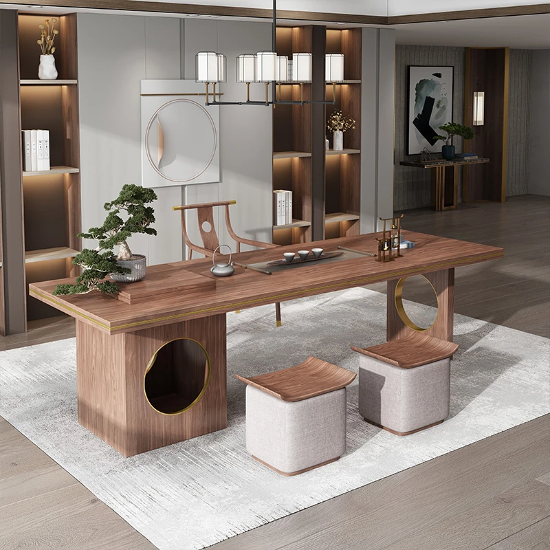 New Chinese Style Solid Wood Tea Table Set with Integrated Tea Tray - Walnut Wood Tea Desk and Chair Combo for Enjoying Kung Fu Tea Ceremonies