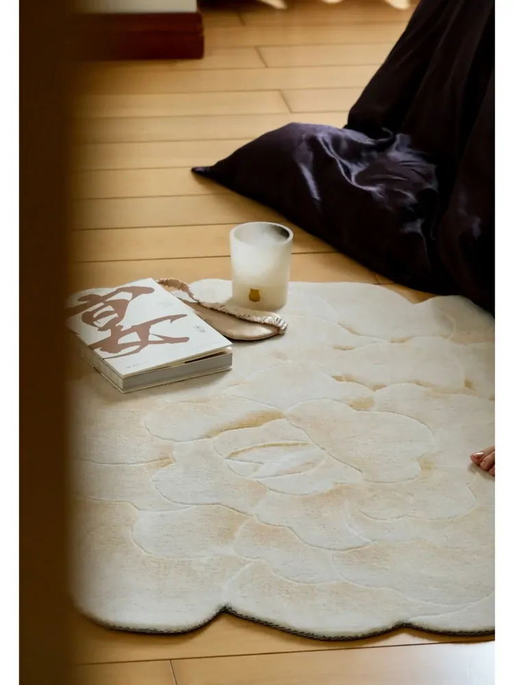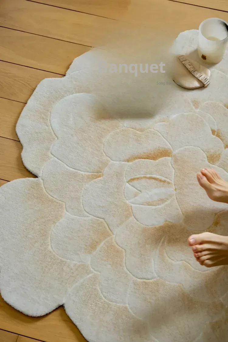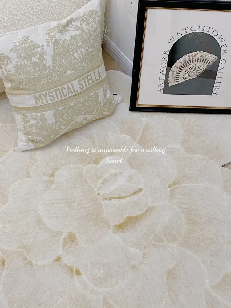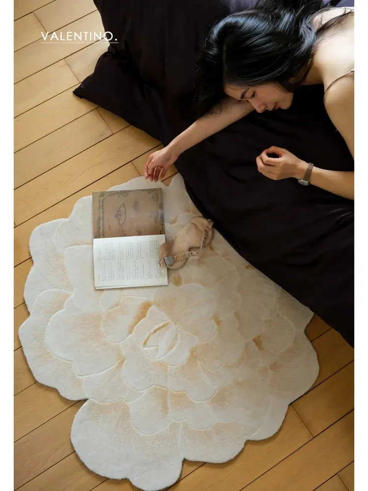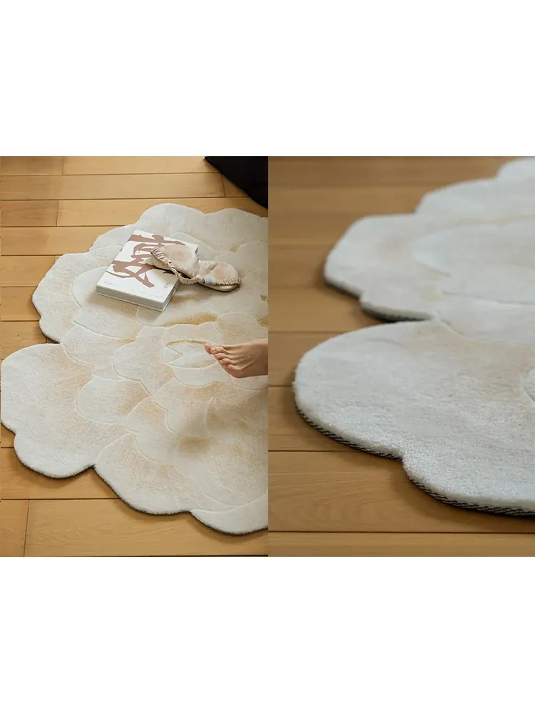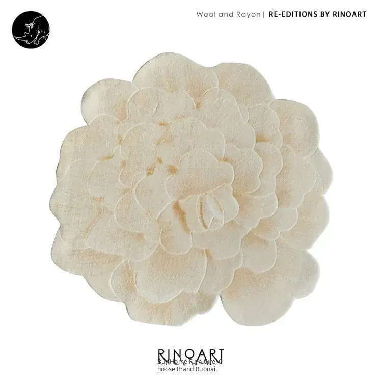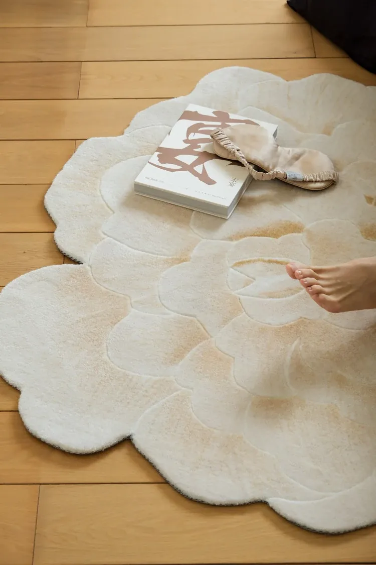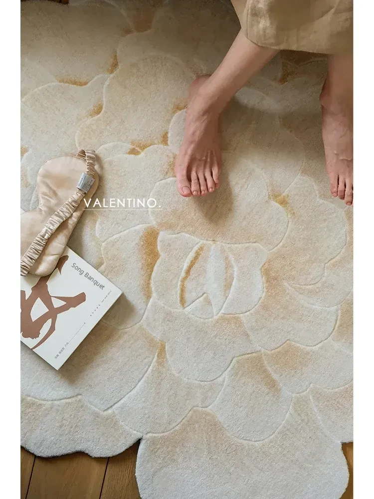 Rinai Valentino "Golden Silk White Peony" 3D Hand-Carved Bedside Rug - Elegant Entry Mat & Vanity Throw Blanket for a Luxurious Touch to Your Space