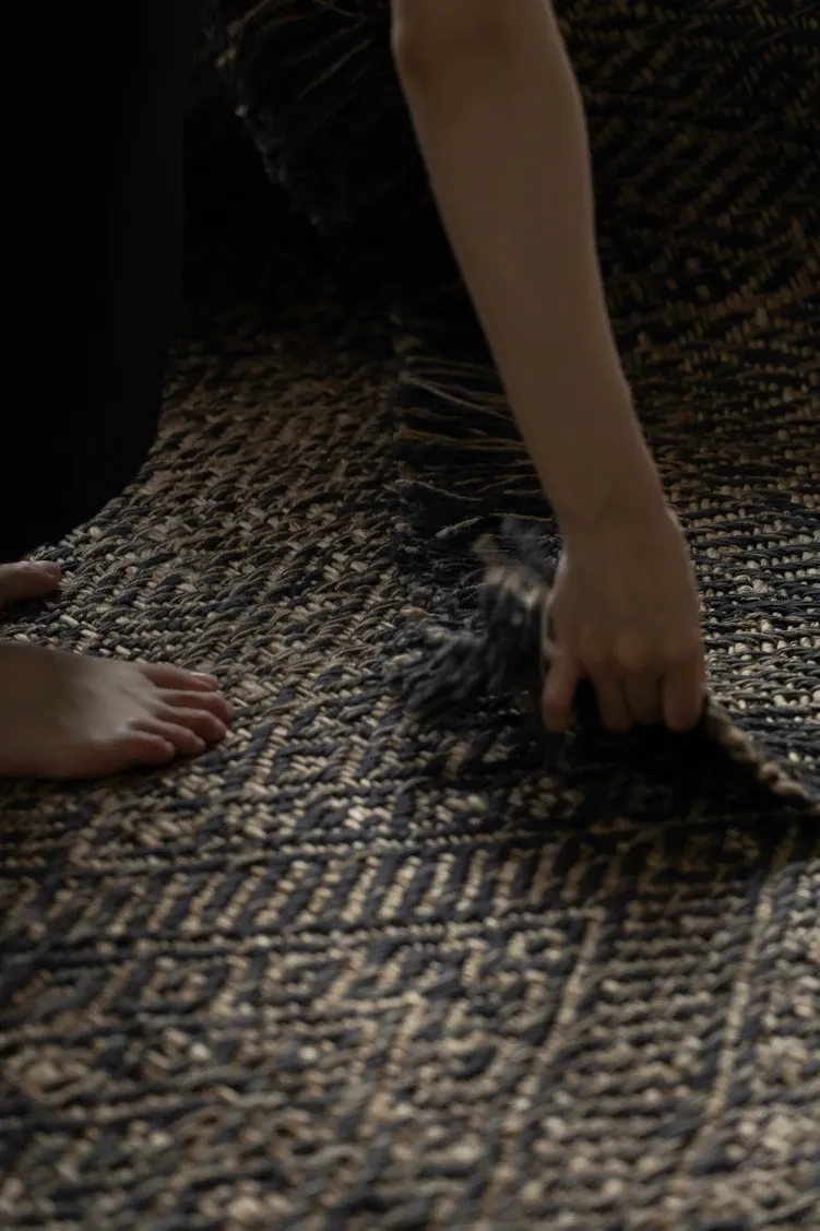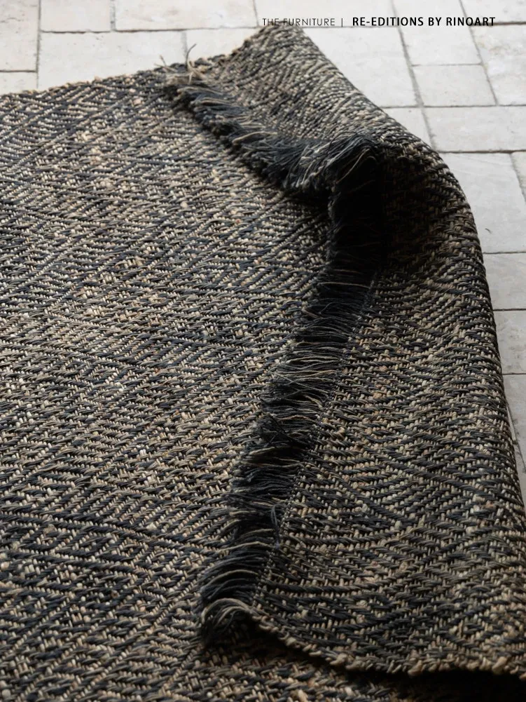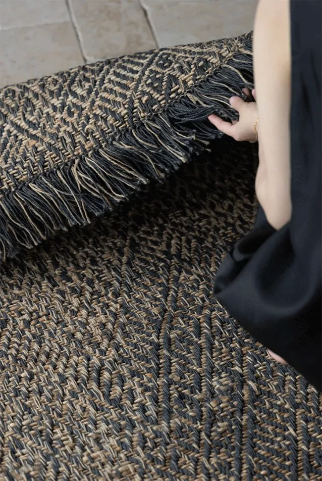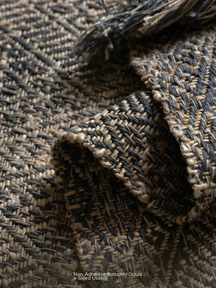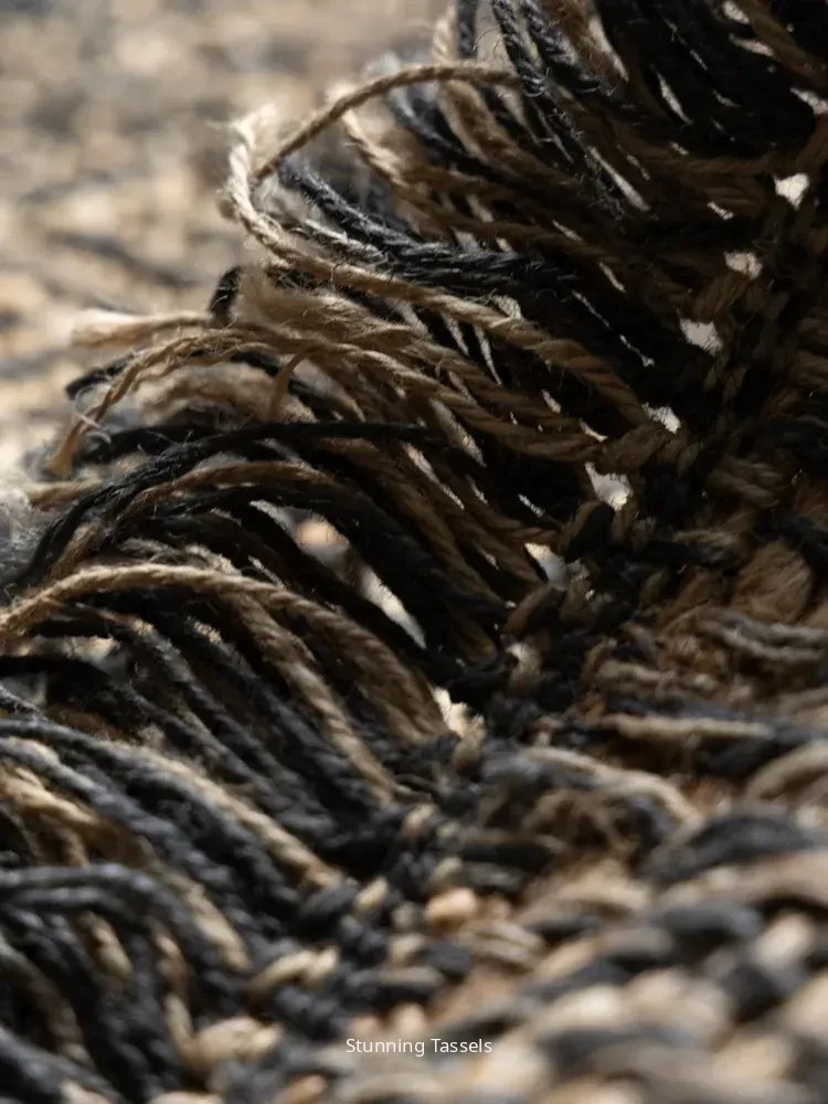Rug of Elegance: Handwoven Moroccan Black and Yellow Jute Fringe Carpet - Reversible Wabi-Sabi Bedside Mat for a Touch of Bohemian Charm!