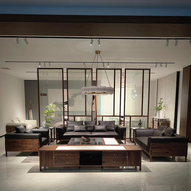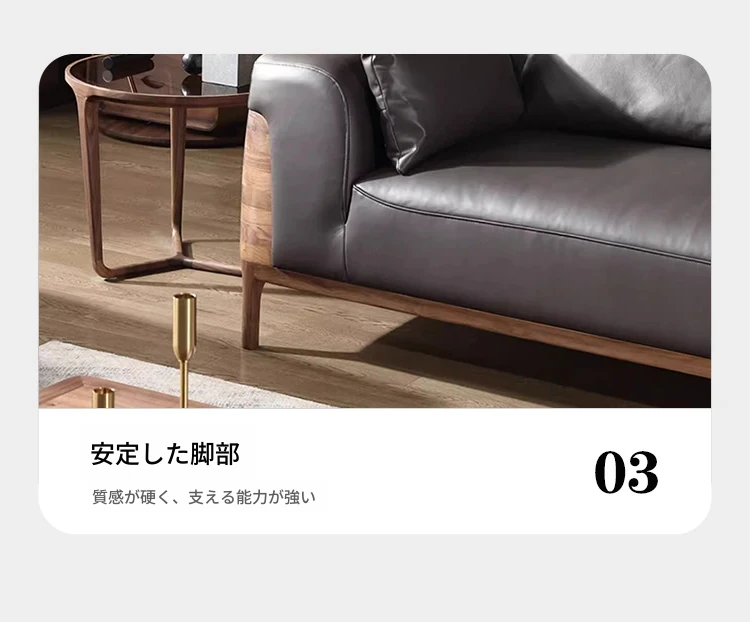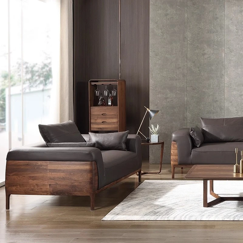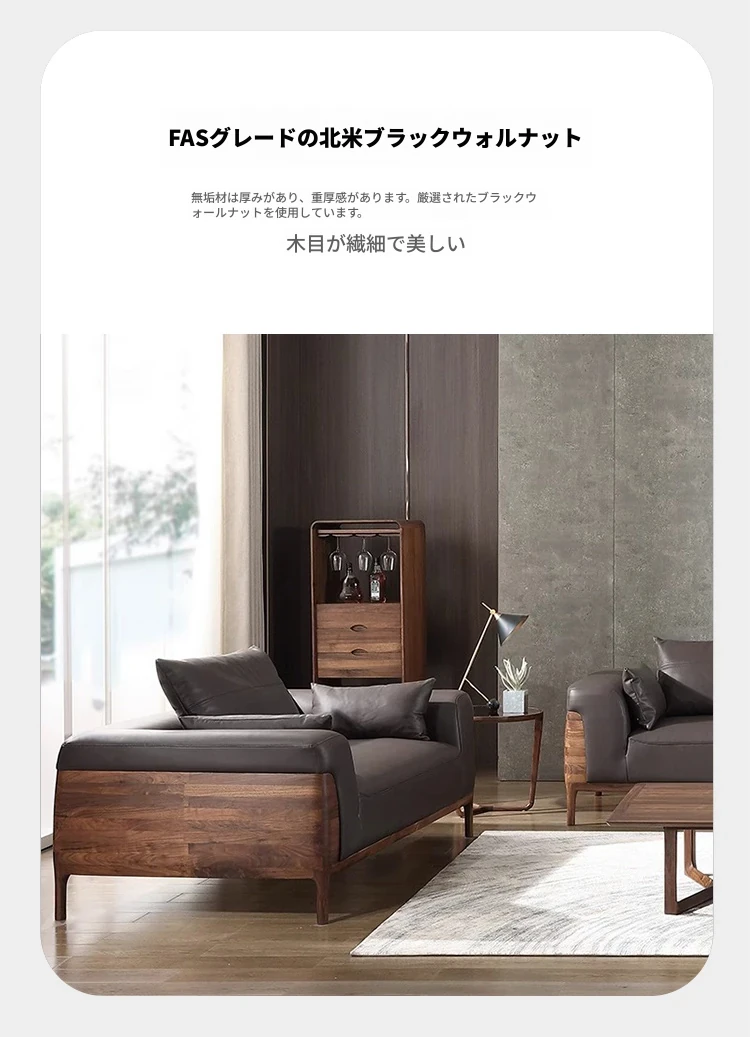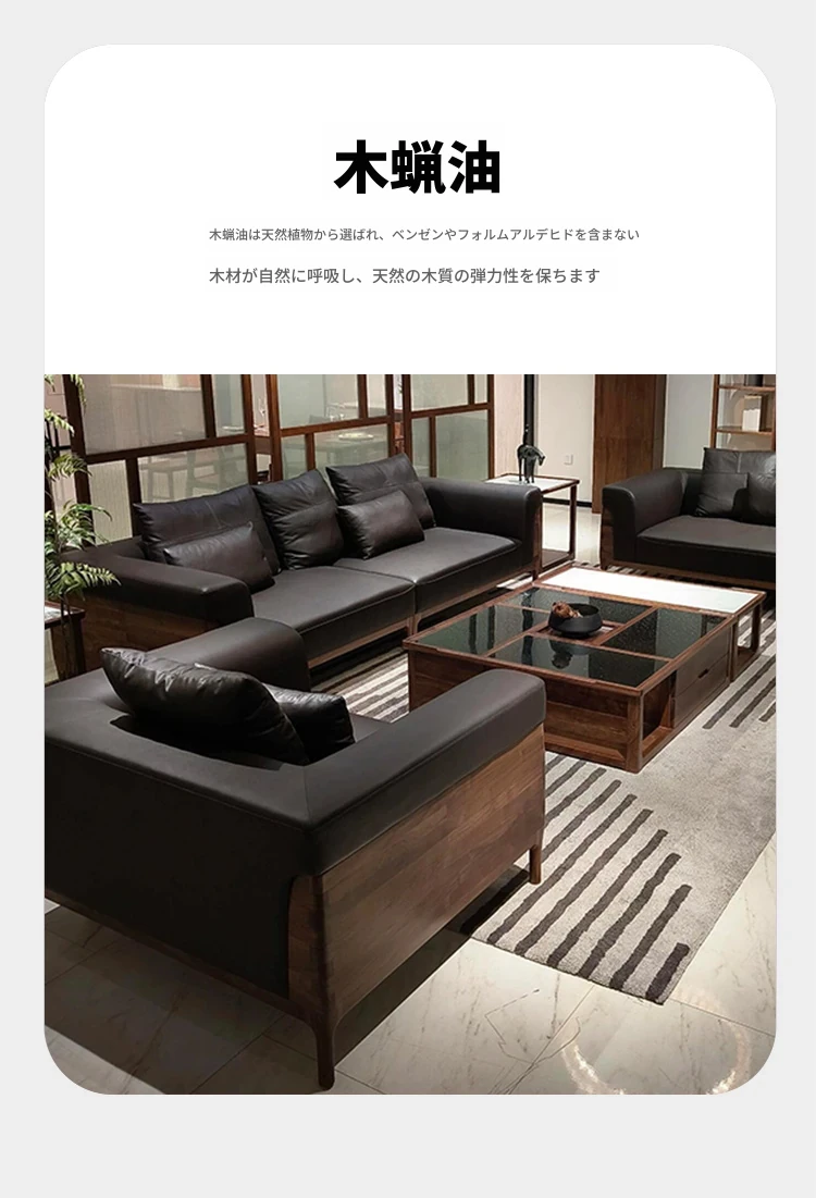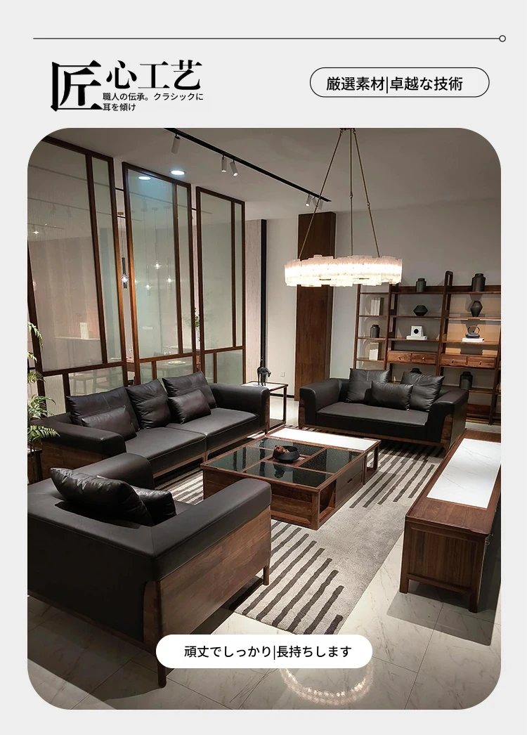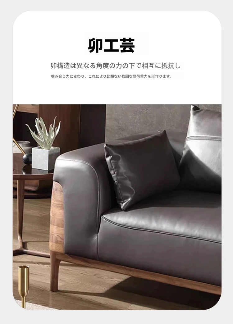 2025年新作!高級感あふれる皮革ソファ - 新中式デザイン、実木製、胡桃の木使用。お洒落なリビングやオフィスの休憩スペースにぴったりな、贅沢なヴィラ用ソファ!快適な座り心地で、心安らぐ空間を実現します。