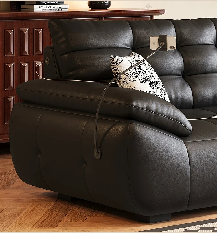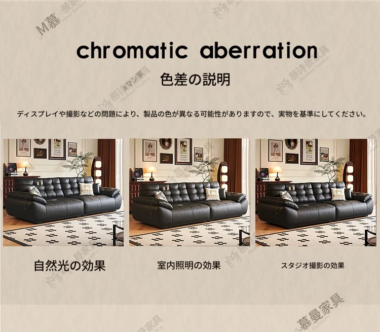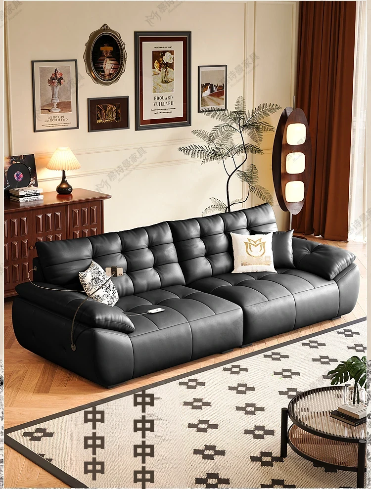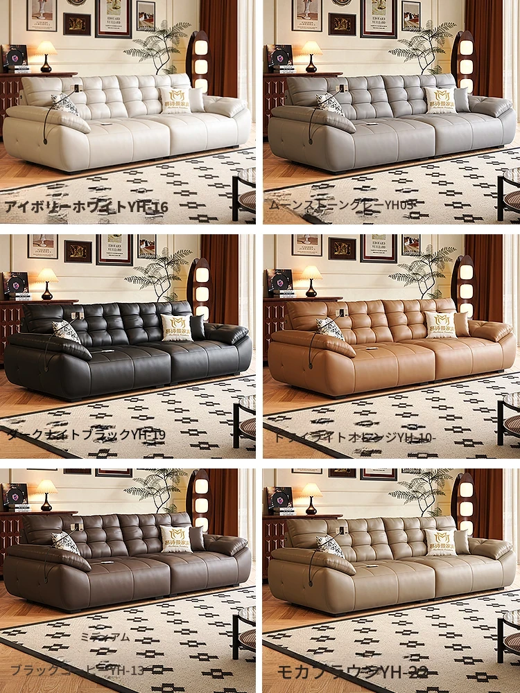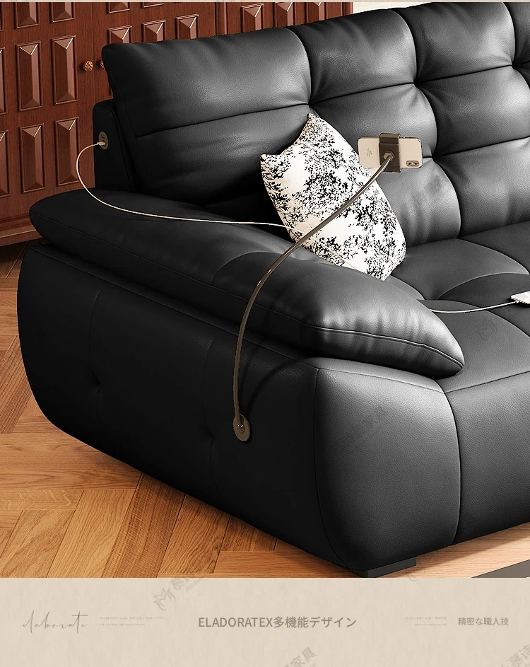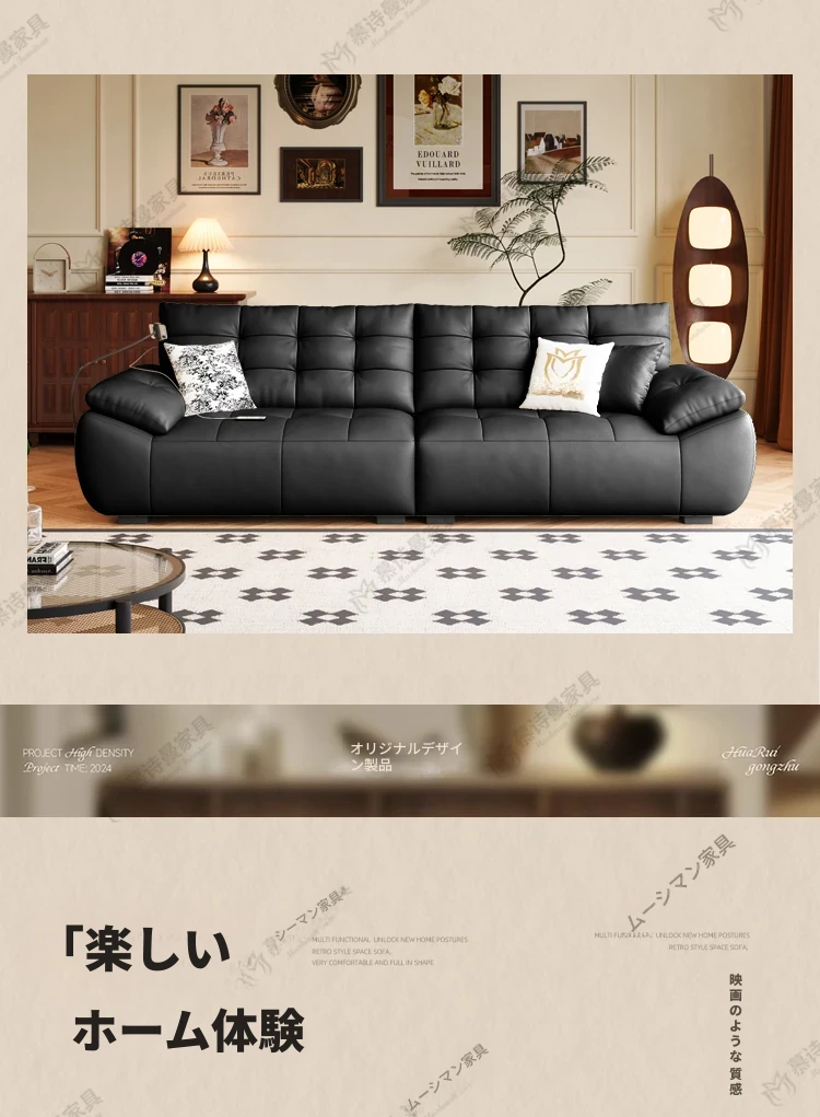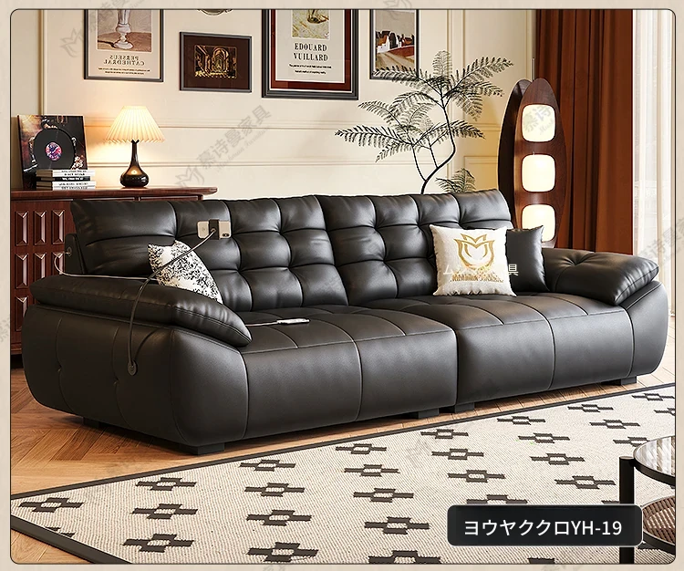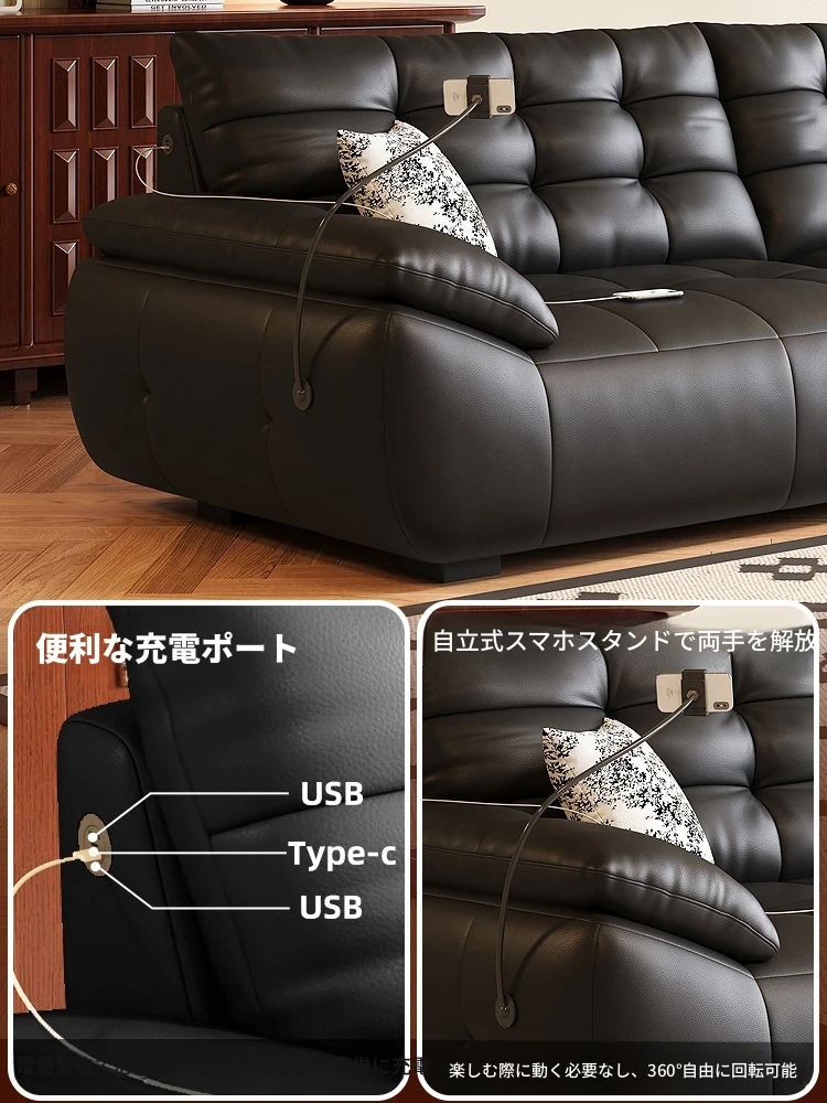 2025年新作!本革製ソファー - リビングにぴったりな宇宙雲ブラック!レトロなトップグレイン牛革使用、充電機能付きで便利な中古風スタイル、雲のような快適さをお届けします!