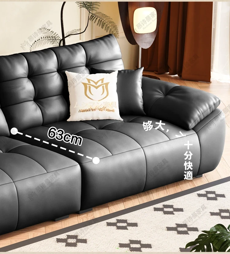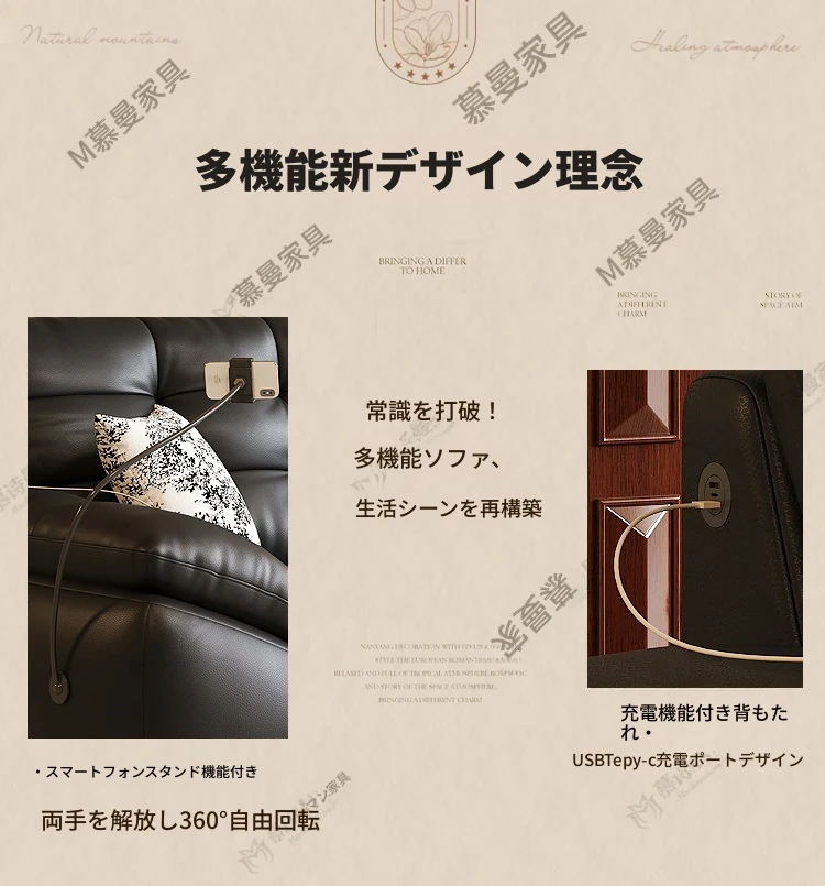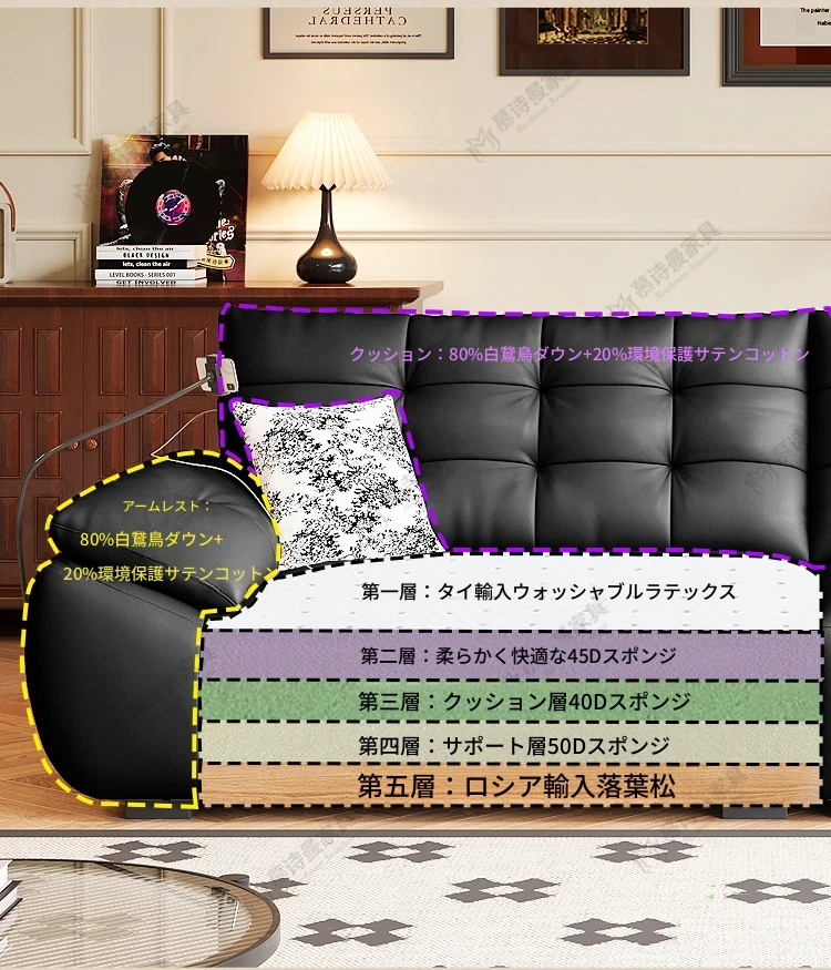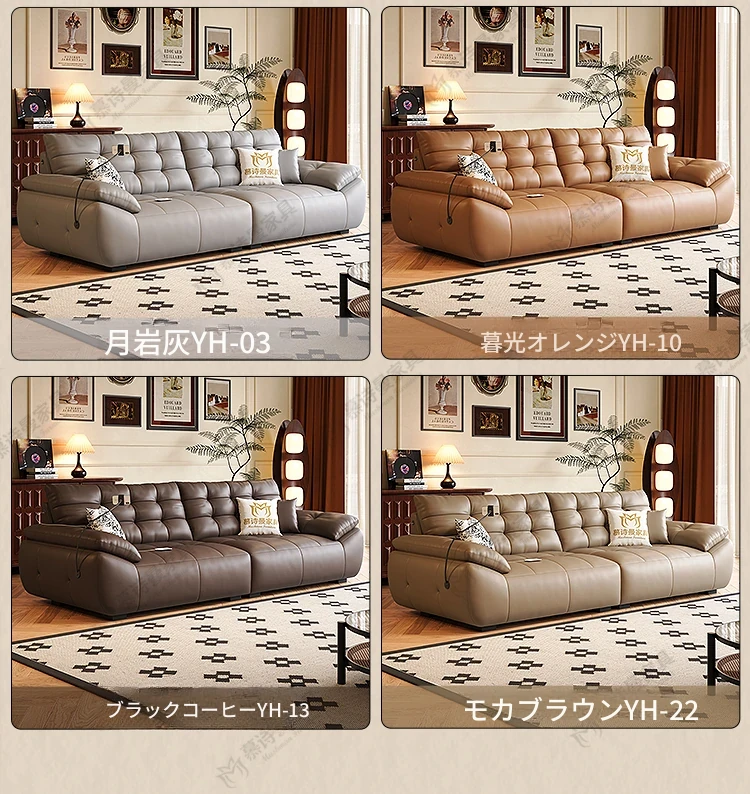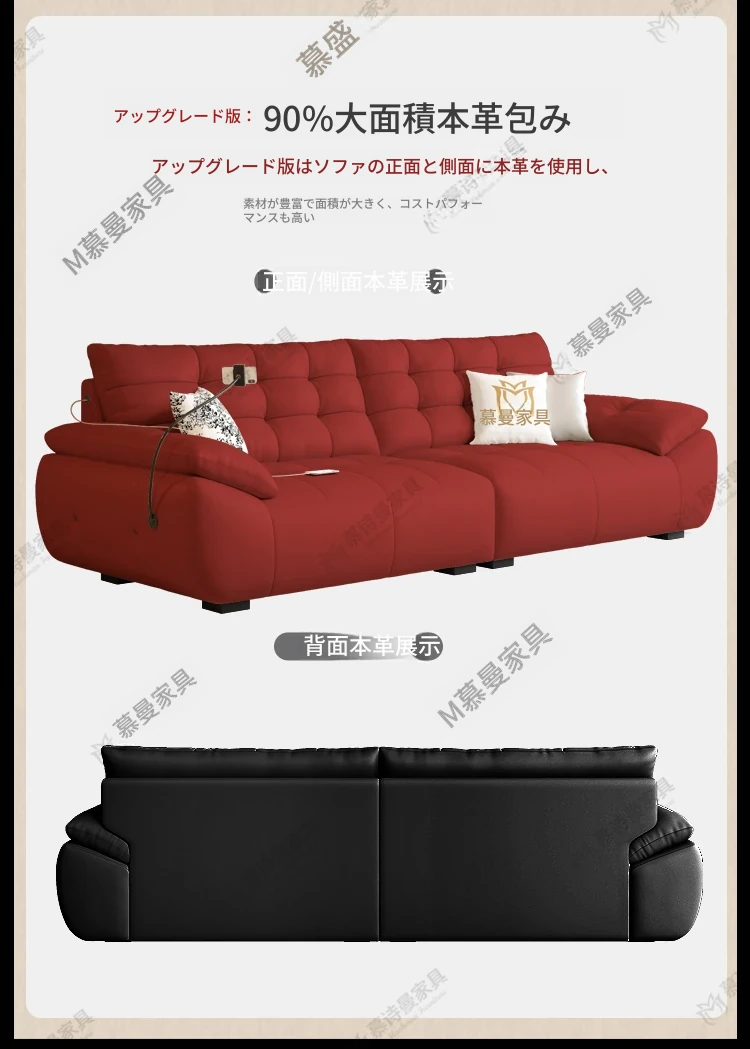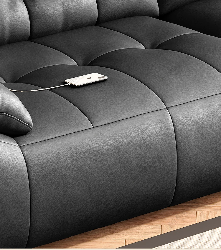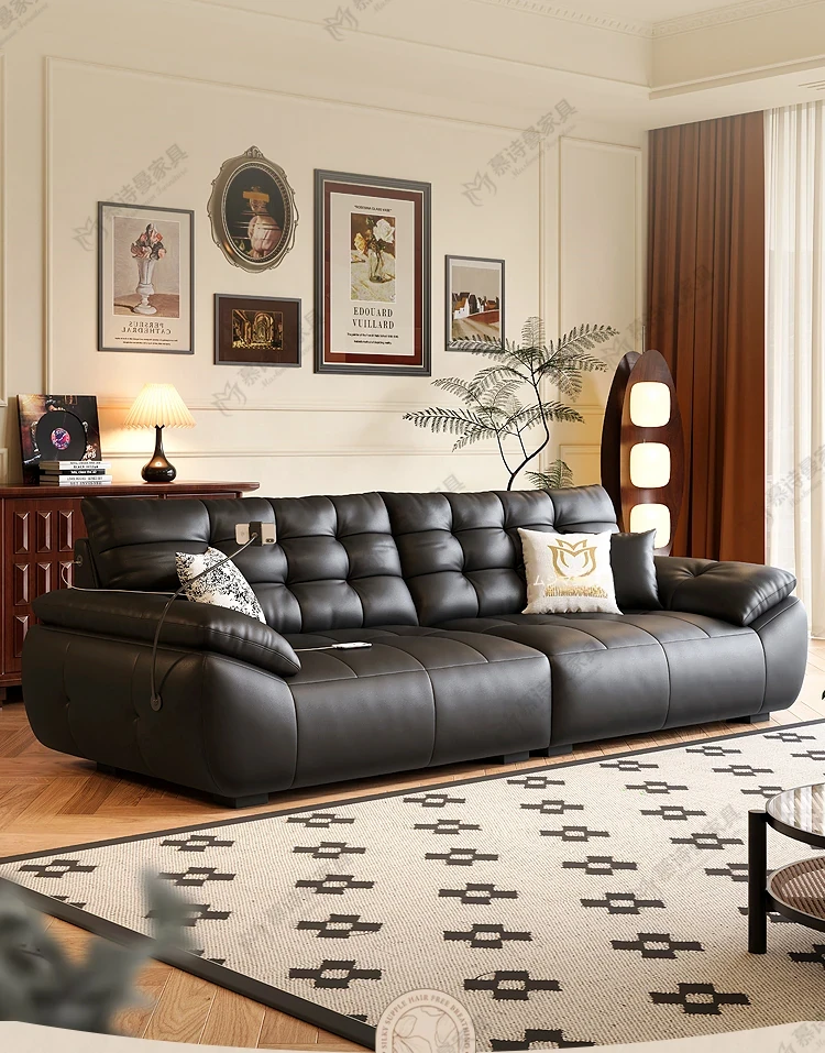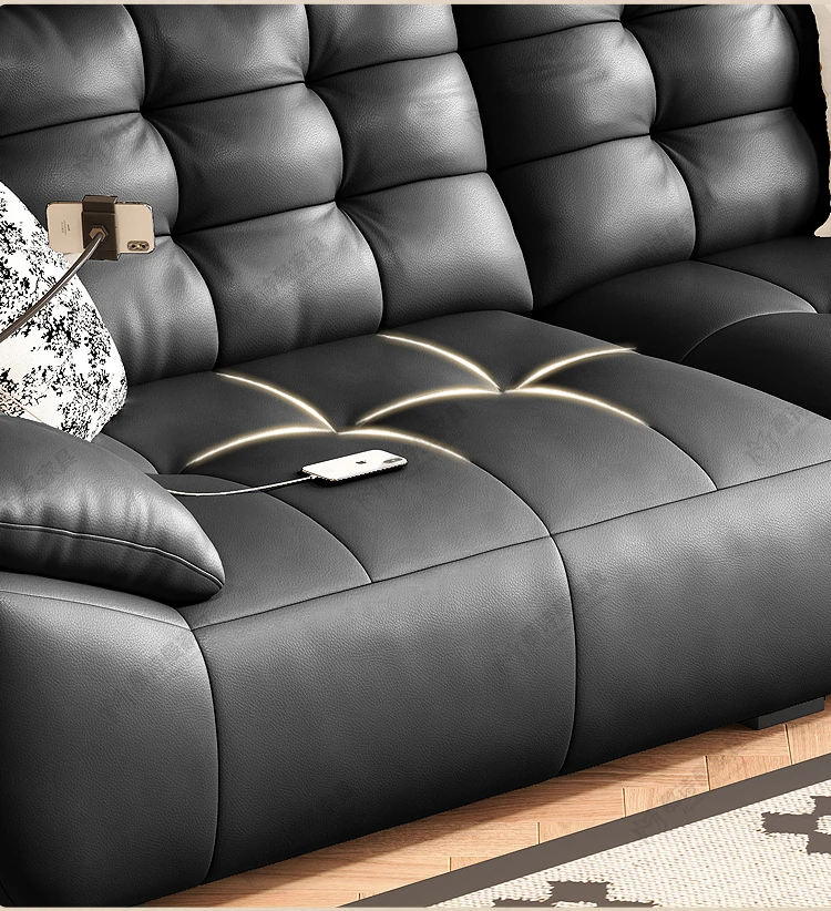 2025年新作!本革製ソファー - リビングにぴったりな宇宙雲ブラック!レトロなトップグレイン牛革使用、充電機能付きで便利な中古風スタイル、雲のような快適さをお届けします!