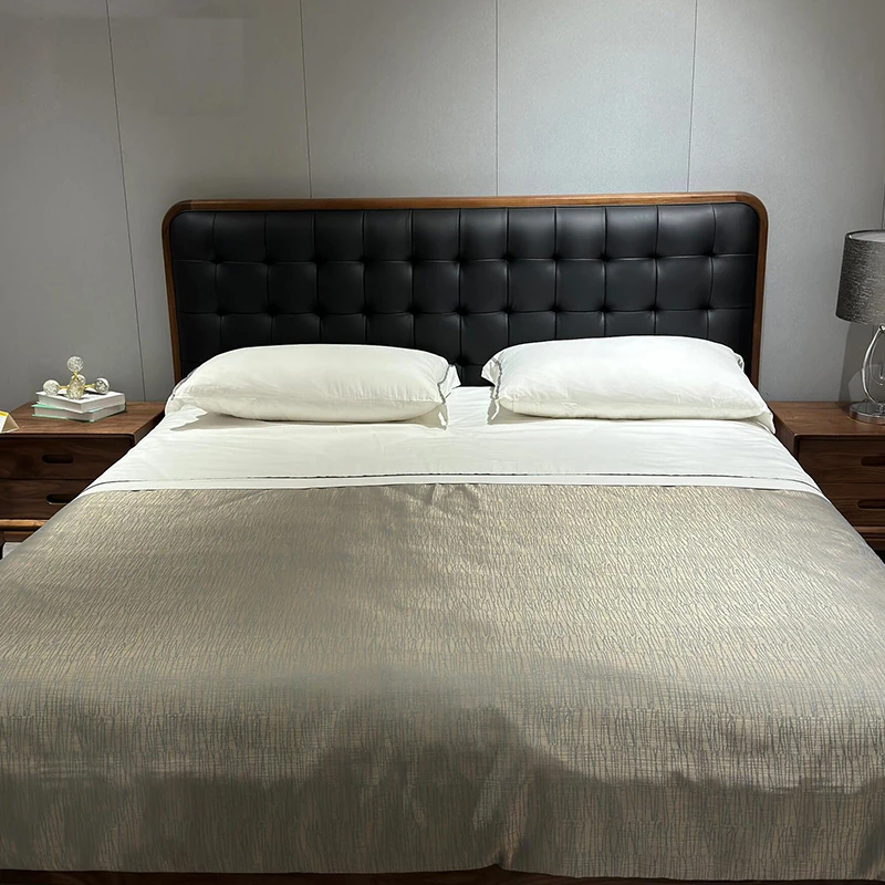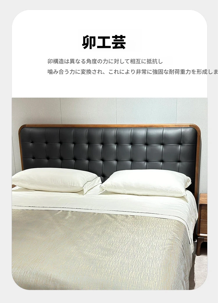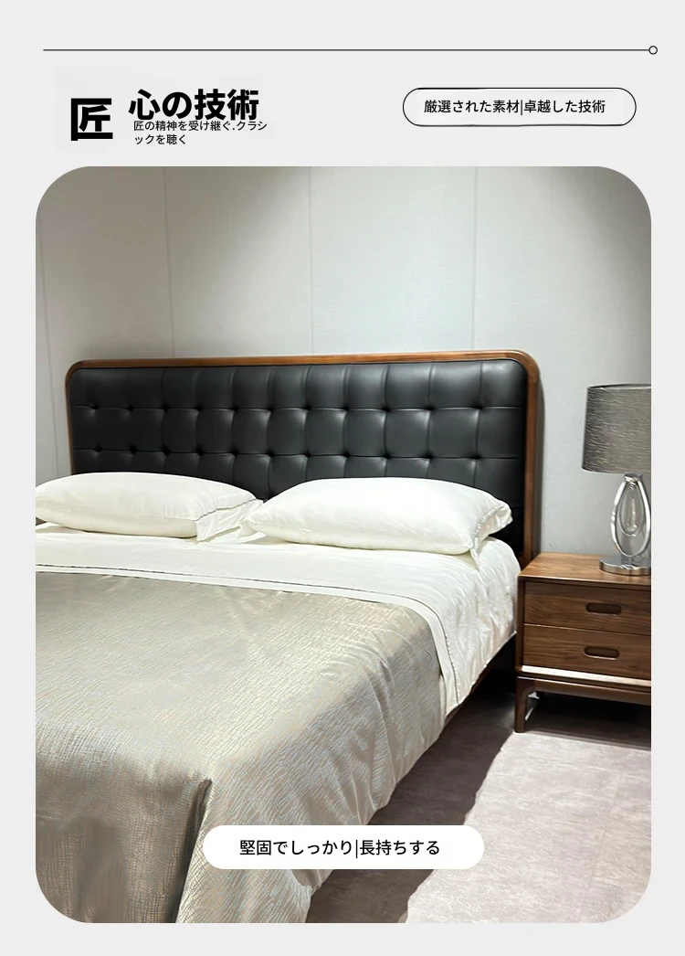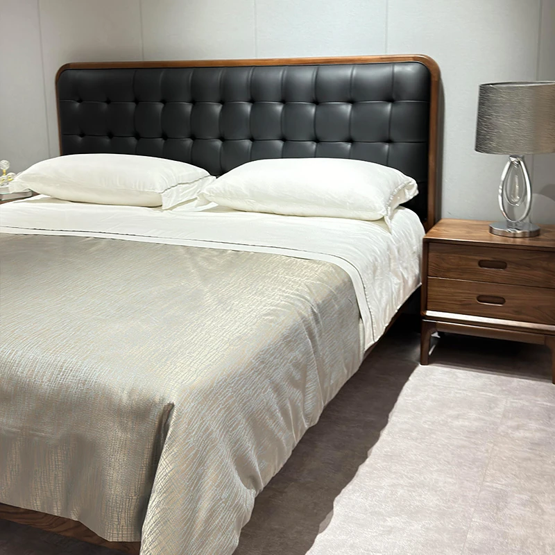 新しい中式の無垢材ベッド2025年モデル!モダンでシンプルなデザイン、家庭用主寝室に最適なダブルベッド。高級なレザーとクルミの木を使用したソフトパッケージ仕上げ、結婚生活を彩る理想のベッドです。