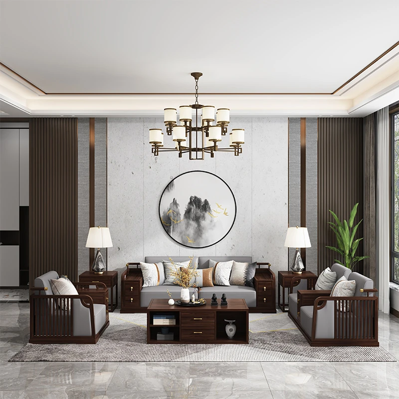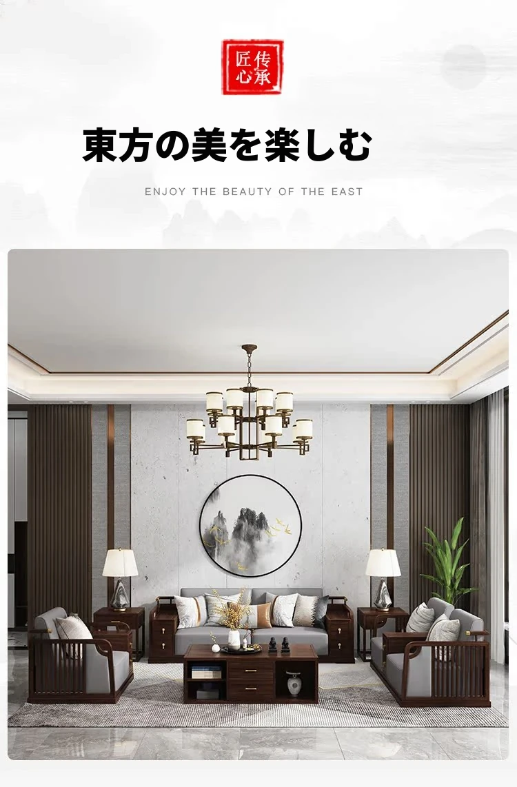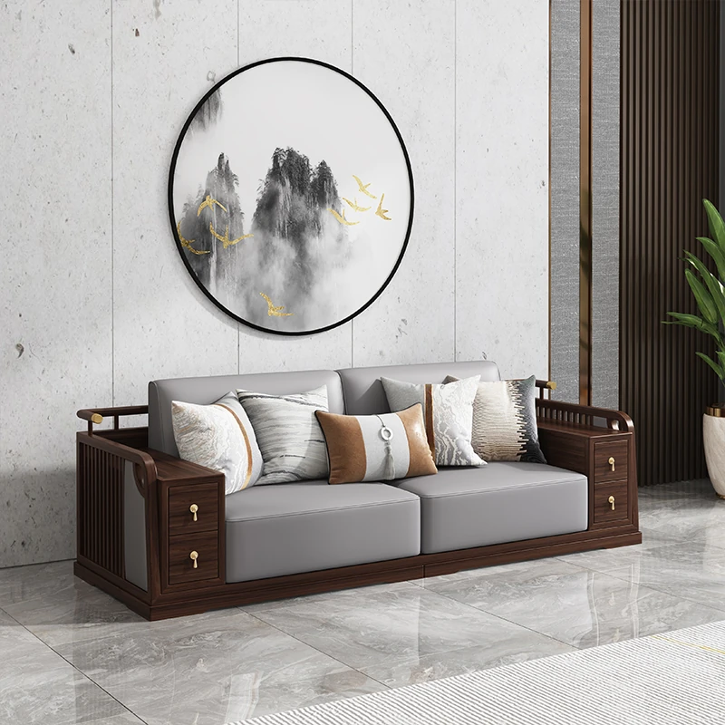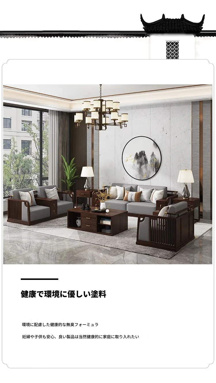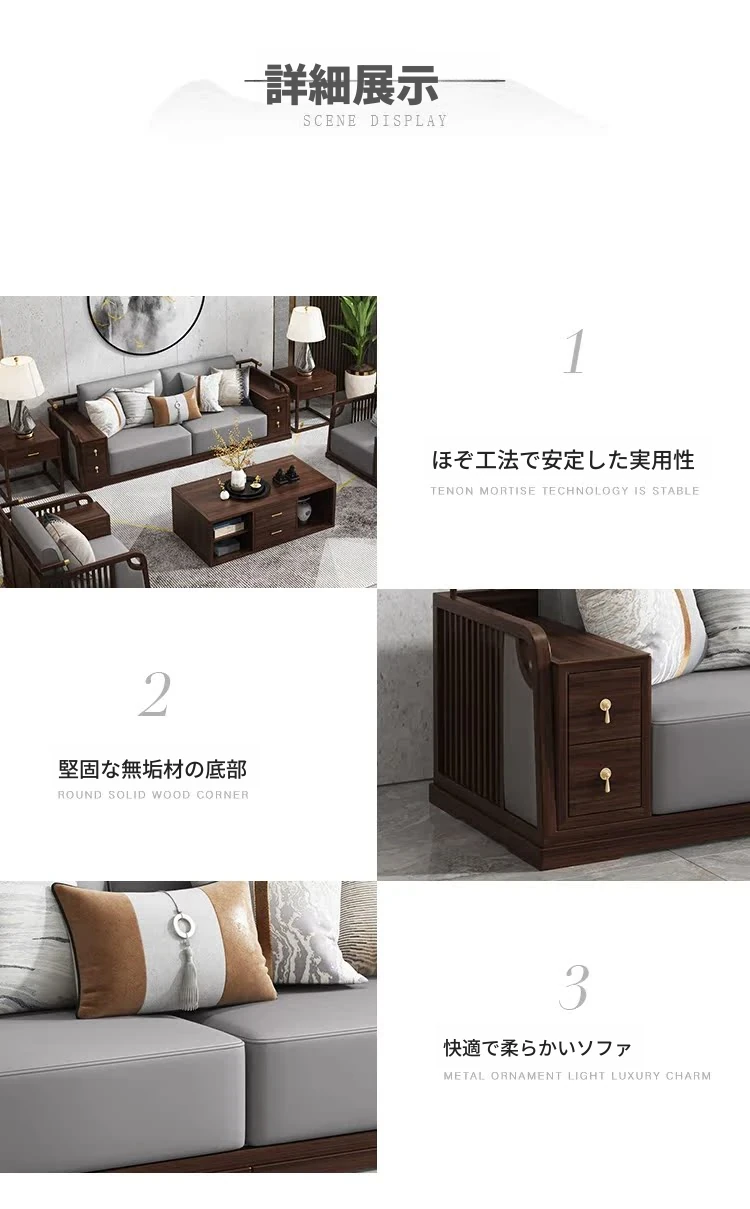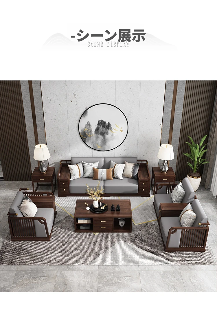 2025年新作!新中式デザインのレザーソファ!本格的な無垢材使用、軽やかなラグジュアリー感を演出。シンプルで洗練されたブラックウォールナットの魅力が、あなたの別荘リビングを特別な空間に変えます!