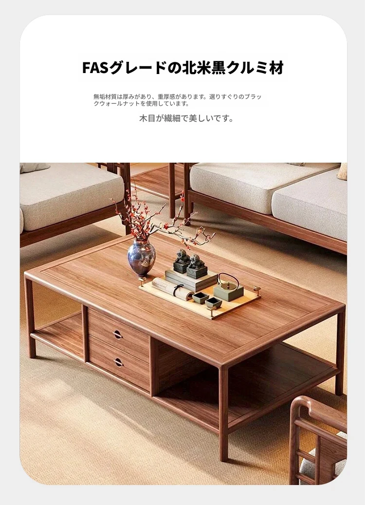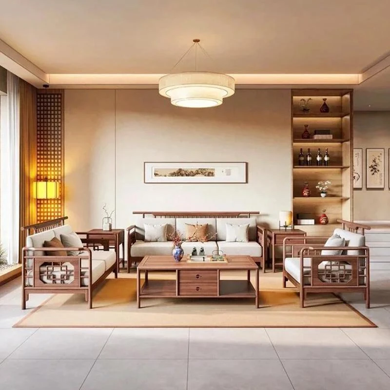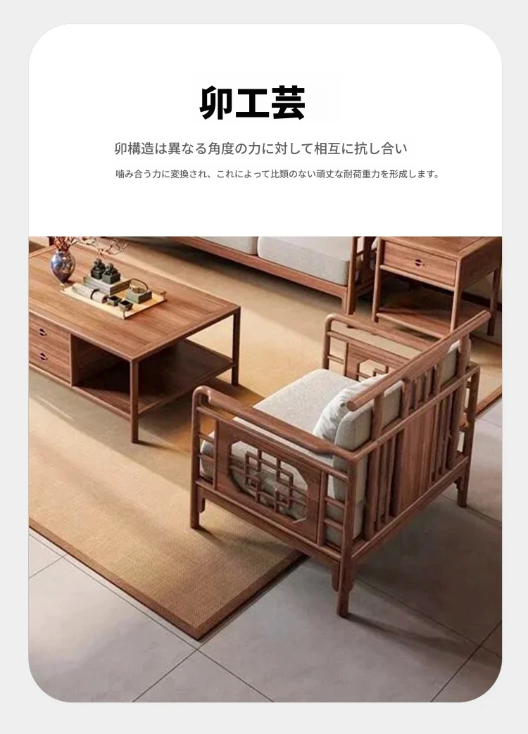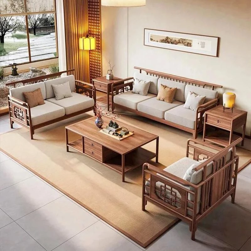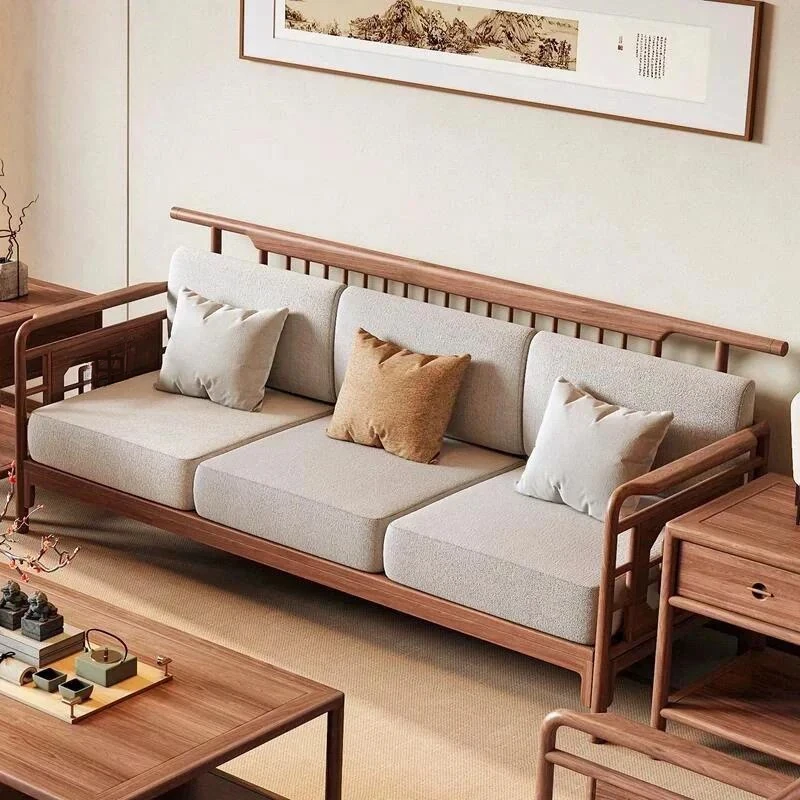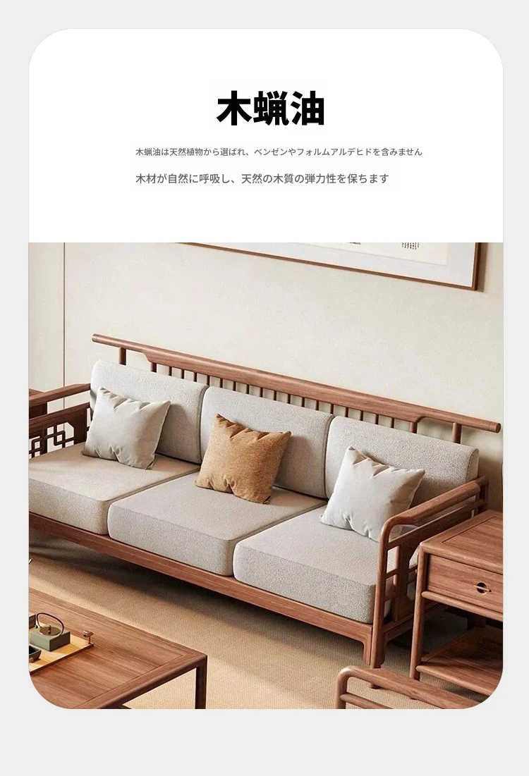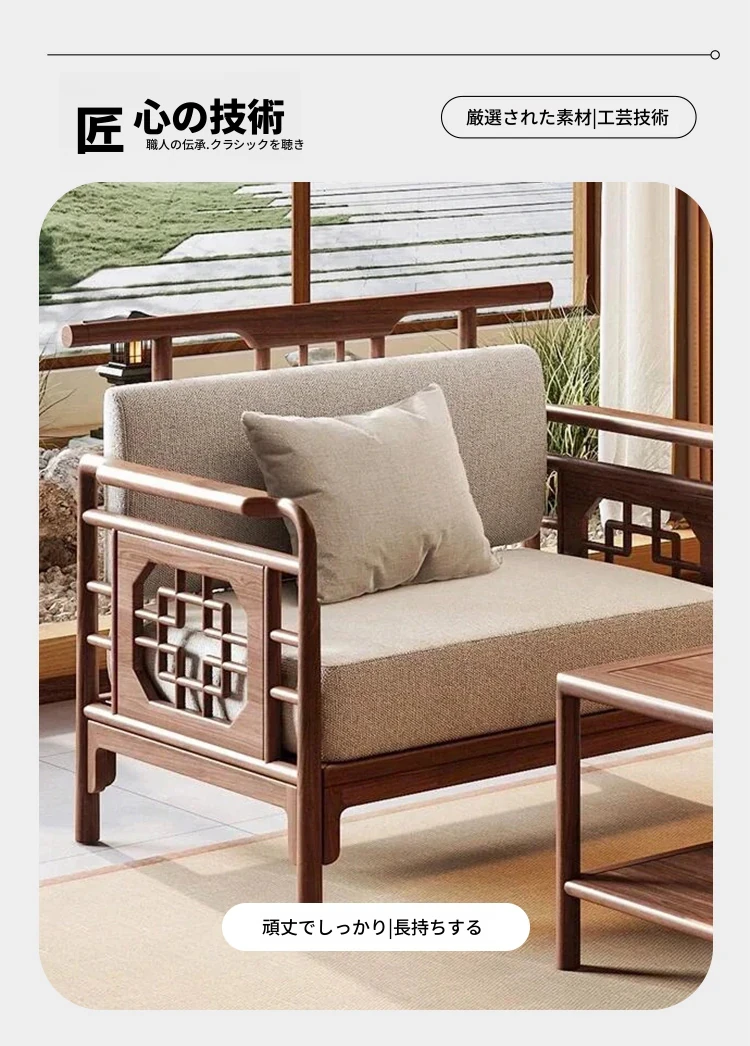 2025年新作!新中式布製ソファー - モダンでシンプル、小型住宅に最適な実木ローハンベッド、ウォルナットウッド使用のヴィラスタイル。快適で洗練された空間をあなたのリビングに!