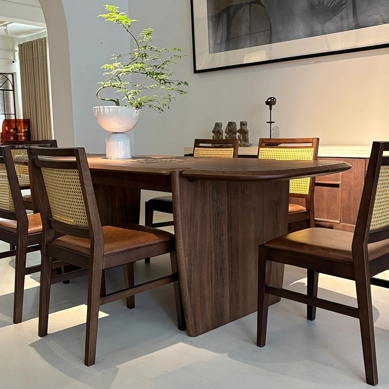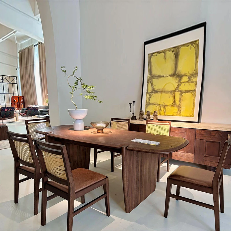 新中式スタイルの無垢材ダイニングテーブル&チェアセット2025年新作!モダンでシンプルなデザイン、クルミ材の長テーブルが家族の団らんを演出します。おしゃれで機能的なリビングの必需品!