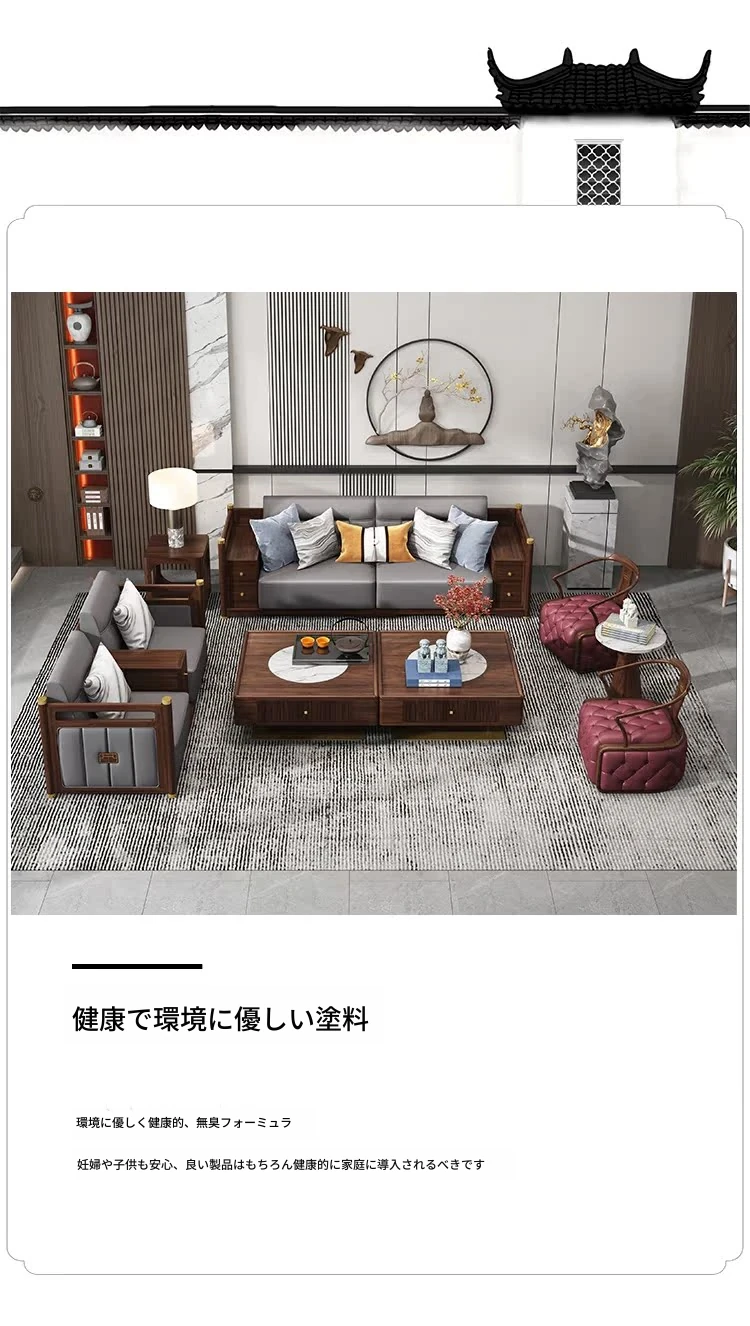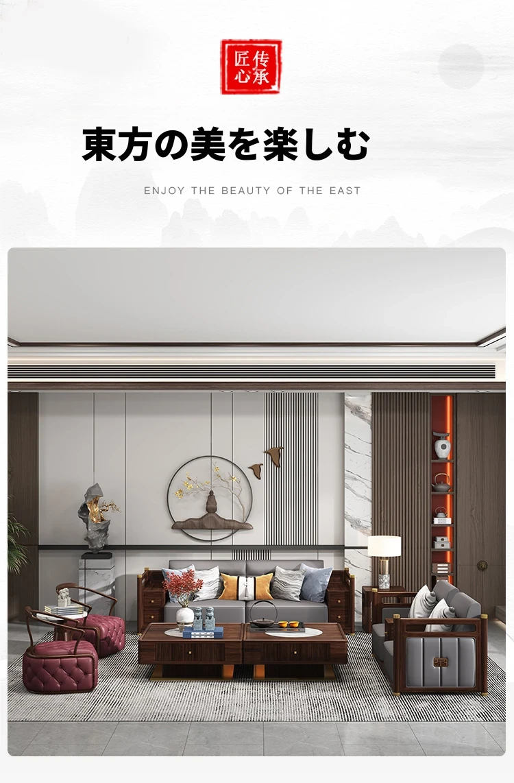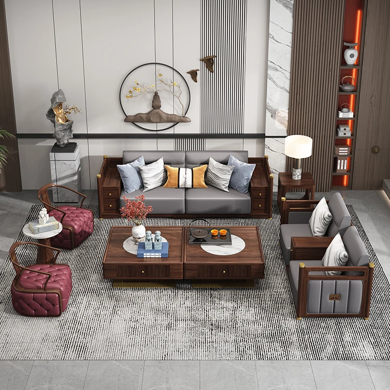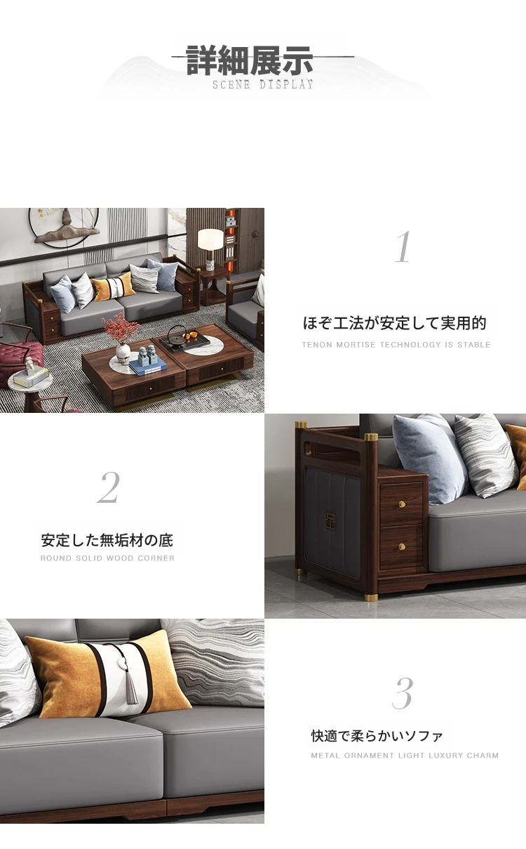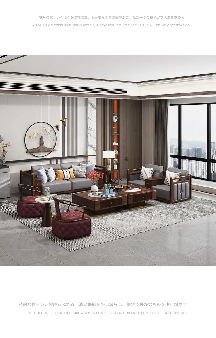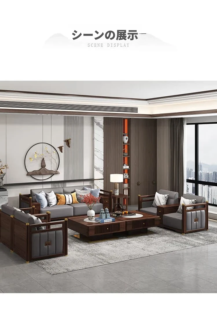2025年新作!新中式スタイルの高級感あふれるソファー - 軽やかな実木とブラックウォールナットの皮革を使用した、シンプルで洗練された別荘リビングにぴったりのデザイン。