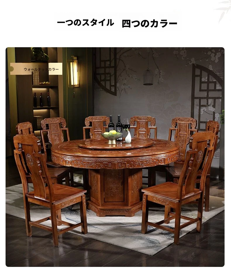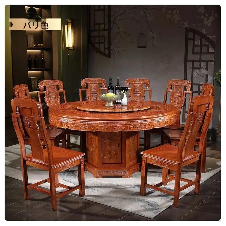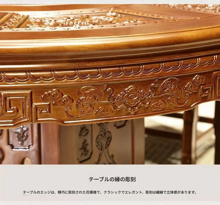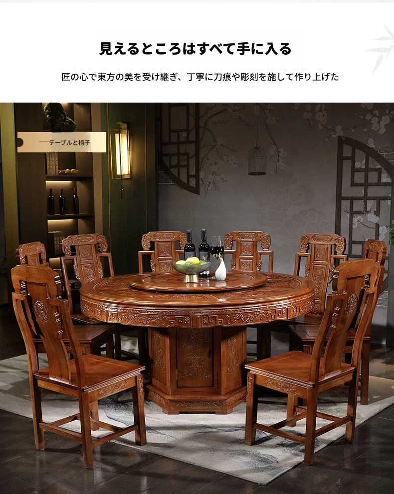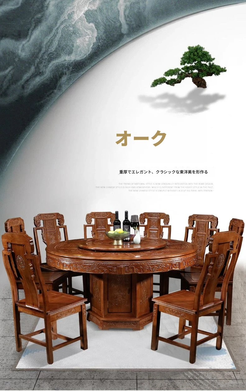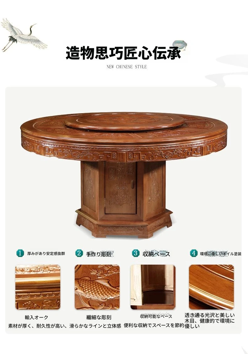 中華スタイルの無垢オーク製丸型ダイニングテーブルセット - エレガントな彫刻と回転プレート付きで、家族や友人との食事を贅沢に楽しむ!