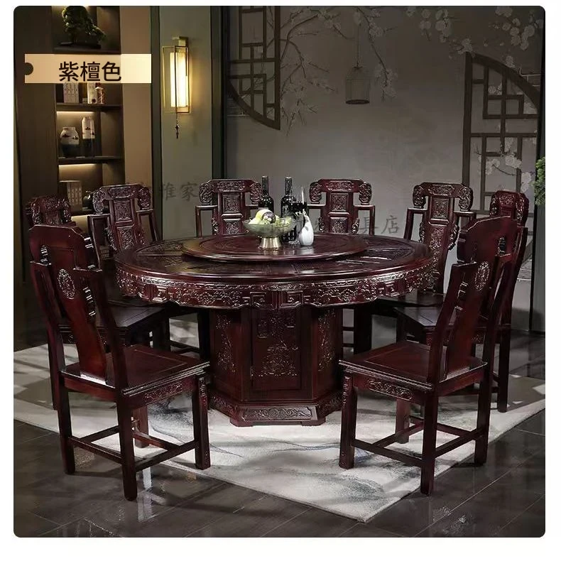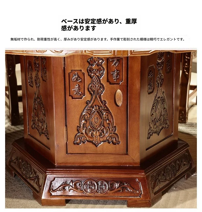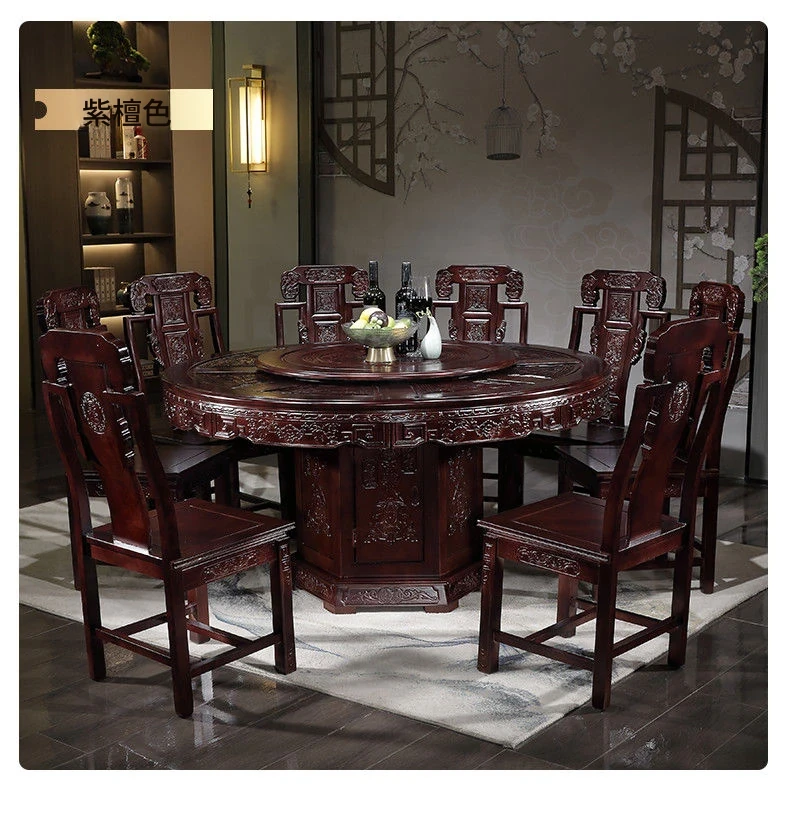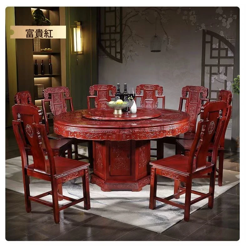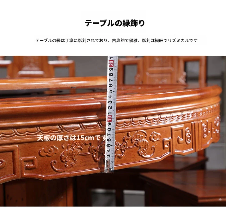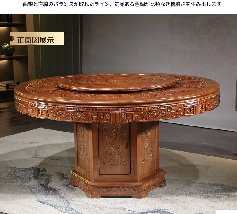 中華スタイルの無垢オーク製丸型ダイニングテーブルセット - エレガントな彫刻と回転プレート付きで、家族や友人との食事を贅沢に楽しむ!