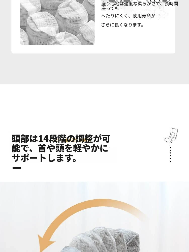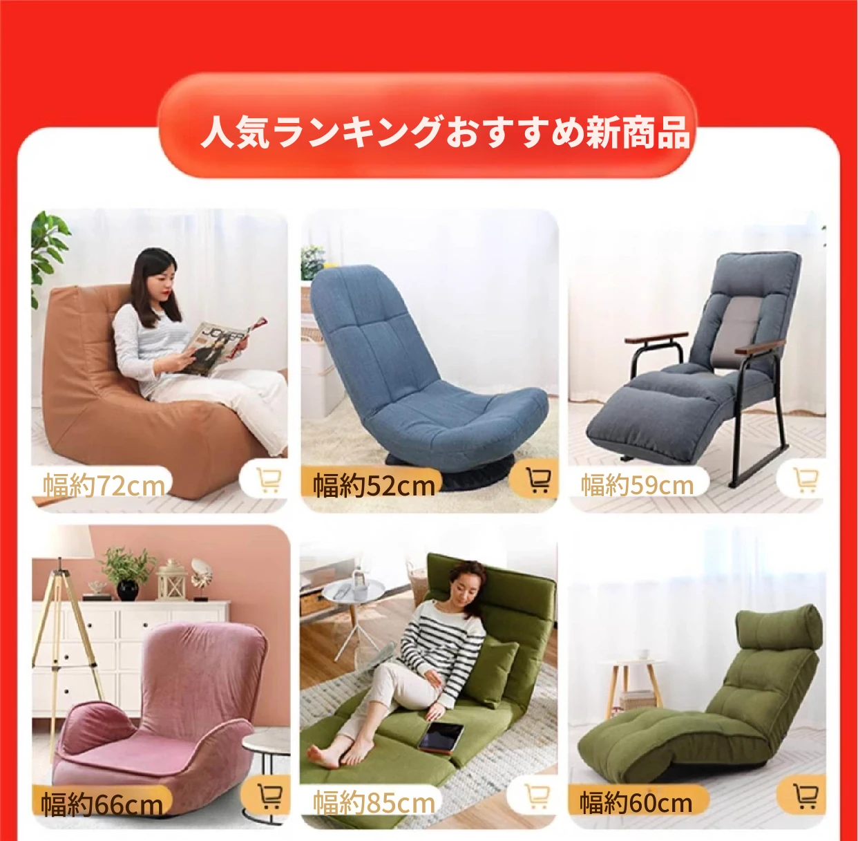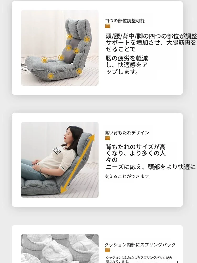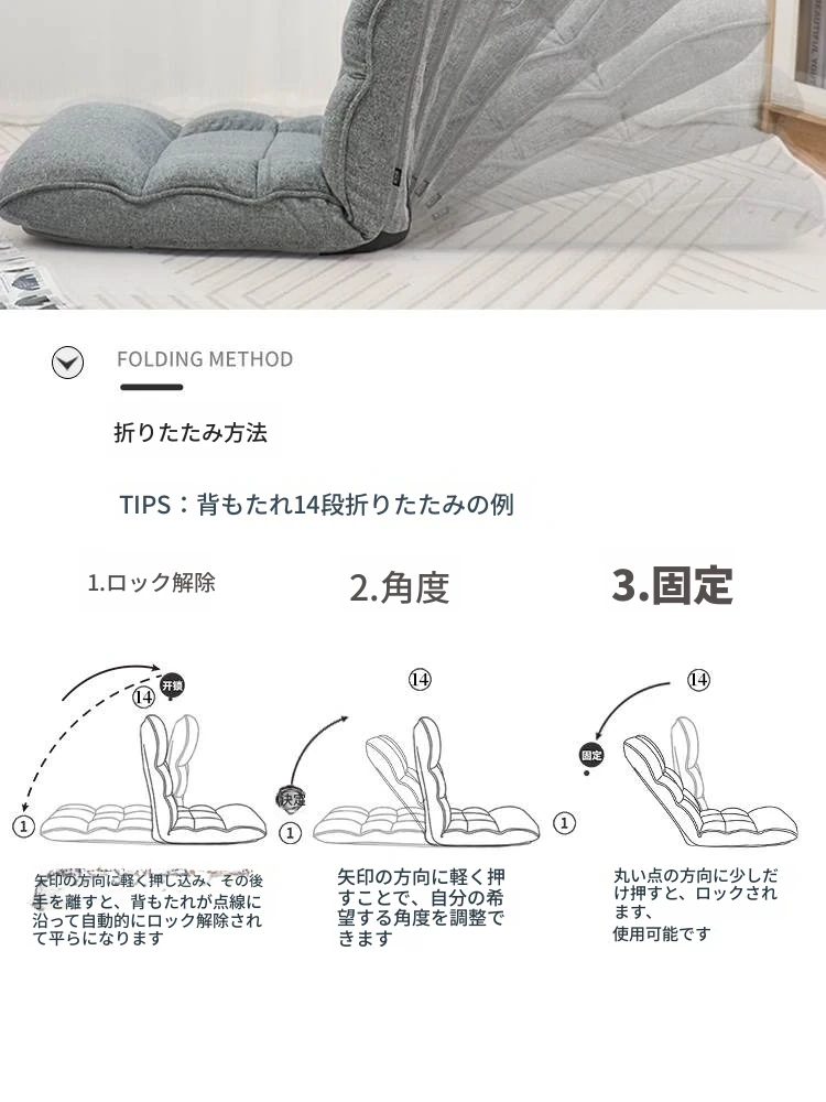 腰を守るリラックス・ソファ!折りたたみ式で、窓辺やベッドサイドにぴったり。快適な座り心地で読書やリラックスタイムをサポートします。タタミにも合うデザインで、どんな空間にもマッチ!