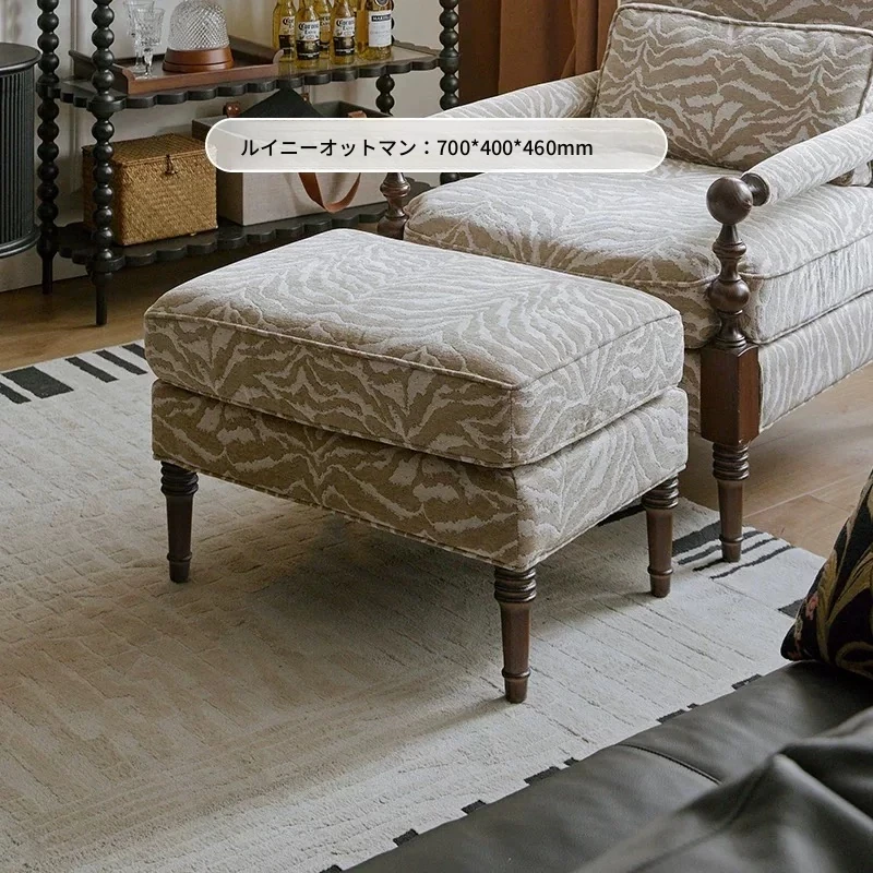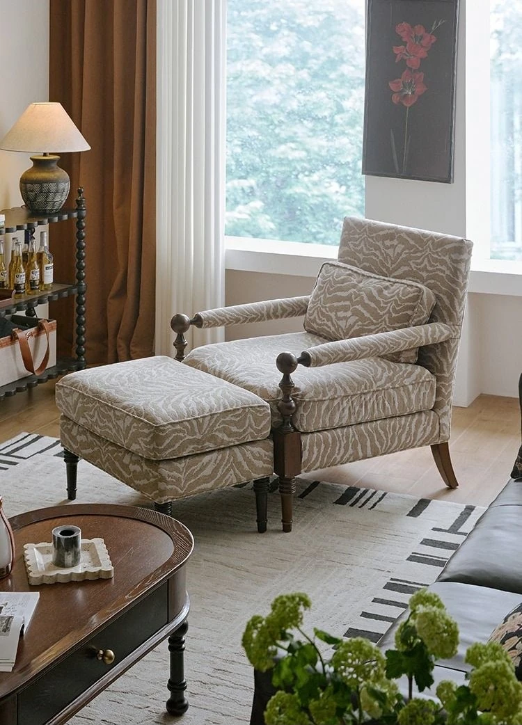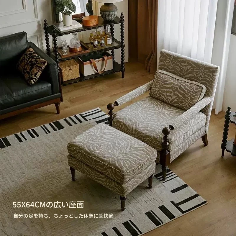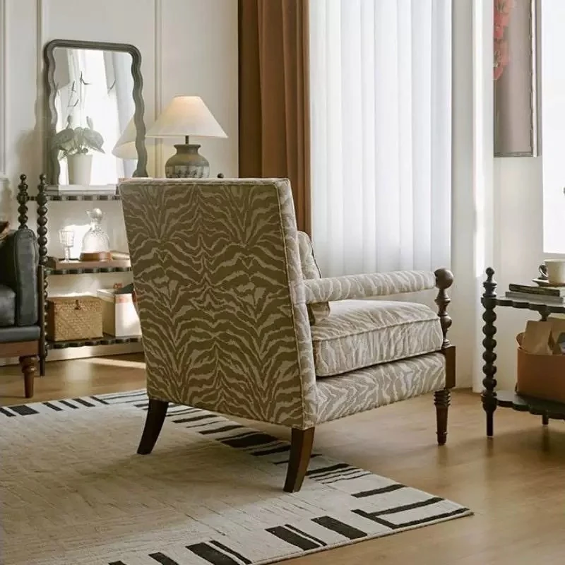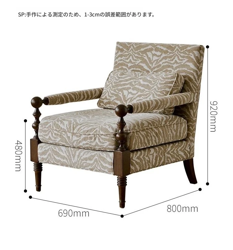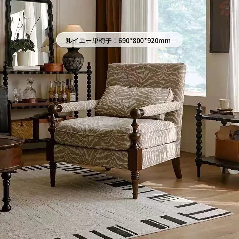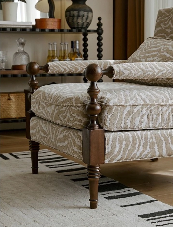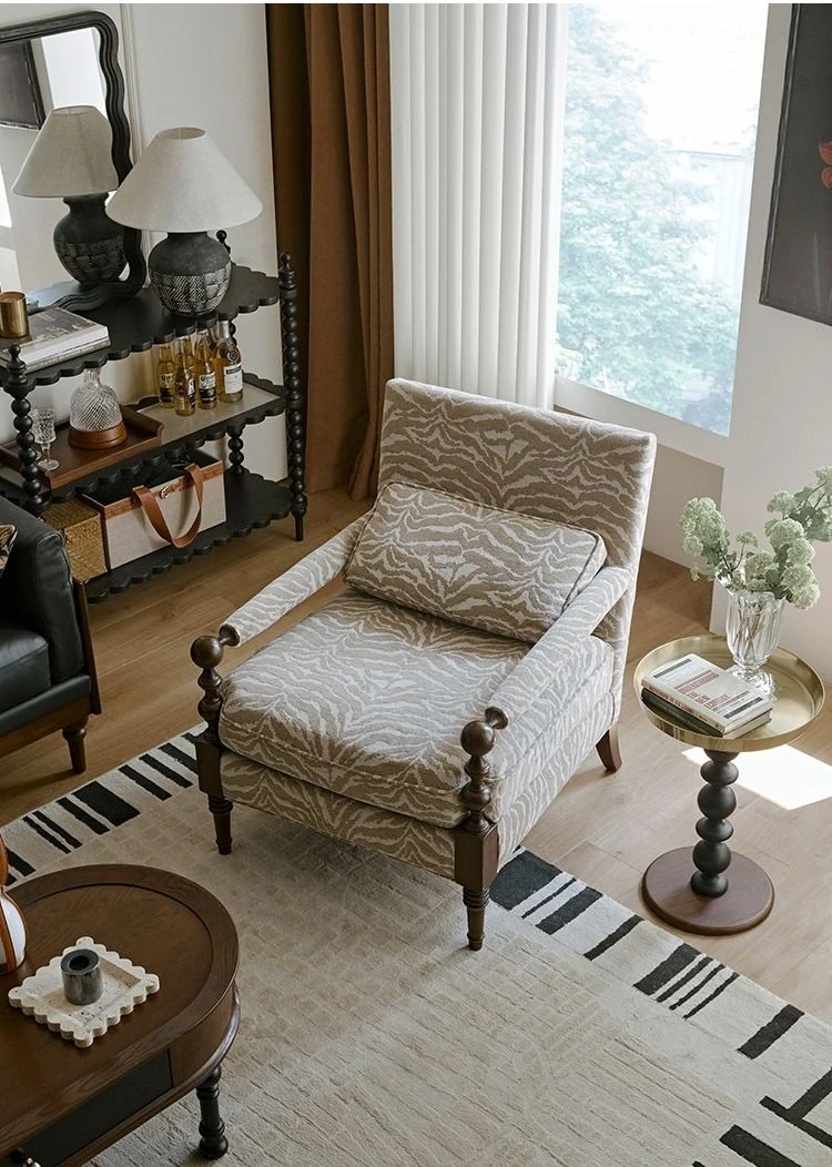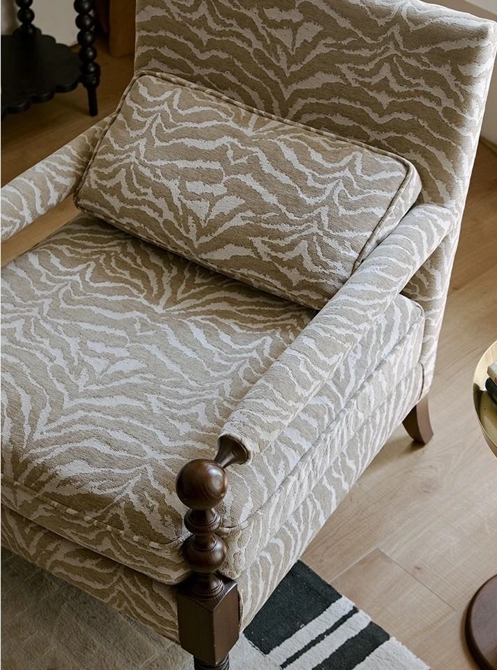 フレンチヴィンテージ風ウッドリビングアームチェア|高級感漂う虎柄デザイン|アメリカンスタイルのファブリックソファ|ホワイトアッシュ材使用|居心地抜群のリラックス空間を演出!