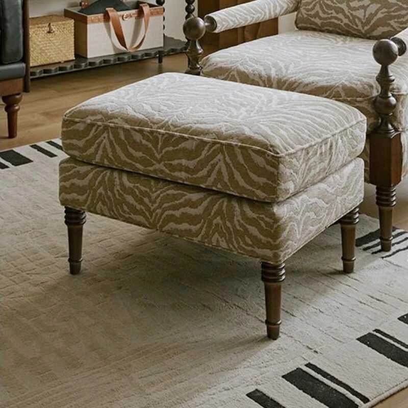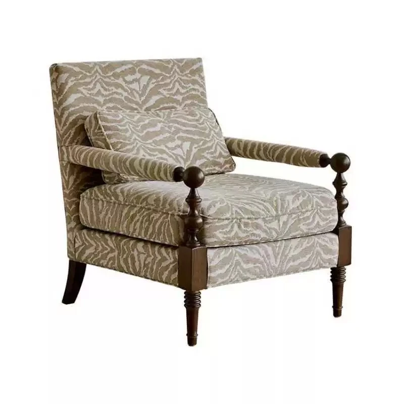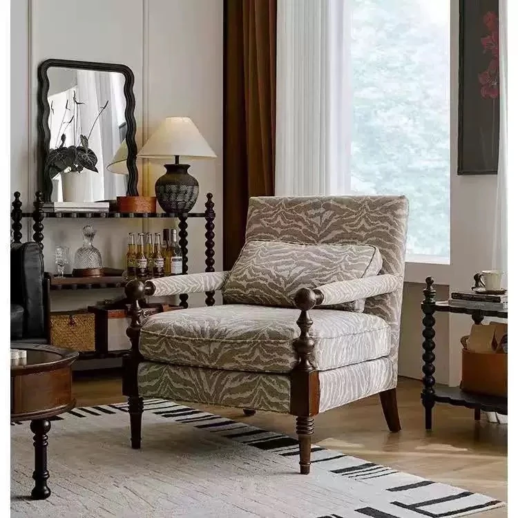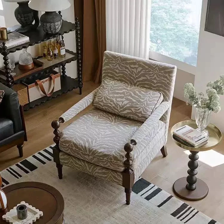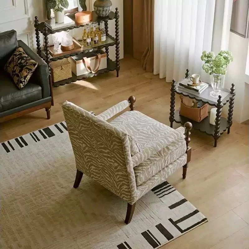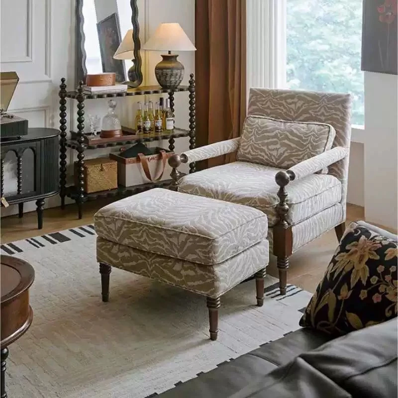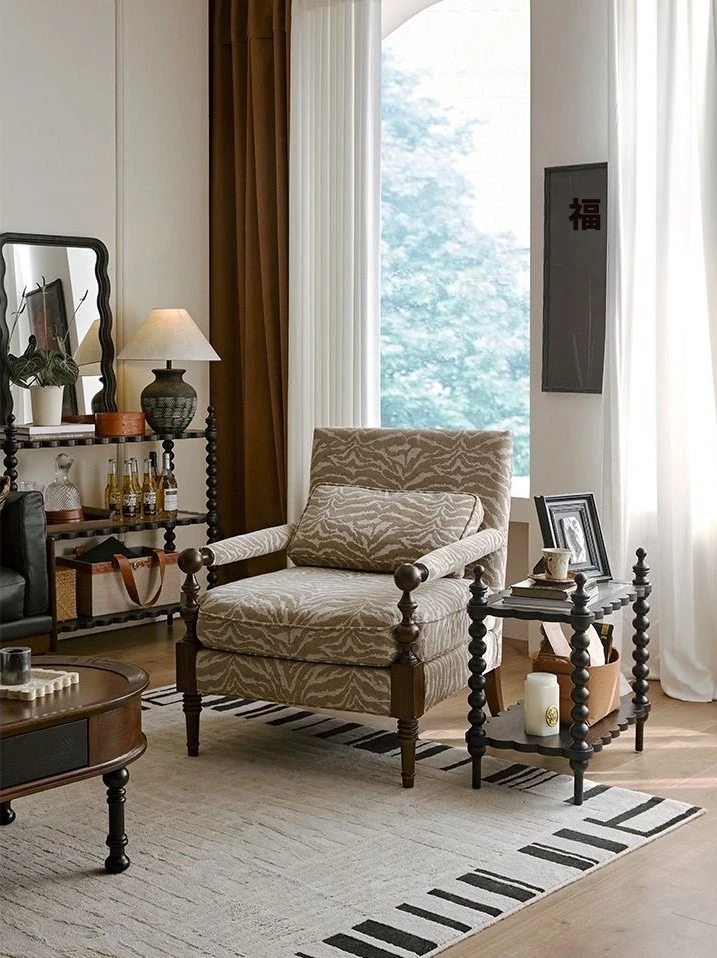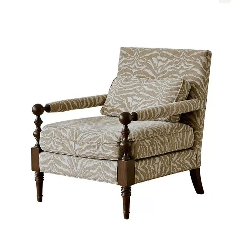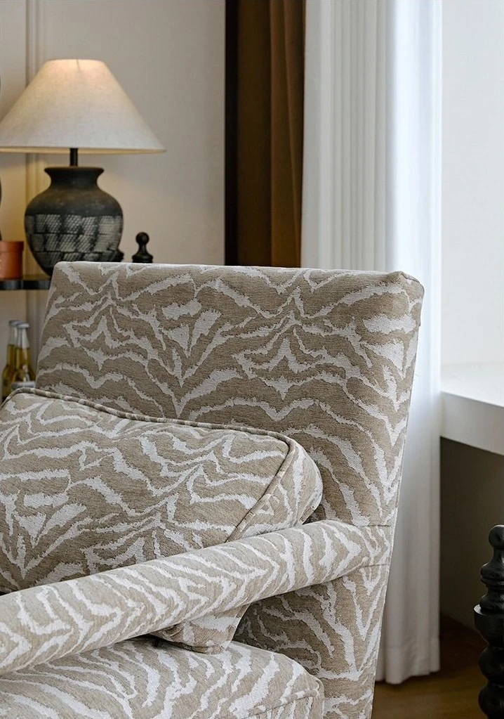 フレンチヴィンテージ風ウッドリビングアームチェア|高級感漂う虎柄デザイン|アメリカンスタイルのファブリックソファ|ホワイトアッシュ材使用|居心地抜群のリラックス空間を演出!