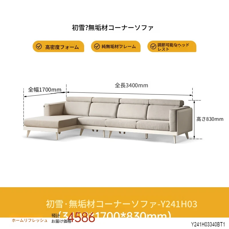 【源氏木语x维莎】贅沢な全実木フレーム!クリームカラーの布製コーナーソファ - リビングにぴったりな4人掛け