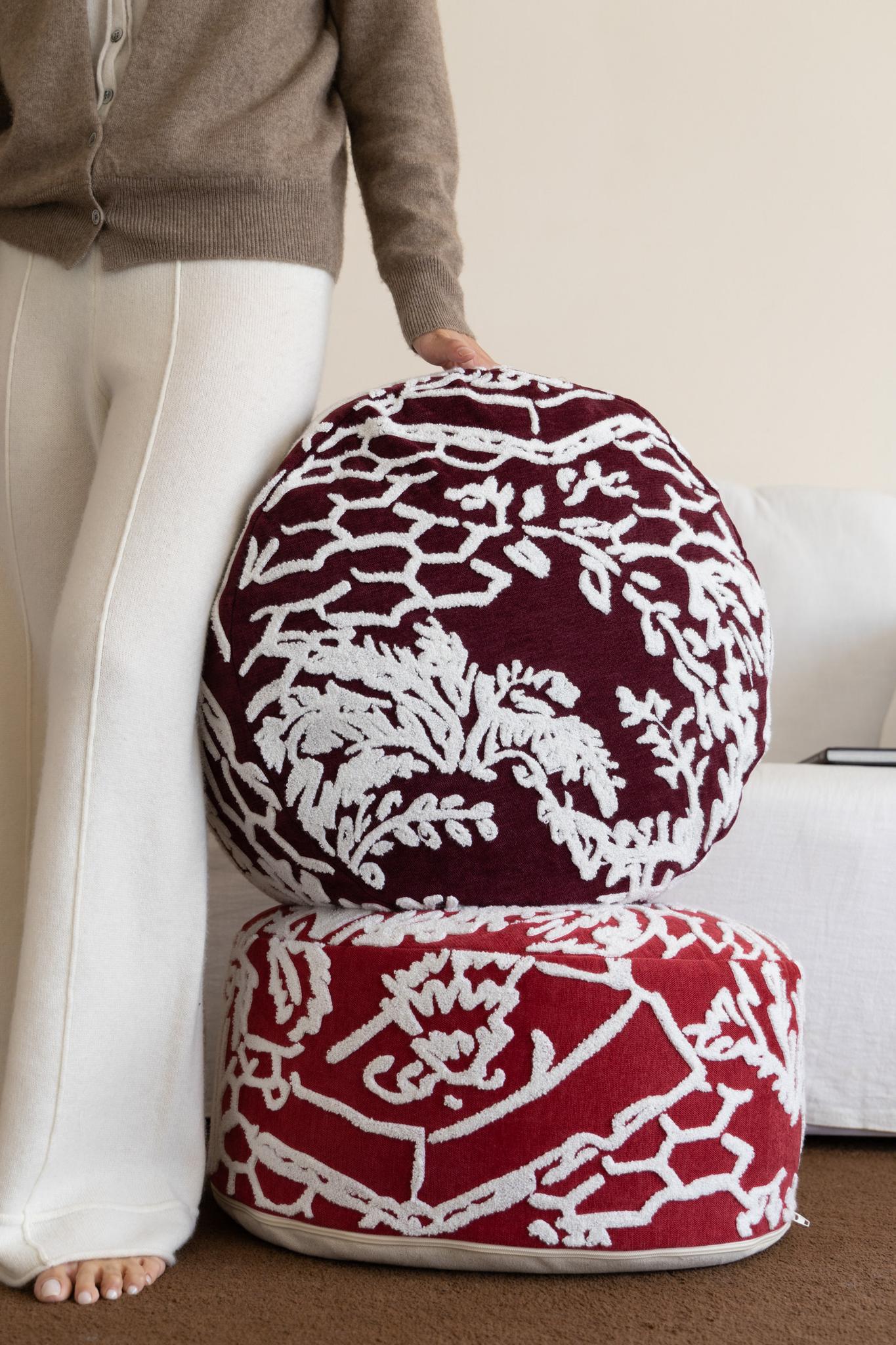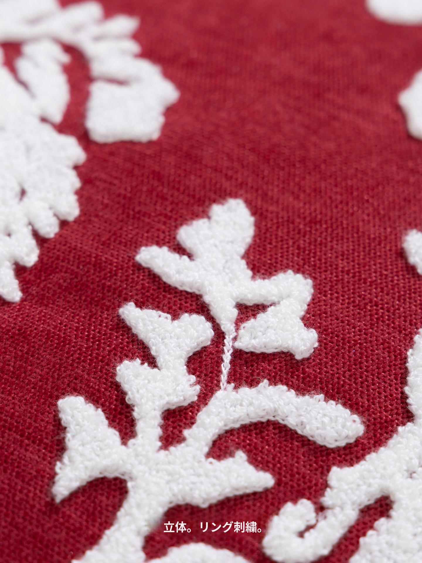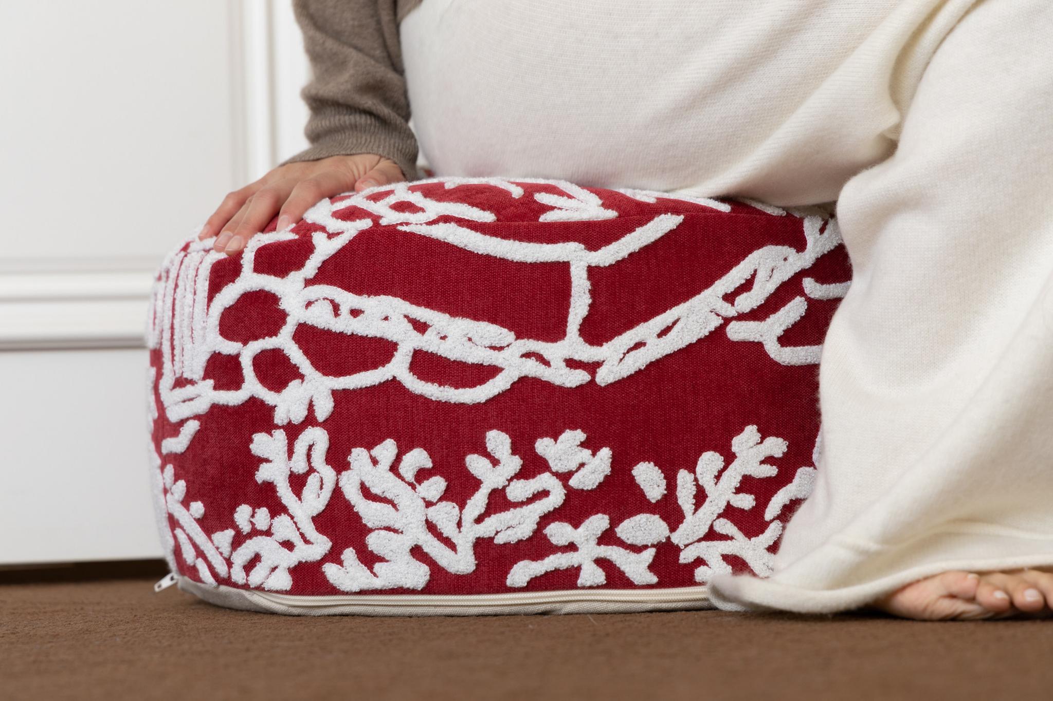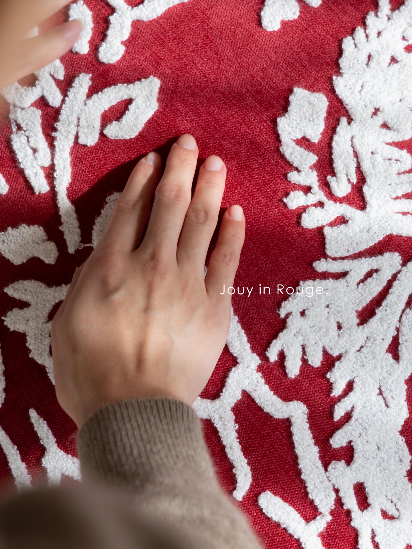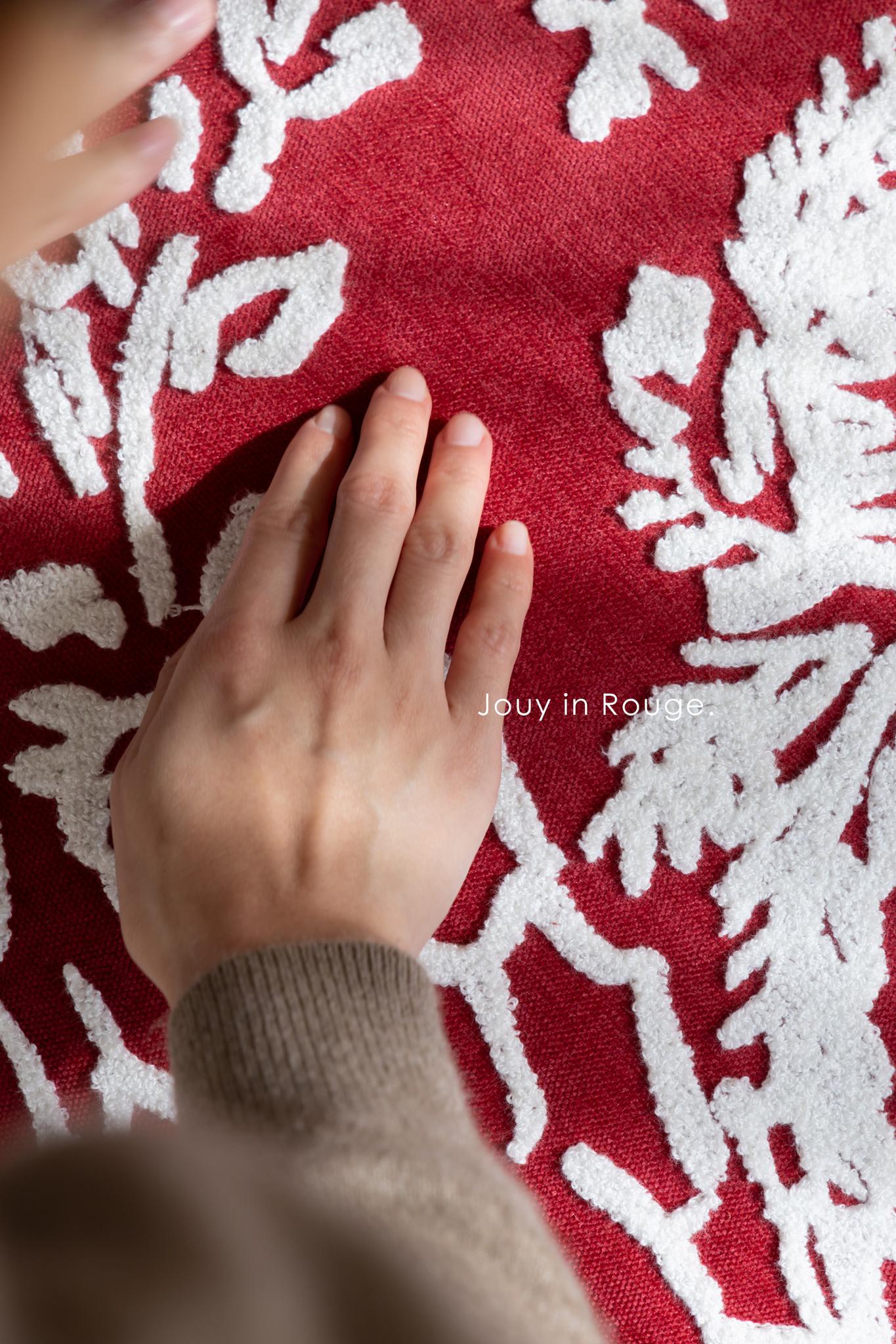 若奈Jouy in Rouge「茹伊绣墩」フレンチスタイルのキャニオンレッド/ウッドマホガニー色 手作り刺繍クッション。心地よい座り心地と洗練されたデザインで、あなたのインテリアに華やかさをプラス!