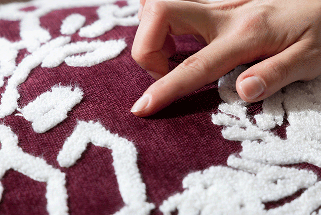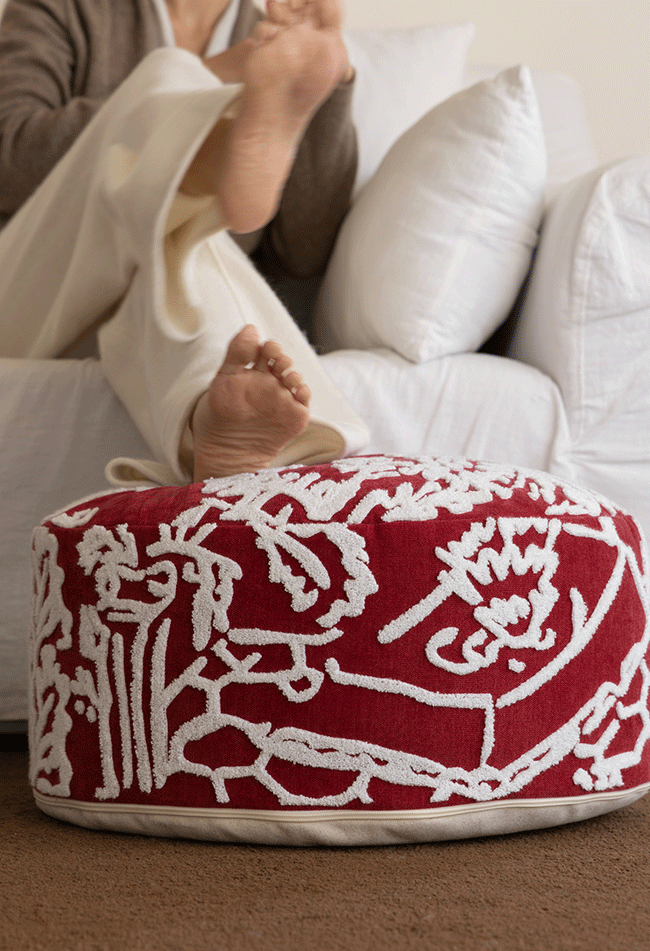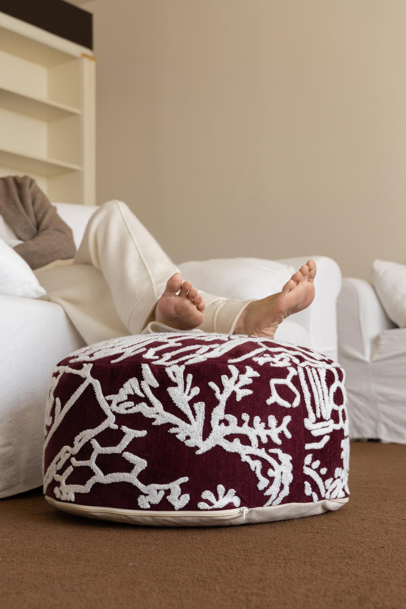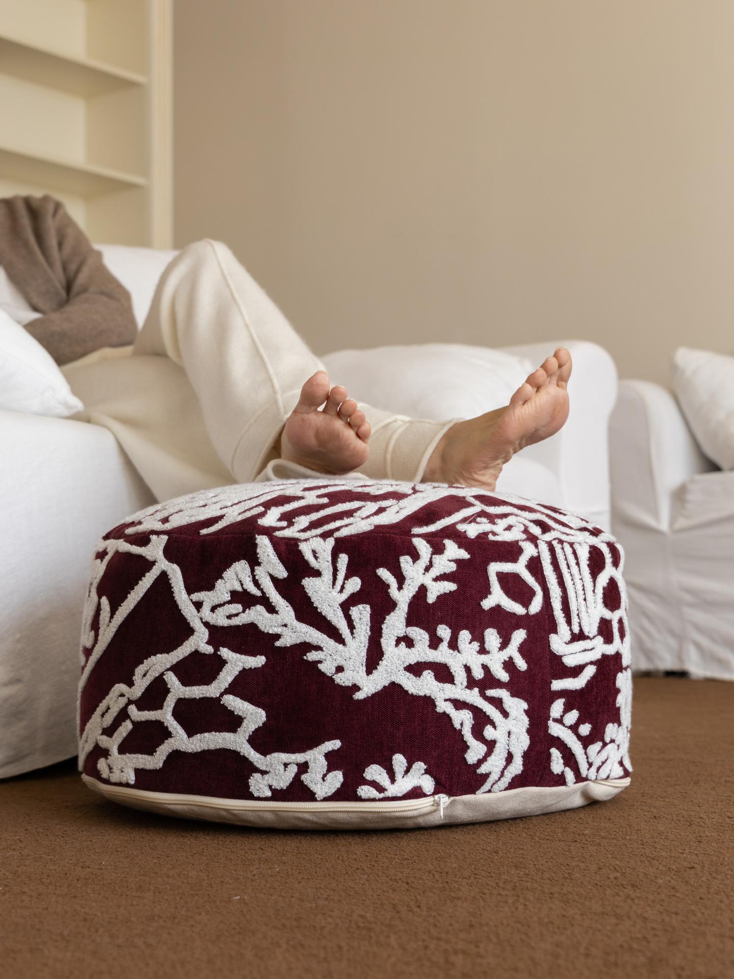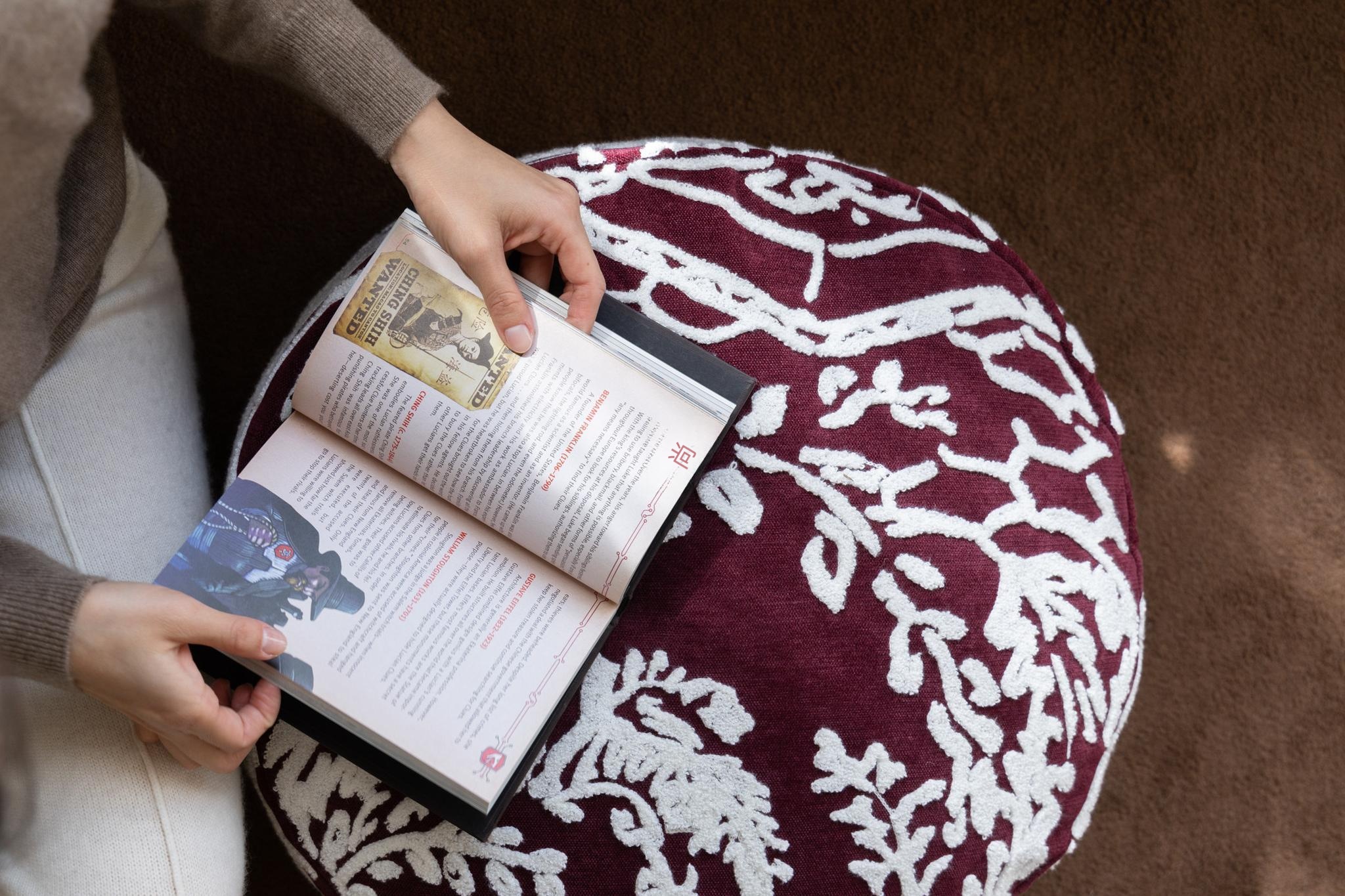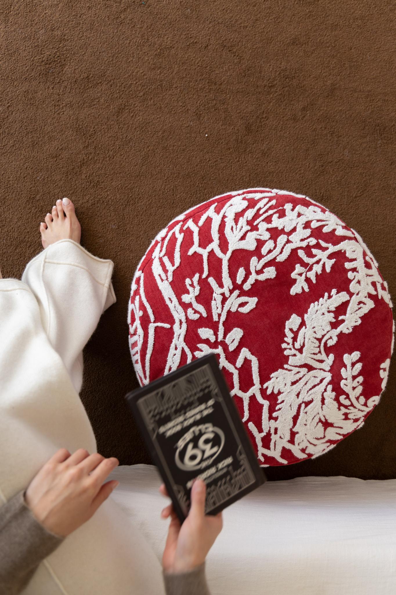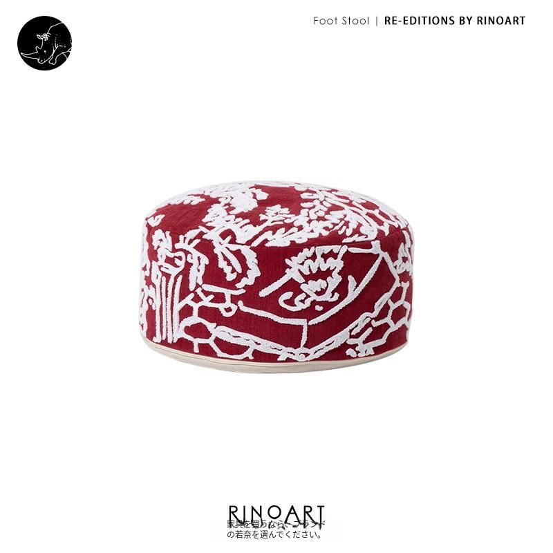 若奈Jouy in Rouge「茹伊绣墩」フレンチスタイルのキャニオンレッド/ウッドマホガニー色 手作り刺繍クッション。心地よい座り心地と洗練されたデザインで、あなたのインテリアに華やかさをプラス!