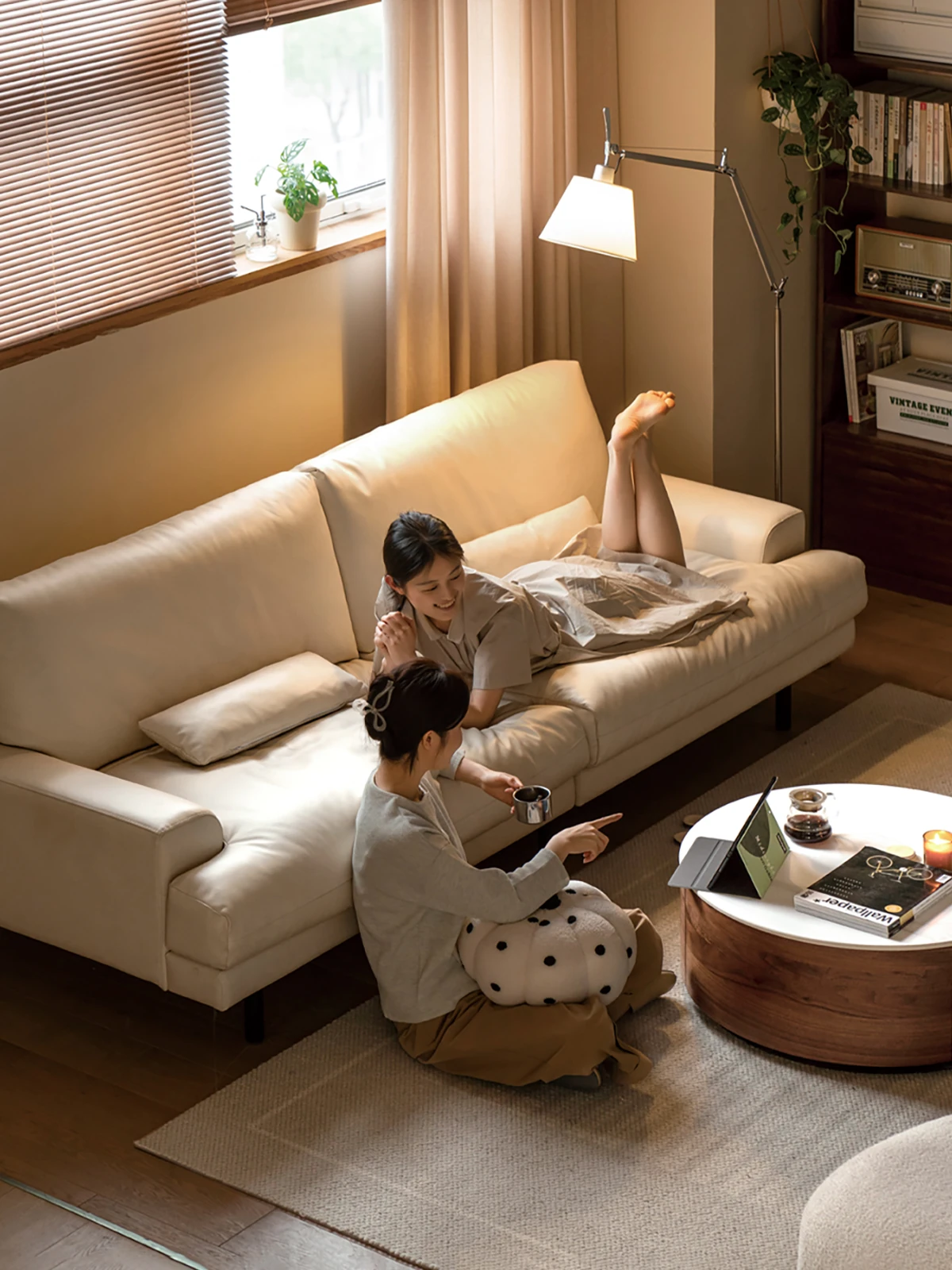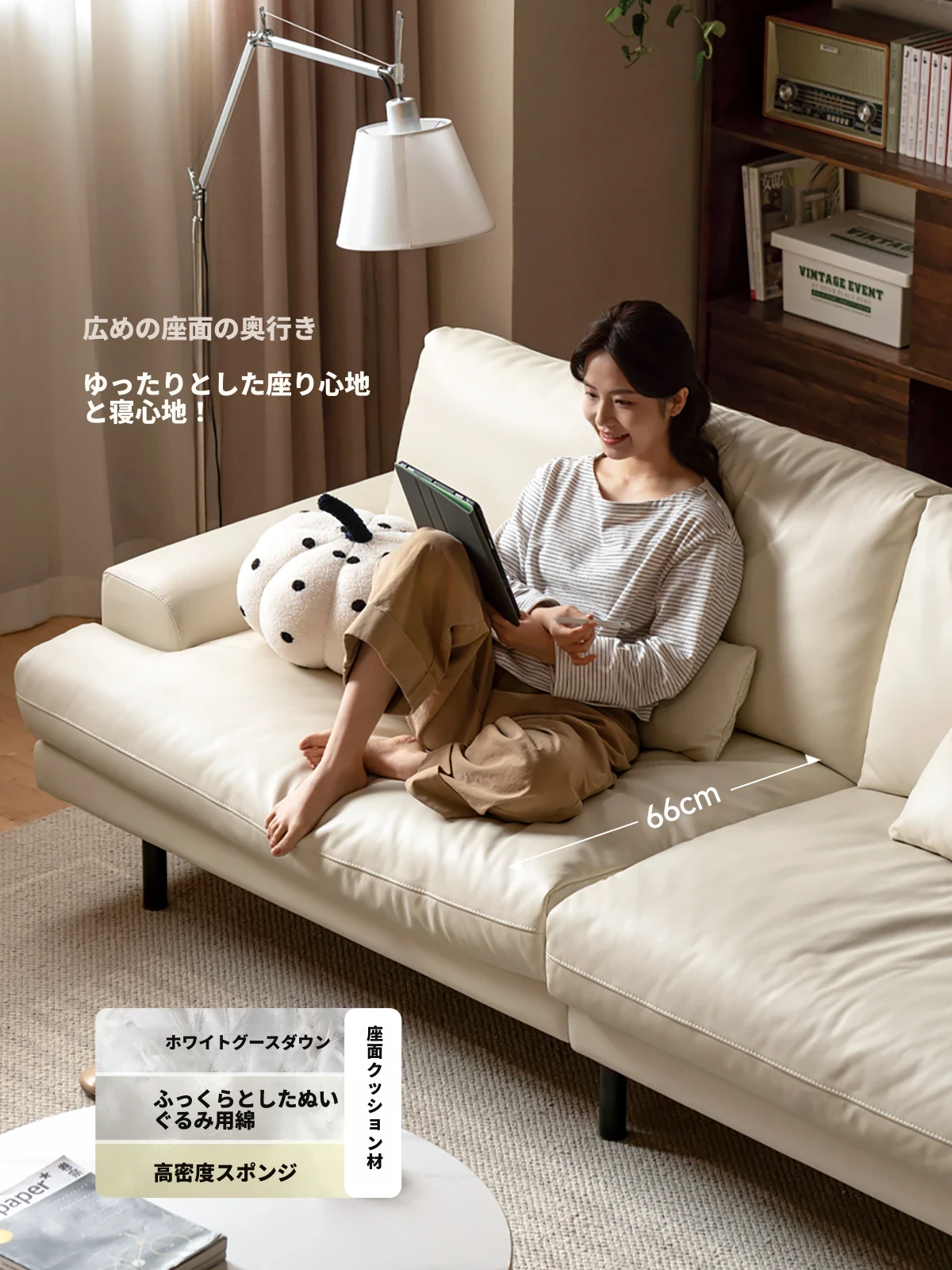 【心地よい極上体験】ヴィシャ本革ソファ - ナチュラルクリームカラー、頭層牛革使用、小型リビングにぴったりのエレガントな3人掛け白ソファ