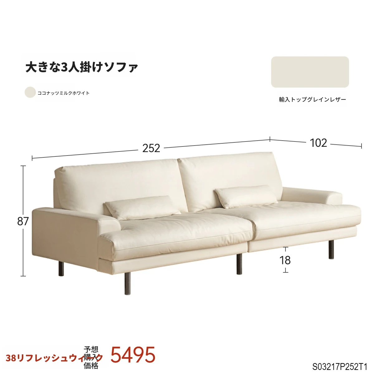 2.52メートル大型3人掛けソファ【ココナッツミルクホワイト-本革】(2520*1020*870mm)