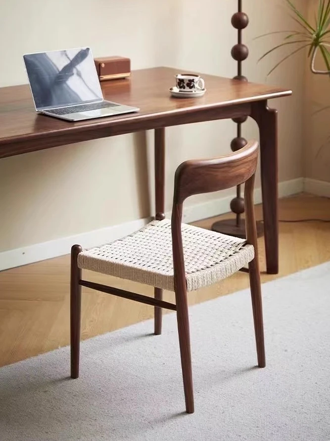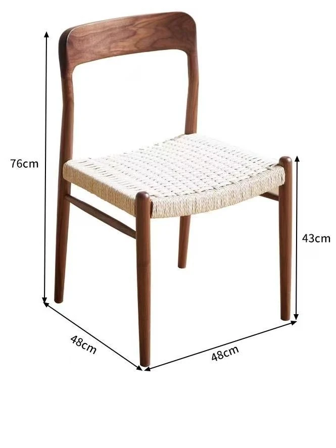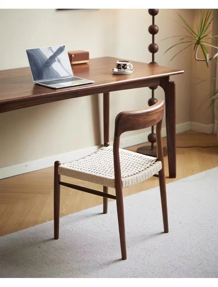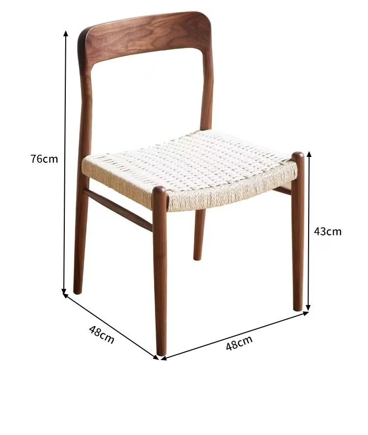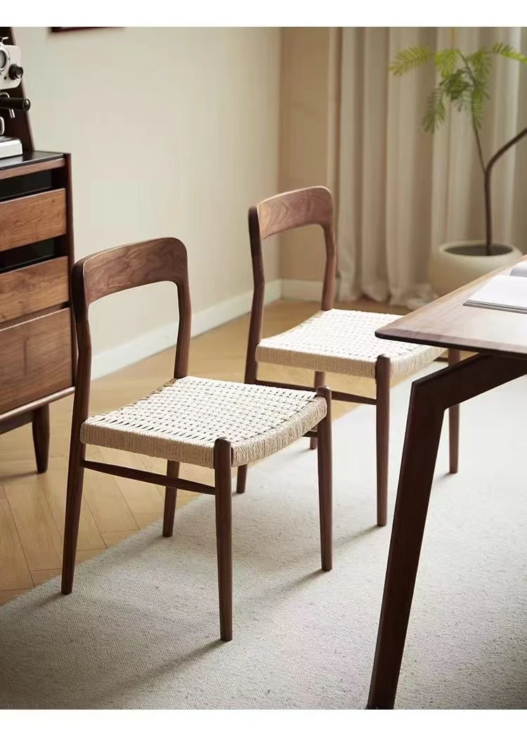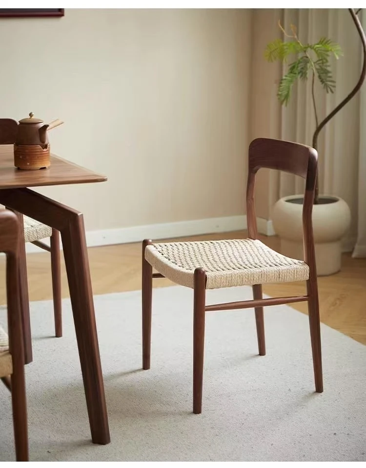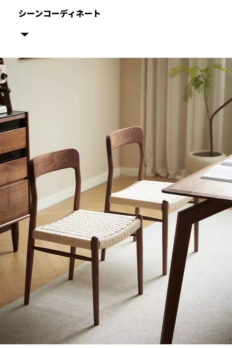 北米産ブラックウォールナット製のロープ編みチェア - シンプルでスタイリッシュなデザインの無垢材ダイニングチェア。家庭用や中古の背もたれチェア、書斎用の椅子としても最適!モダンなインテリアにぴったりの編み紐ダイニングチェアです。