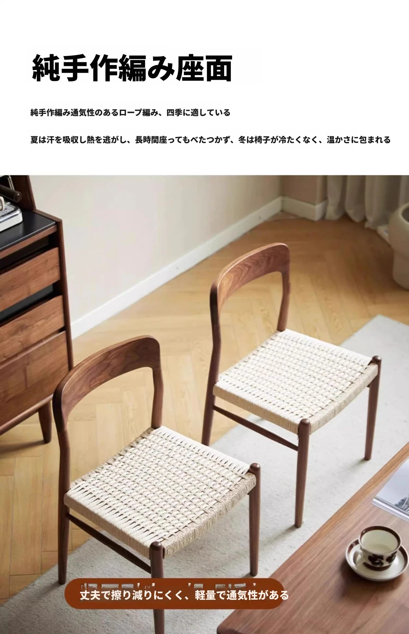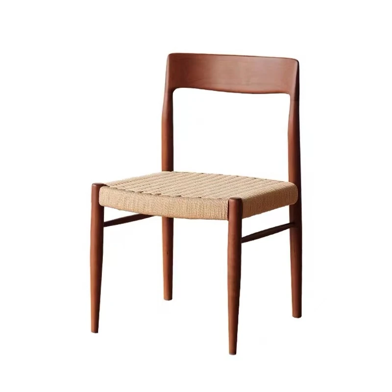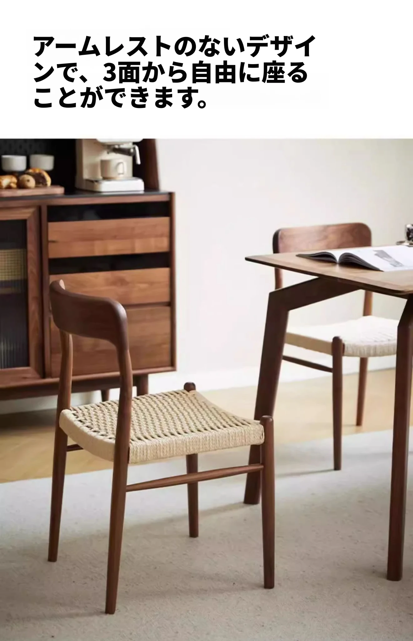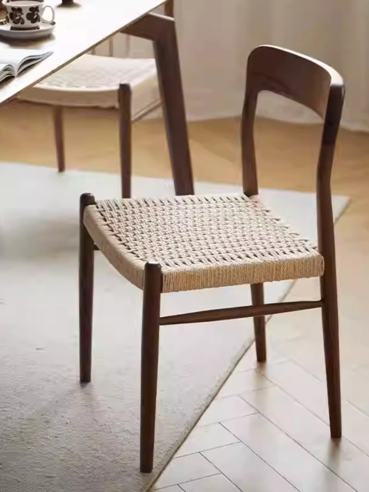 北米産ブラックウォールナット製のロープ編みチェア - シンプルでスタイリッシュなデザインの無垢材ダイニングチェア。家庭用や中古の背もたれチェア、書斎用の椅子としても最適!モダンなインテリアにぴったりの編み紐ダイニングチェアです。