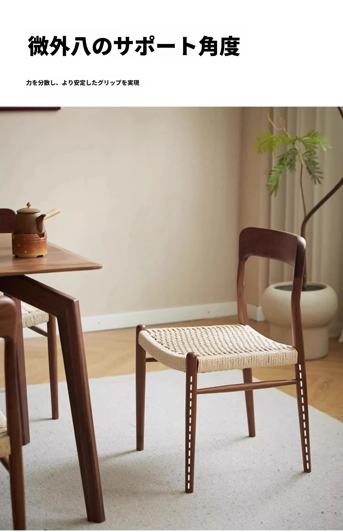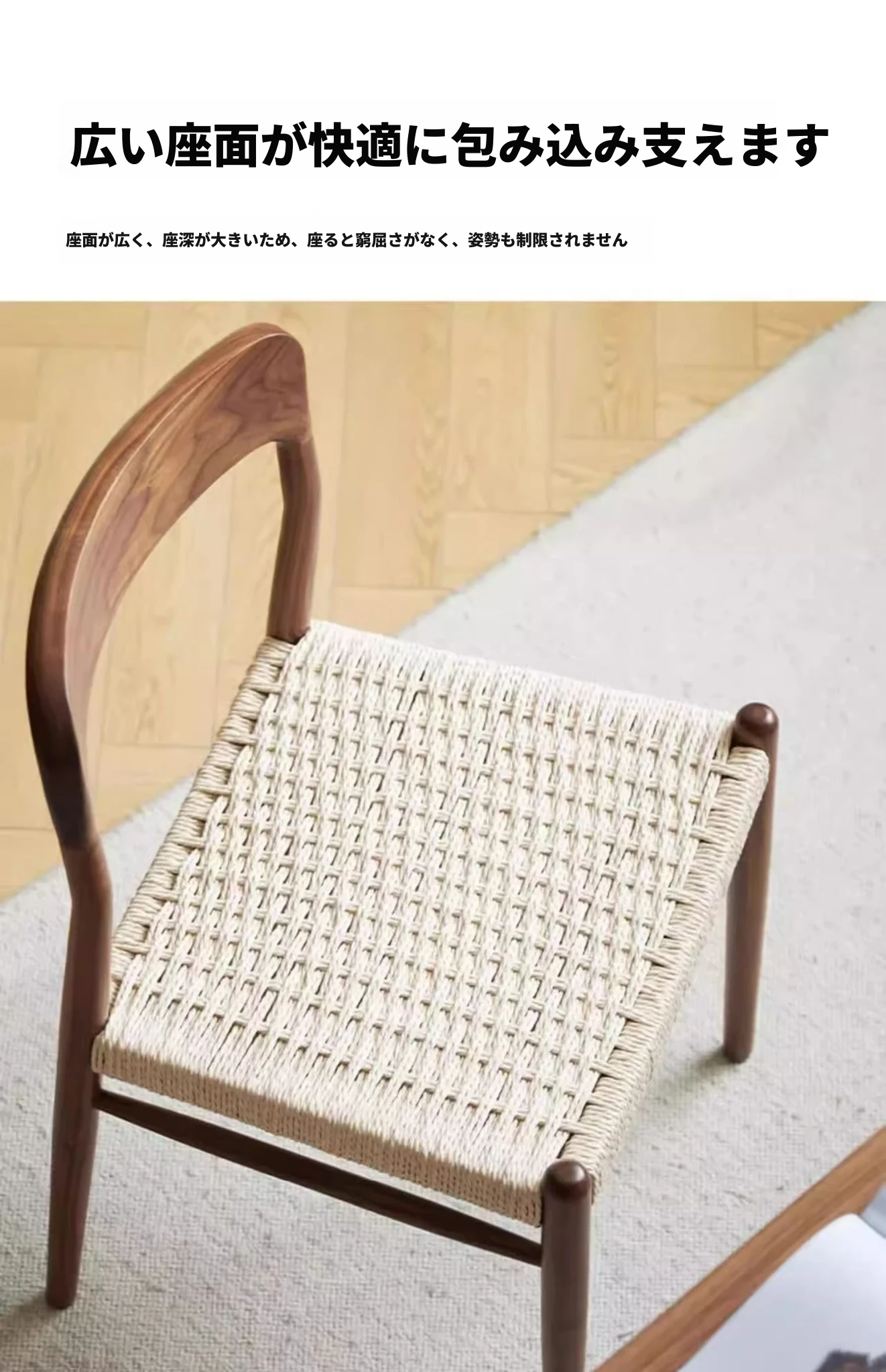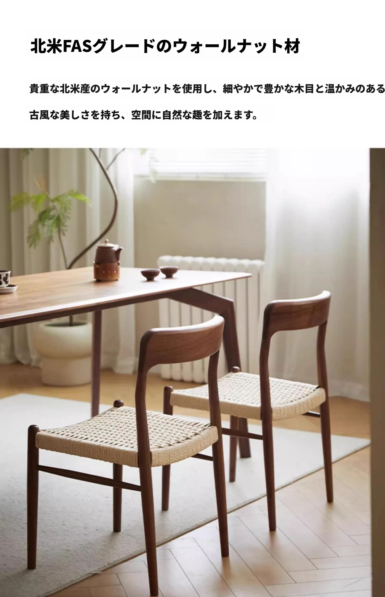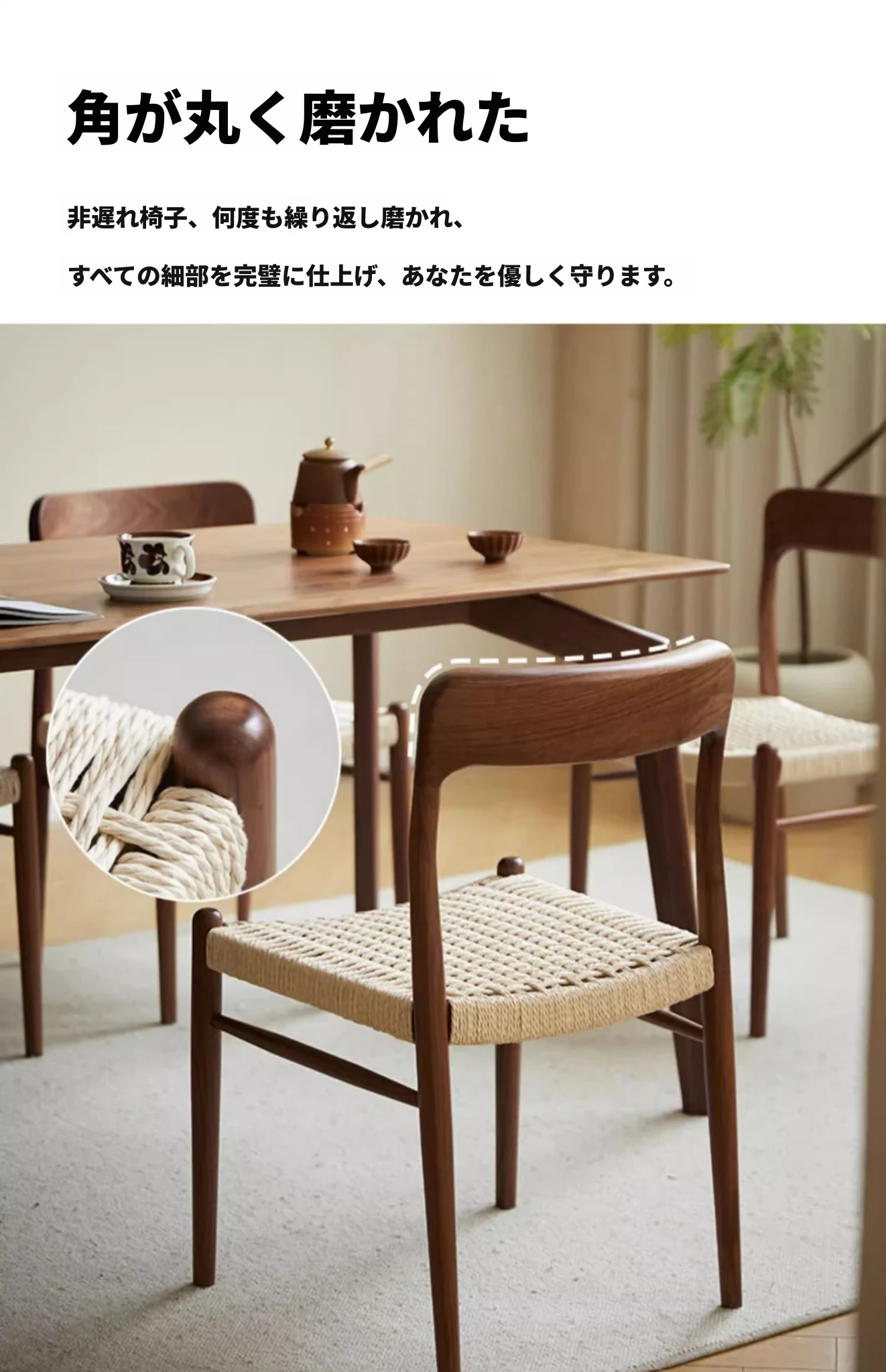 北米産ブラックウォールナット製のロープ編みチェア - シンプルでスタイリッシュなデザインの無垢材ダイニングチェア。家庭用や中古の背もたれチェア、書斎用の椅子としても最適!モダンなインテリアにぴったりの編み紐ダイニングチェアです。