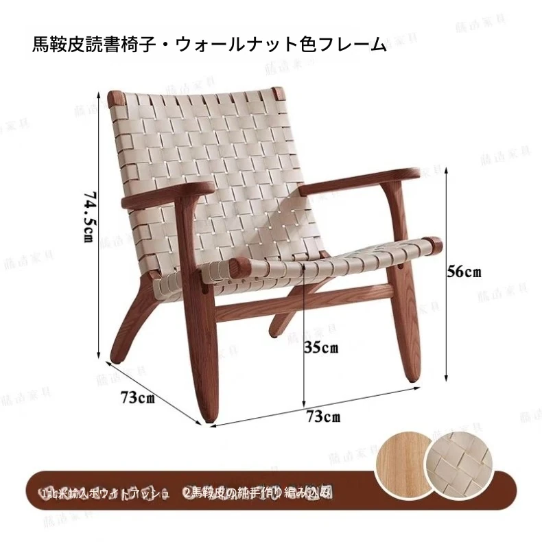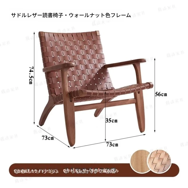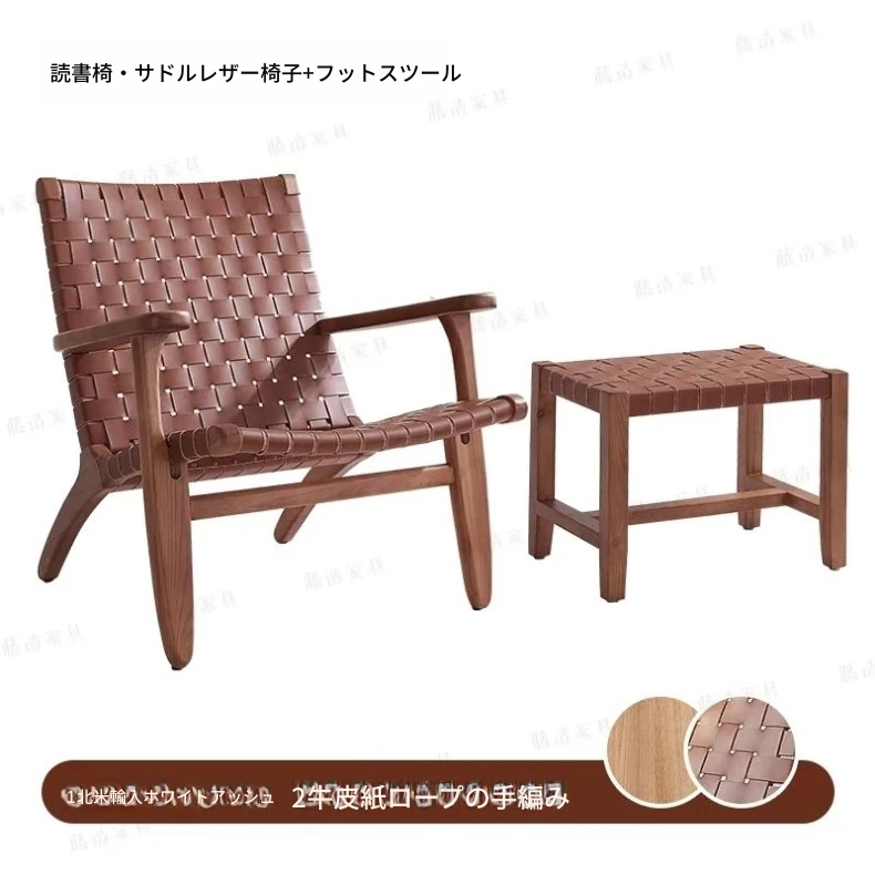 ホワイトアッシュ木製ソファチェア+(ウォールナット色)+ブラウン紐