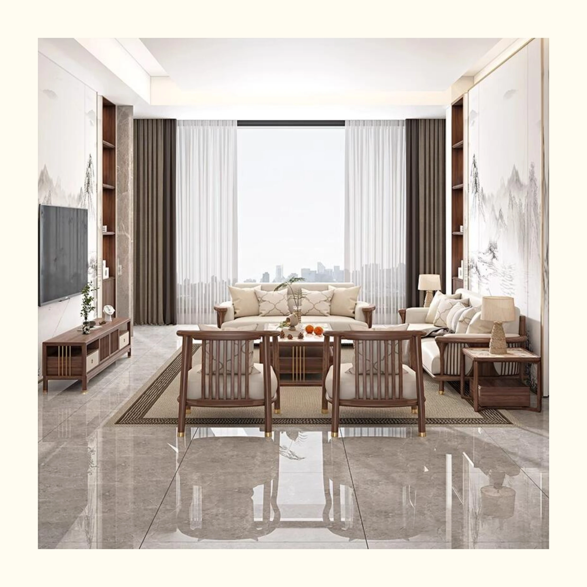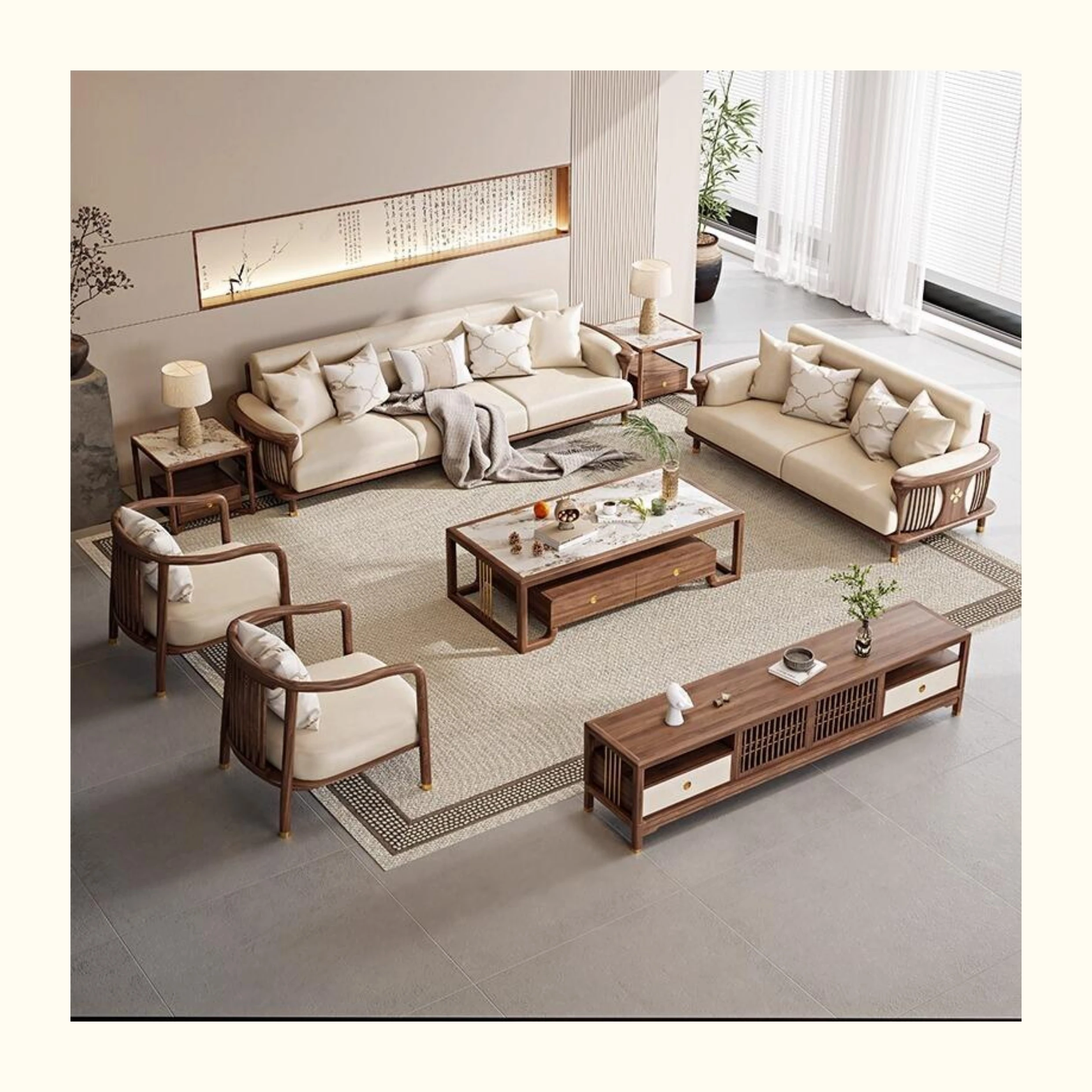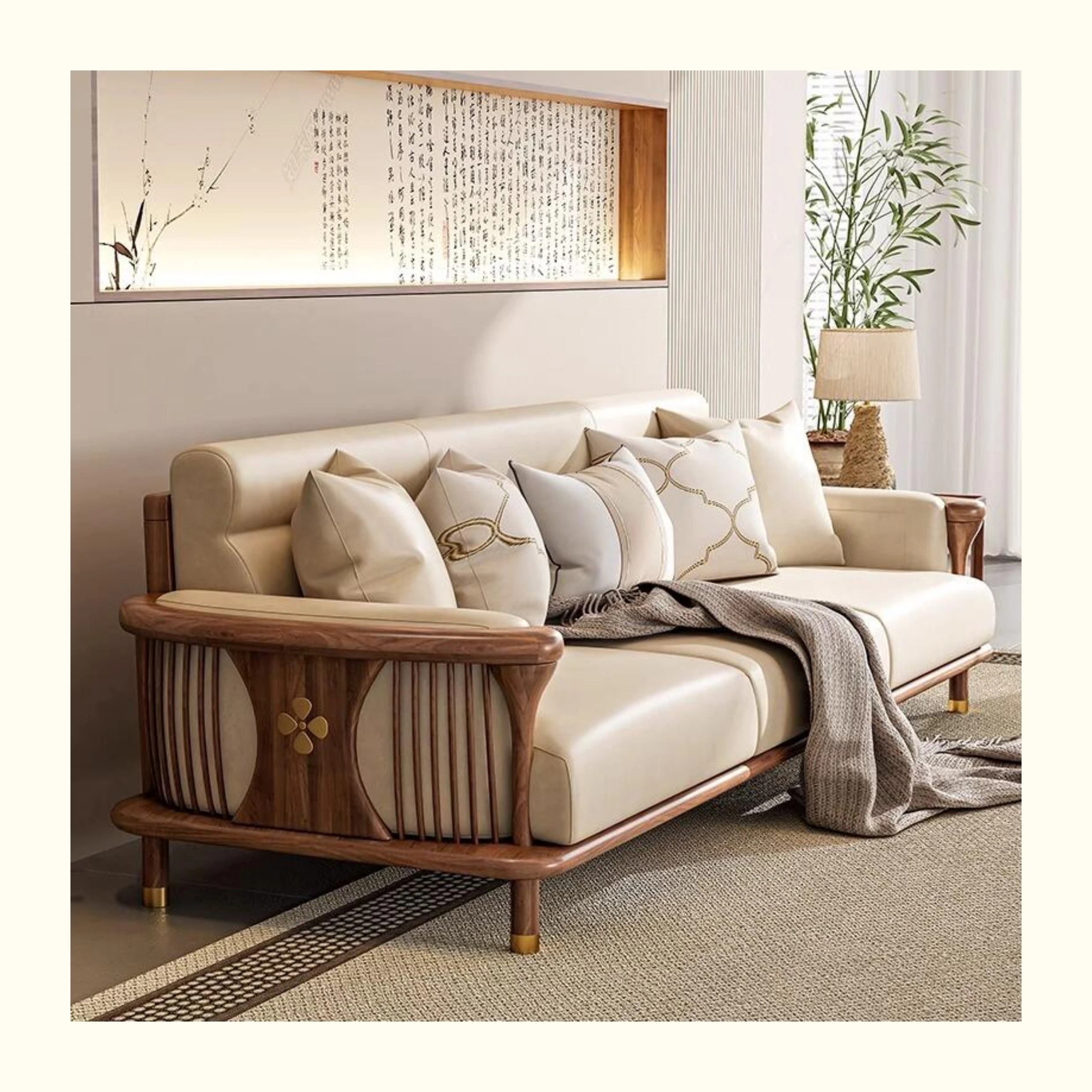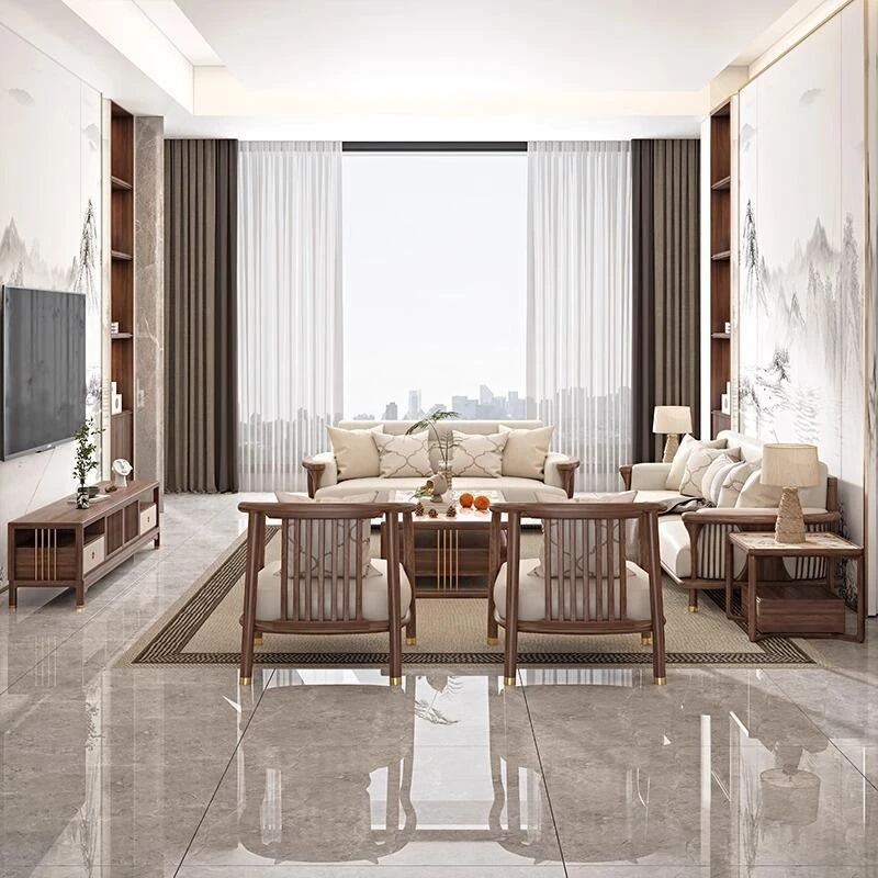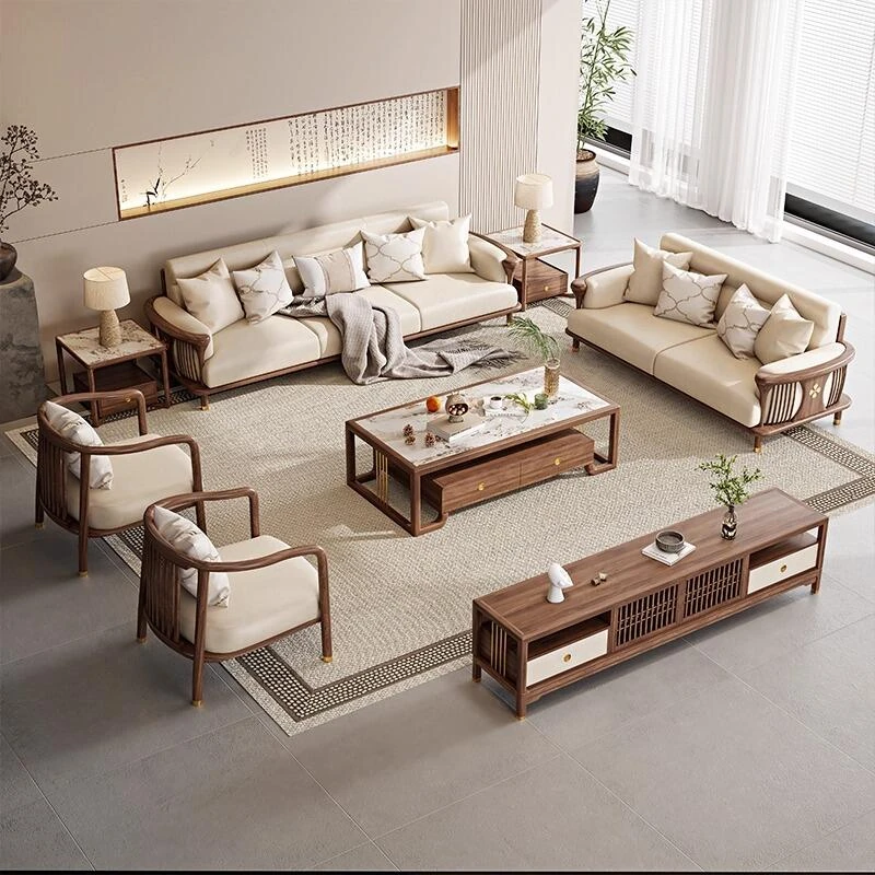 新中式の無垢材ソファセット - シンプルでラグジュアリーな禅の雰囲気、現代的な宋の美学を取り入れたクールなリビング家具、ウォールナット仕上げで心地よい空間を演出します。