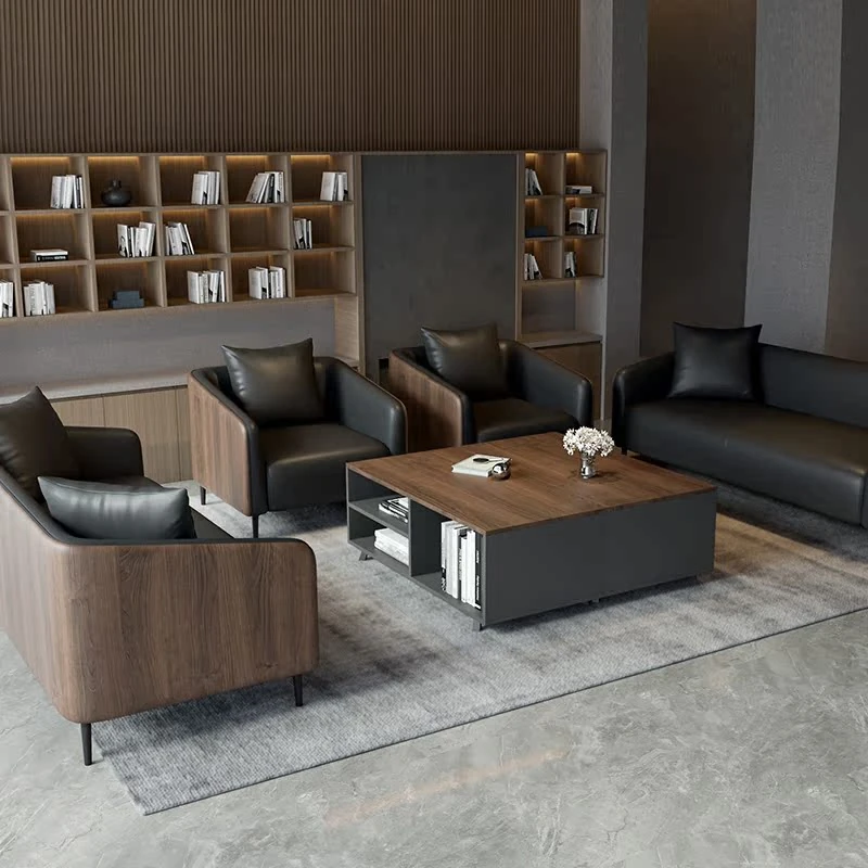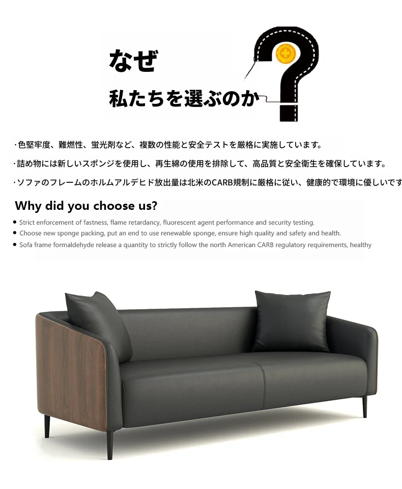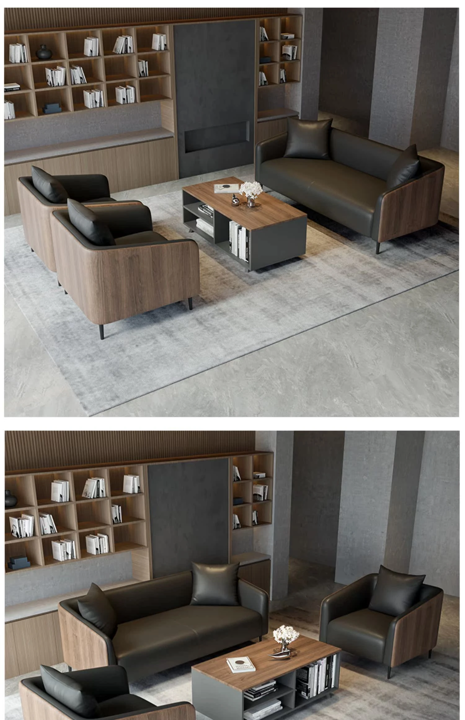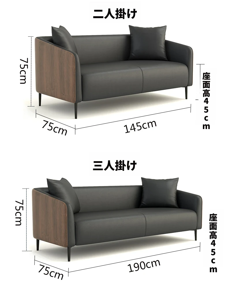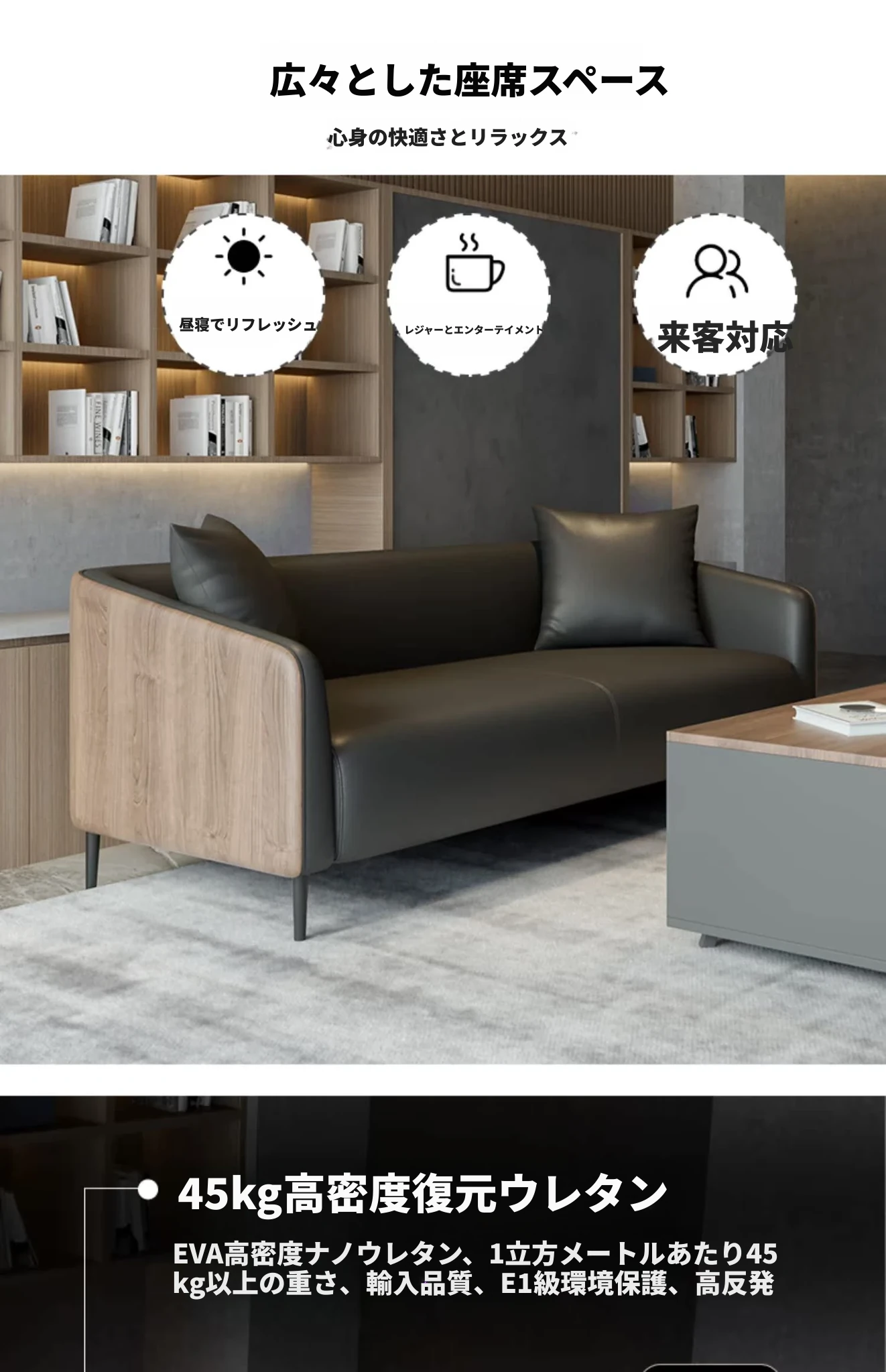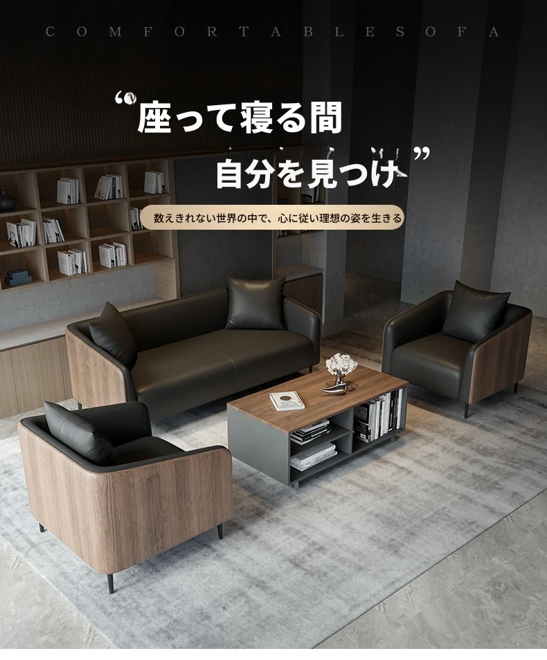 シンプルでモダンな木目調のビジネスソファ|3人掛けレザー家具|オフィスの接待室や会議スペースに最適!スタイリッシュなデザインで、快適な商談をサポートします。