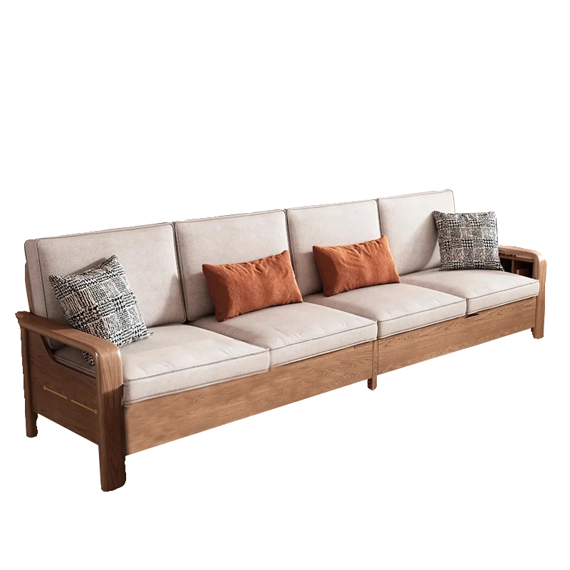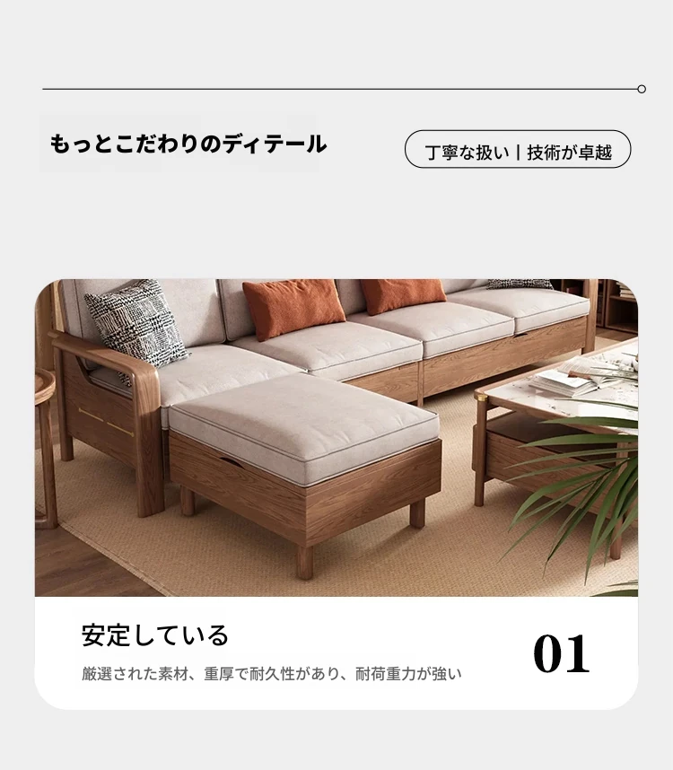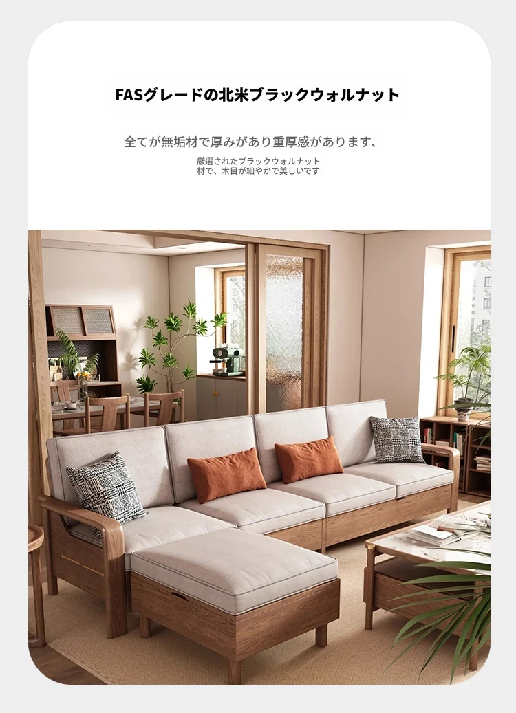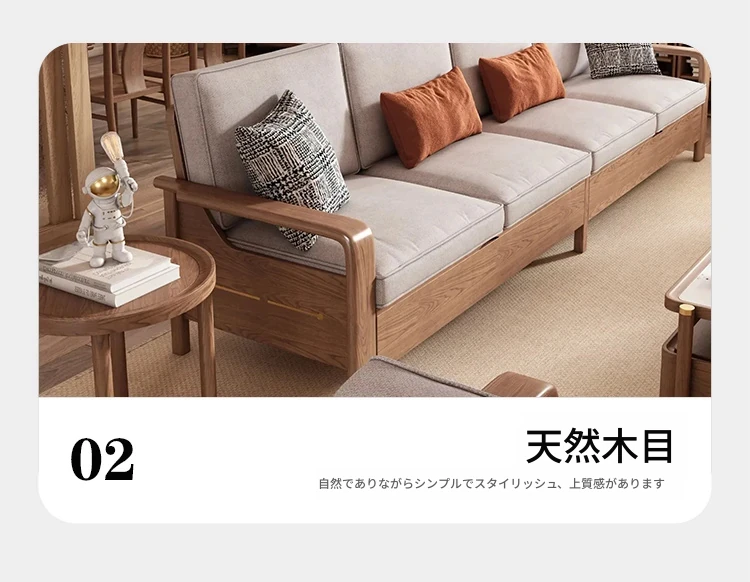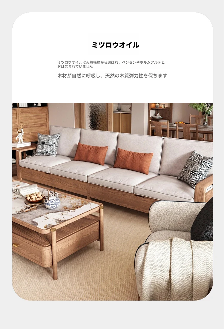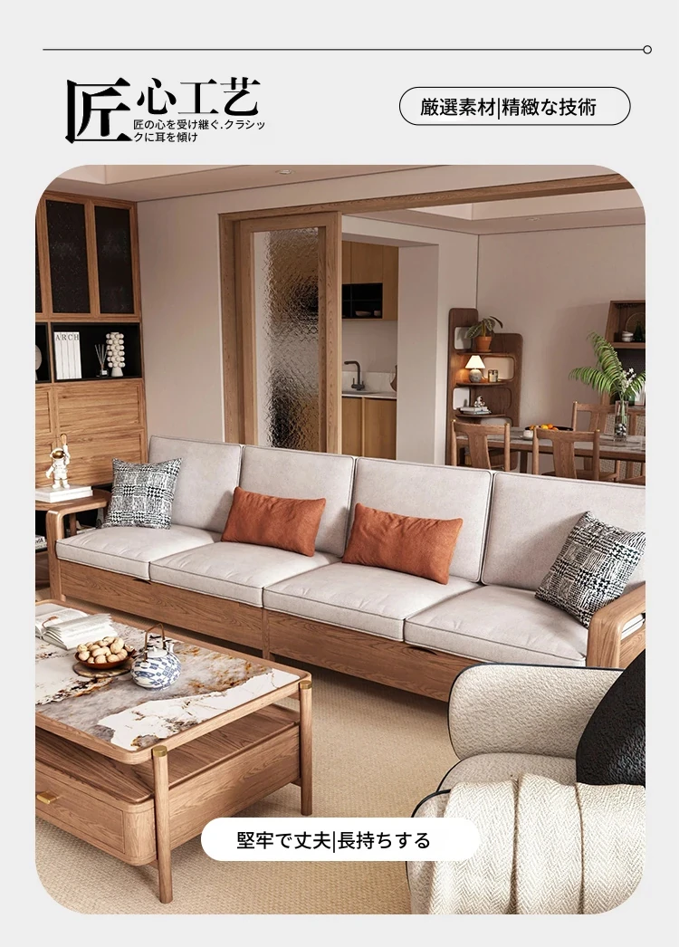 2025年新作!モダンミニマリストリビングソファ - 高級感あふれるライトラグジュアリーな天然木製ソファ、クリーミーなデザインとクッションが魅力!おしゃれな空間を演出します。