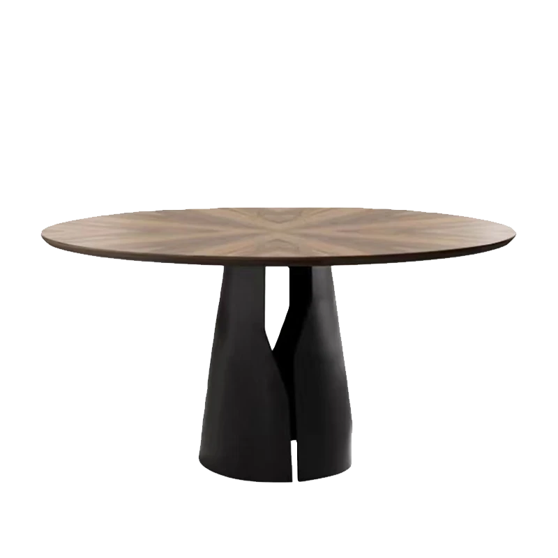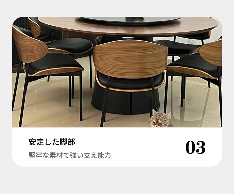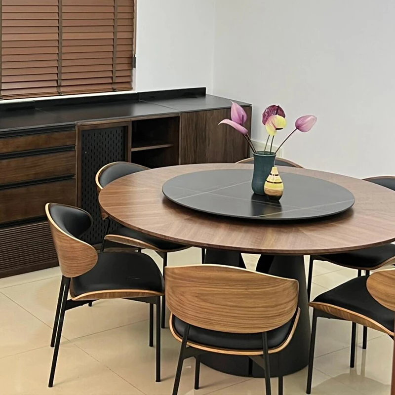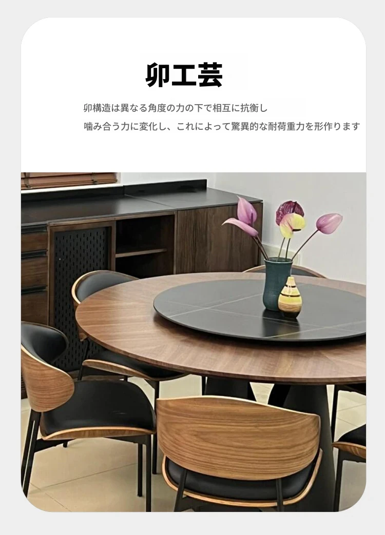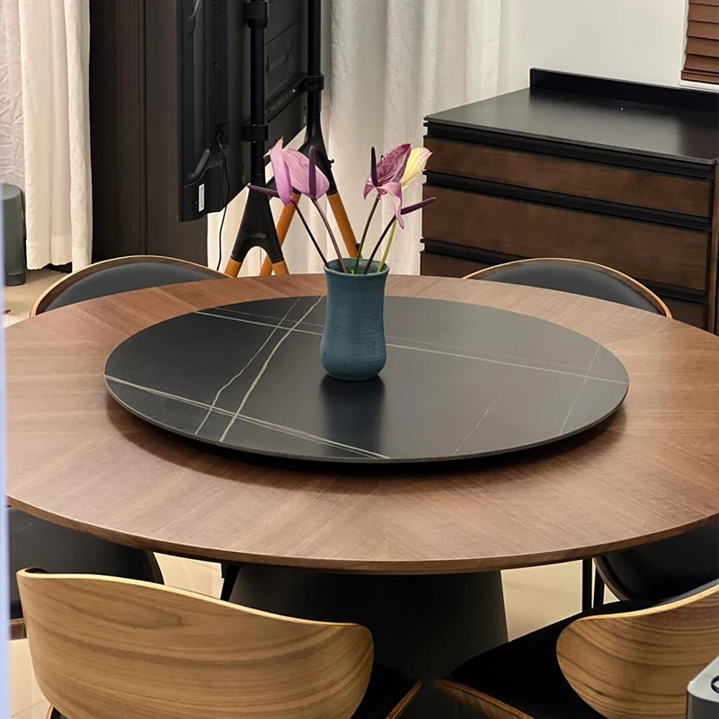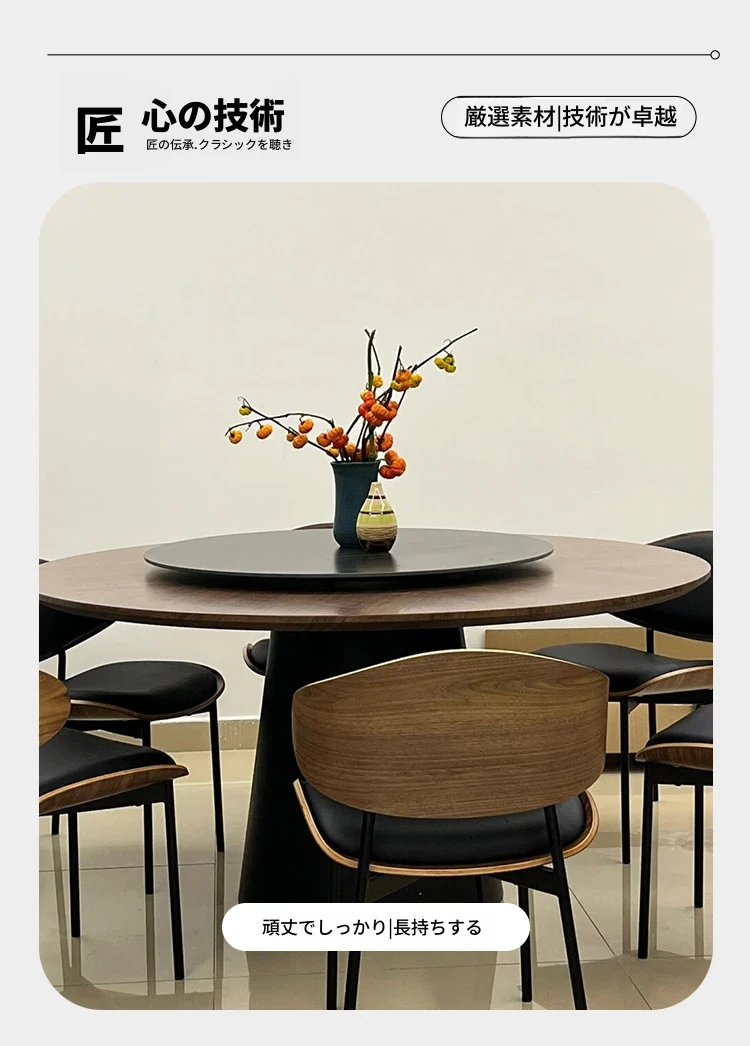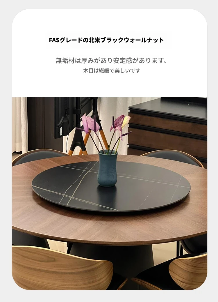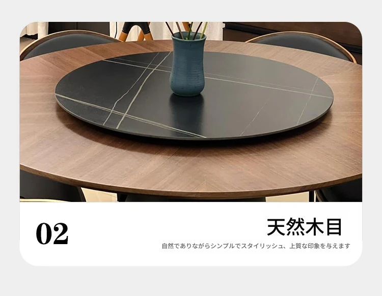 現代的シンプルでラグジュアリーな新中式ウォールナット木製ダイニングテーブル、リビングルームに最適な実木製丸テーブル、岩板回転盤付きで便利!
