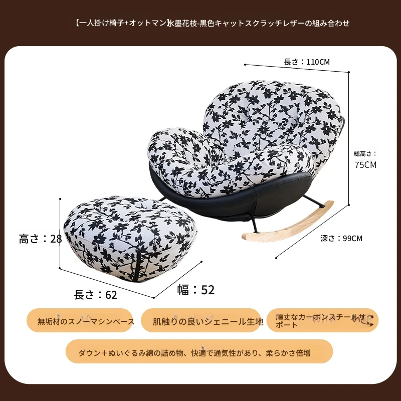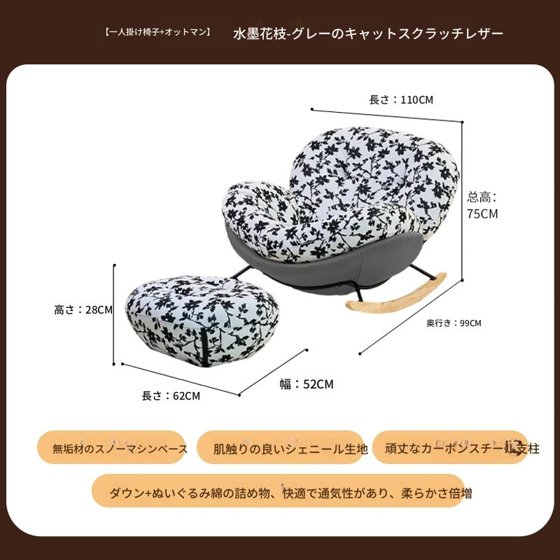 【一人掛け椅子+オットマン】水墨花枝シェニール-ブラックキャットスクラッチレザー(ぬいぐるみ綿+ダウン)