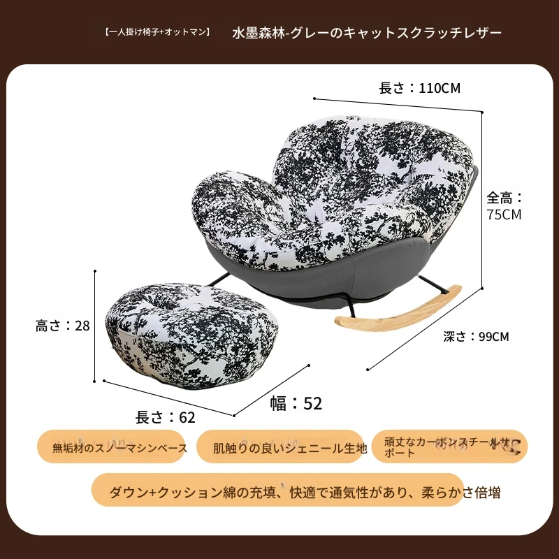 【一人掛け椅子+オットマン】水墨森林シェニール-グレーキャットスクラッチレザー(ぬいぐるみ綿+ダウン)