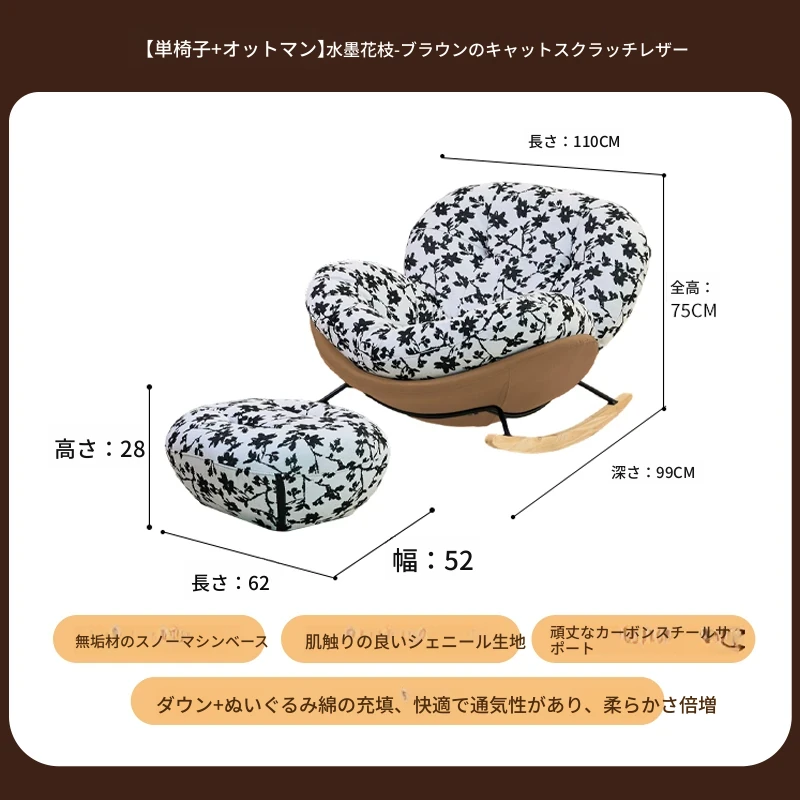 【一人掛け椅子+オットマン】水墨花枝シェニール-ブラウンキャットスクラッチレザー(ぬいぐるみ綿+ダウン)