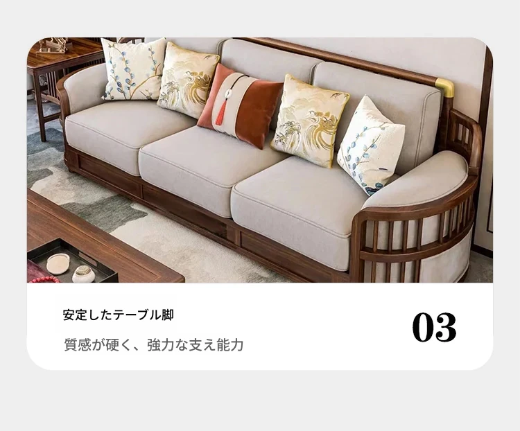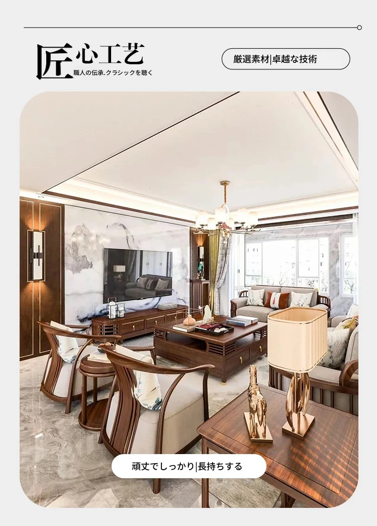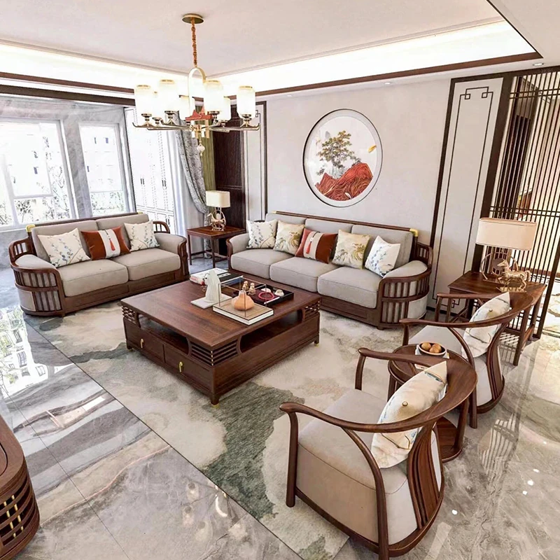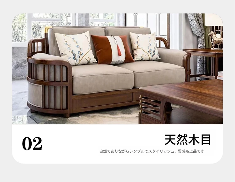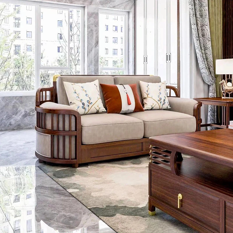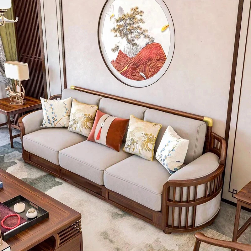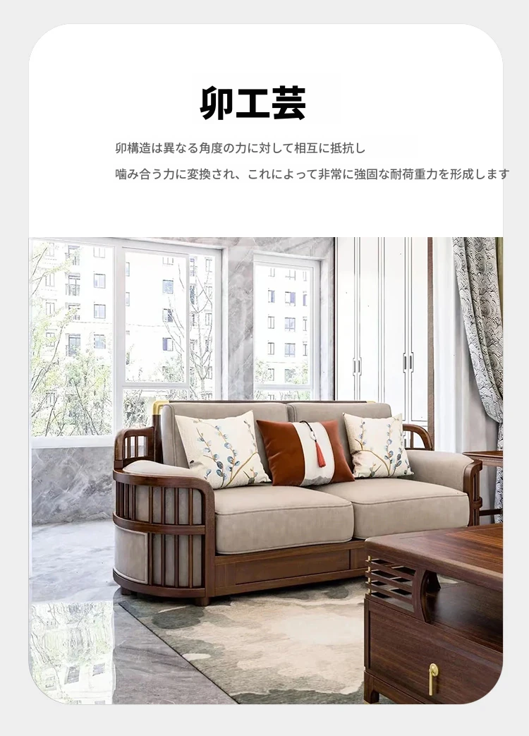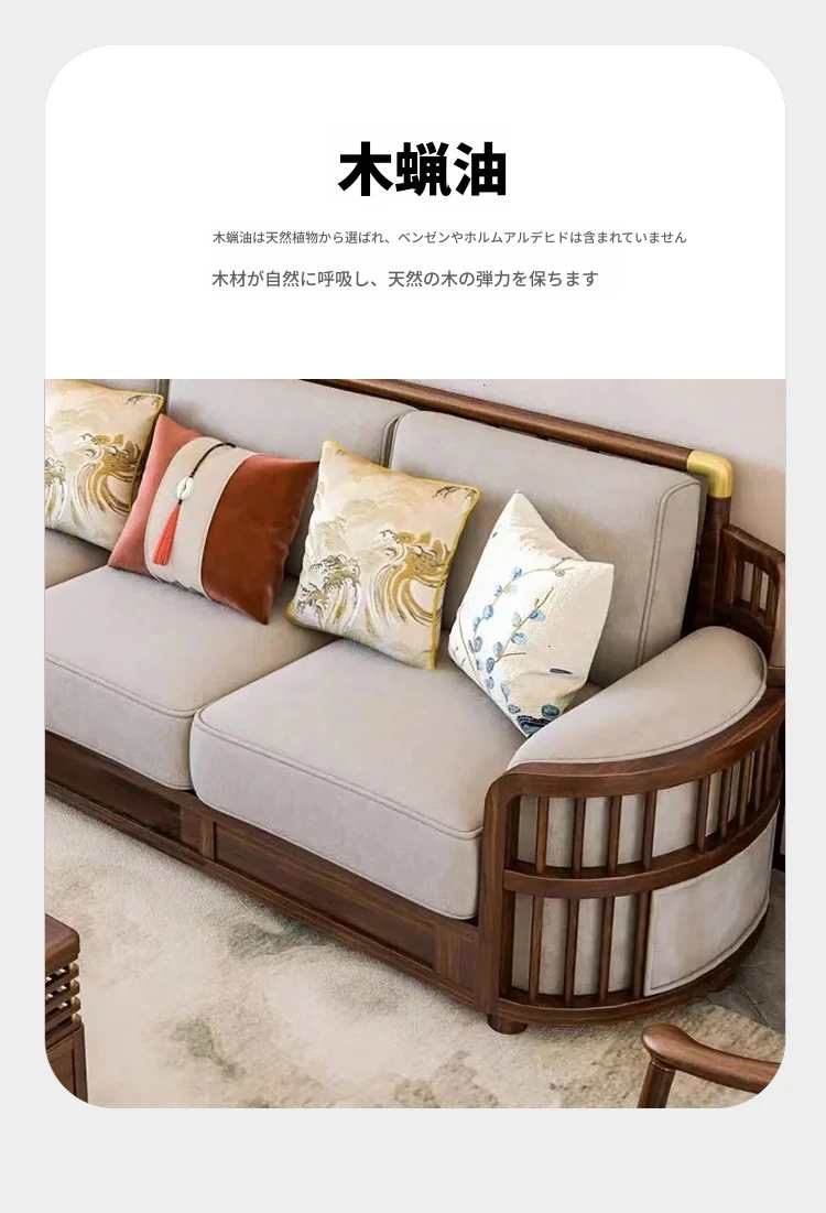 2025年新作!新中式スタイルのリビングソファ - 大型住宅向け、実用的な無垢材と布製のコンビネーション。高級感あふれるウォールナットソファで、ビラやおもてなしにも最適!お部屋を一新する贅沢なアイテムです。