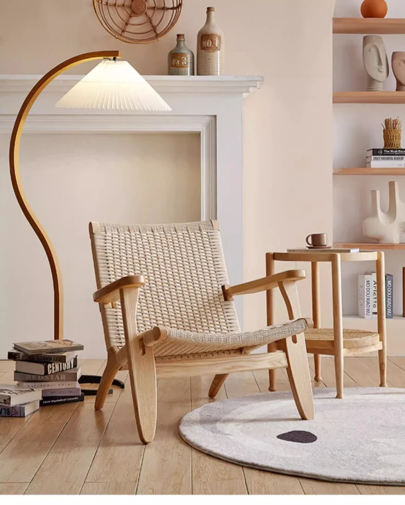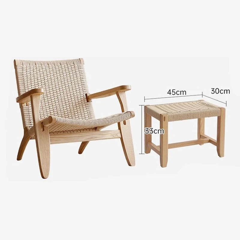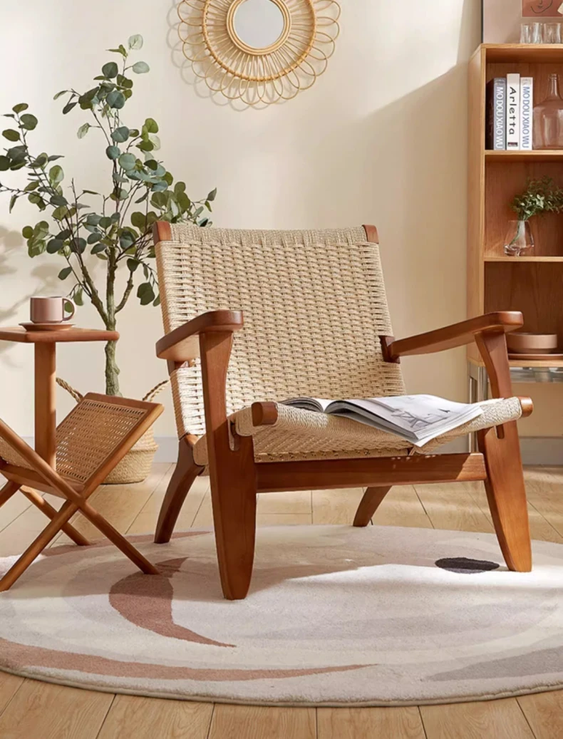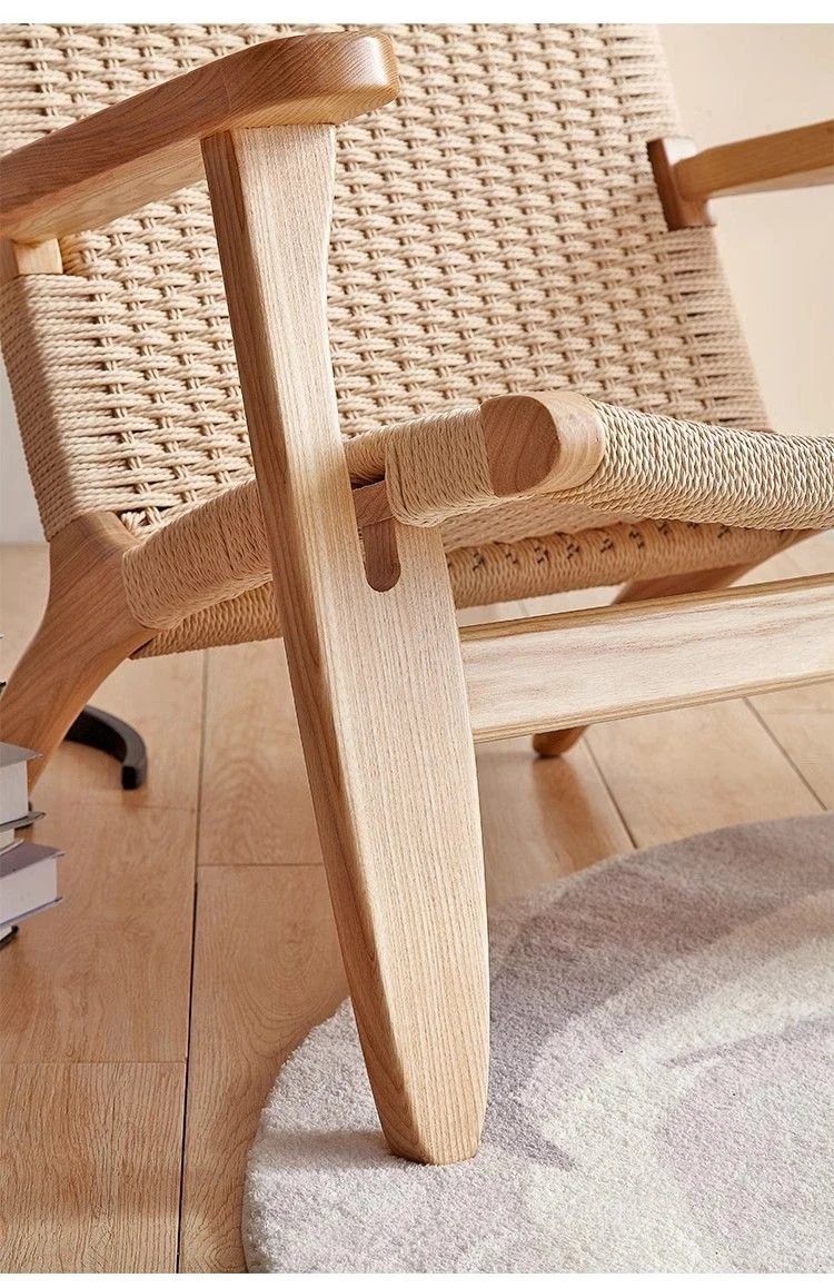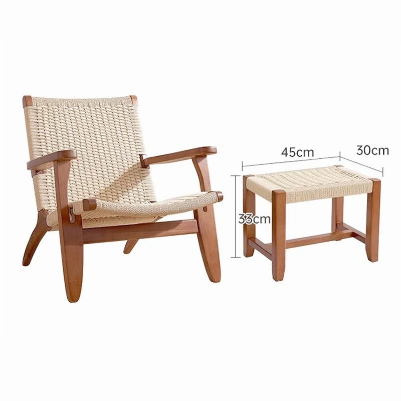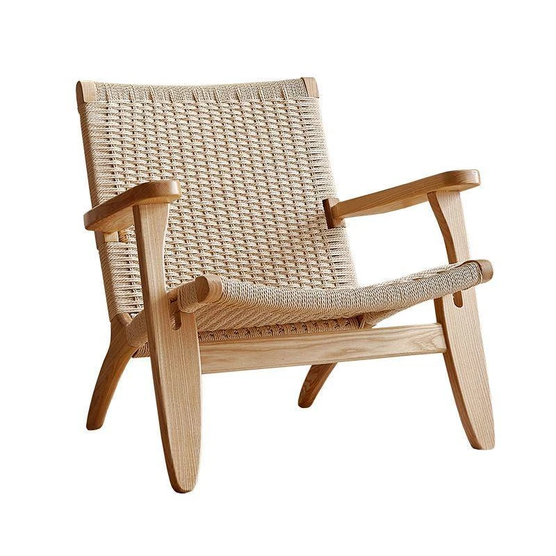 バルコニー用リラックス一人掛けソファチェア - ラウンジに最適な北欧スタイル!実木製のシンプルなデザインで、快適な背もたれとアームレスト付き。宿泊施設やホテルにぴったりな、くつろぎのひとときを提供します!